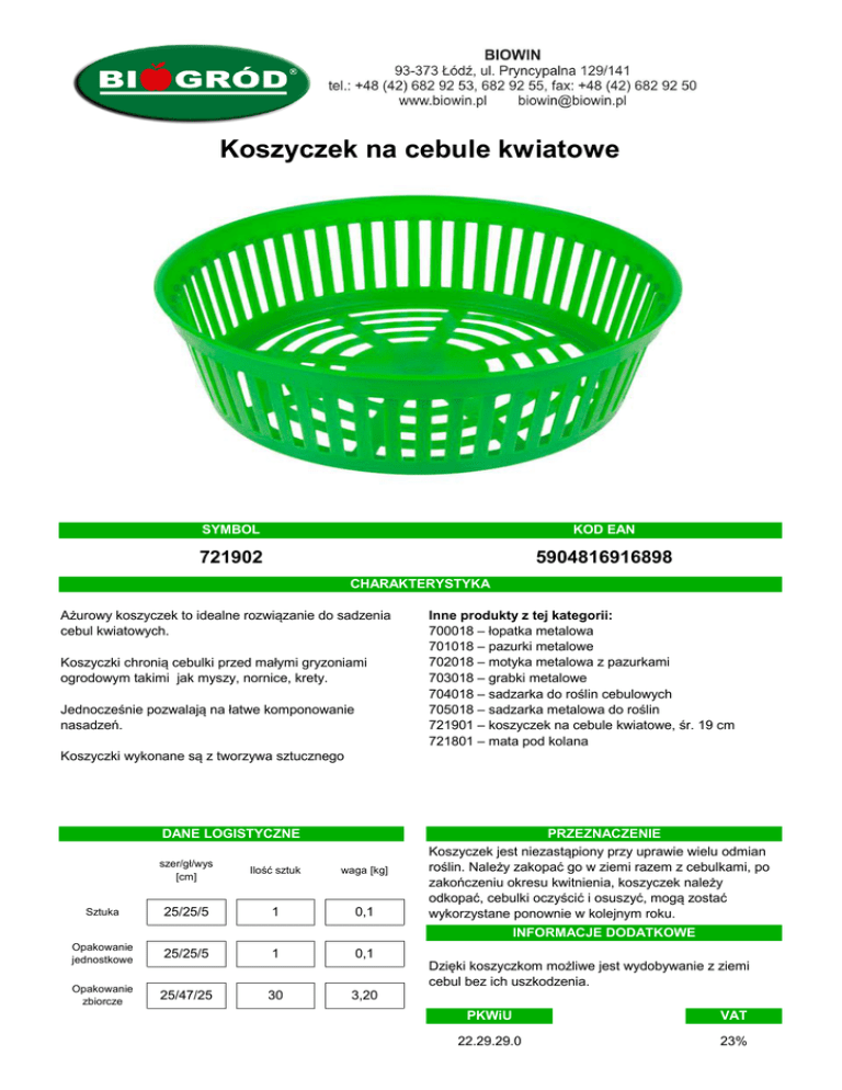 Koszyczek na cebule kwiatowe SYMBOL KOD EAN 721902 5904816916898 CHARAKTERYSTYKA Ażurowy koszyczek to idealne rozwiązanie do sadzenia cebul kwiatowych. Koszyczki chronią cebulki przed małymi gryzoniami ogrodowym takimi jak myszy, nornice, krety. Jednocześnie pozwalają na łatwe komponowanie nasadzeń. Inne produkty z tej kategorii: 700018 – łopatka metalowa 701018 – pazurki metalowe 702018 – motyka metalowa z pazurkami 703018 – grabki metalowe 704018 – sadzarka do roślin cebulowych 705018 – sadzarka metalowa do roślin 721901 – koszyczek na cebule kwiatowe, śr. 19 cm 721801 – mata pod kolana Koszyczki wykonane są z tworzywa sztucznego DANE LOGISTYCZNE Sztuka szer/gł/wys [cm] Ilość sztuk waga [kg] 25/25/5 1 0,1 PRZEZNACZENIE Koszyczek jest niezastąpiony przy uprawie wielu odmian roślin. Należy zakopać go w ziemi razem z cebulkami, po zakończeniu okresu kwitnienia, koszyczek należy odkopać, cebulki oczyścić i osuszyć, mogą zostać wykorzystane ponownie w kolejnym roku. INFORMACJE DODATKOWE Opakowanie jednostkowe 25/25/5 1 0,1 Opakowanie zbiorcze 25/47/25 30 3,20 Dzięki koszyczkom możliwe jest wydobywanie z ziemi cebul bez ich uszkodzenia. PKWiU VAT 22.29.29.0 23%