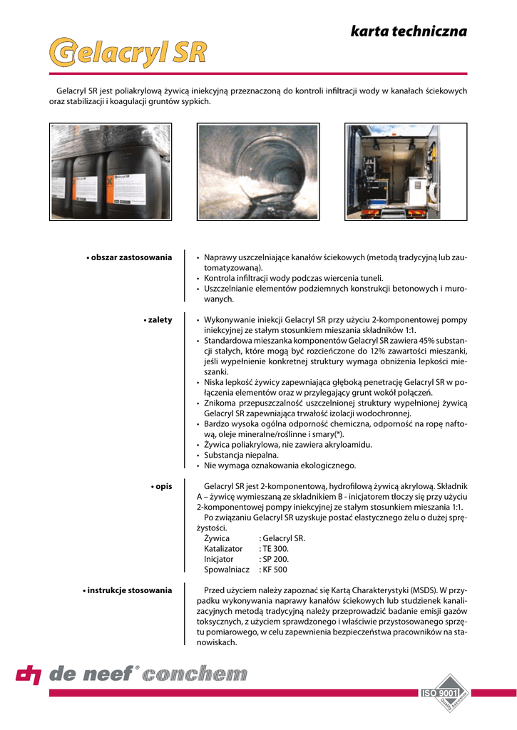 karta techniczna Gelacryl SR jest poliakrylową żywicą iniekcyjną przeznaczoną do kontroli infiltracji wody w kanałach ściekowych oraz stabilizacji i koagulacji gruntów sypkich. • obszar zastosowania • Naprawy uszczelniające kanałów ściekowych (metodą tradycyjną lub zautomatyzowaną). • Kontrola infiltracji wody podczas wiercenia tuneli. • Uszczelnianie elementów podziemnych konstrukcji betonowych i murowanych. • zalety • Wykonywanie iniekcji Gelacryl SR przy użyciu 2-komponentowej pompy iniekcyjnej ze stałym stosunkiem mieszania składników 1:1. • Standardowa mieszanka komponentów Gelacryl SR zawiera 45% substancji stałych, które mogą być rozcieńczone do 12% zawartości mieszanki, jeśli wypełnienie konkretnej struktury wymaga obniżenia lepkości mieszanki. • Niska lepkość żywicy zapewniająca głęboką penetrację Gelacryl SR w połączenia elementów oraz w przylegający grunt wokół połączeń. • Znikoma przepuszczalność uszczelnionej struktury wypełnionej żywicą Gelacryl SR zapewniająca trwałość izolacji wodochronnej. • Bardzo wysoka ogólna odporność chemiczna, odporność na ropę naftową, oleje mineralne/roślinne i smary(*). • Żywica poliakrylowa, nie zawiera akryloamidu. • Substancja niepalna. • Nie wymaga oznakowania ekologicznego. • opis Gelacryl SR jest 2-komponentową, hydrofilową żywicą akrylową. Składnik A – żywicę wymieszaną ze składnikiem B - inicjatorem tłoczy się przy użyciu 2-komponentowej pompy iniekcyjnej ze stałym stosunkiem mieszania 1:1. Po związaniu Gelacryl SR uzyskuje postać elastycznego żelu o dużej sprężystości. Żywica : Gelacryl SR. Katalizator : TE 300. Inicjator : SP 200. Spowalniacz : KF 500 • instrukcje stosowania Przed użyciem należy zapoznać się Kartą Charakterystyki (MSDS). W przypadku wykonywania naprawy kanałów ściekowych lub studzienek kanalizacyjnych metodą tradycyjną należy przeprowadzić badanie emisji gazów toksycznych, z użyciem sprawdzonego i właściwie przystosowanego sprzętu pomiarowego, w celu zapewnienia bezpieczeństwa pracowników na stanowiskach. 1. Komponenty • Składniki żywicy należy przygotować bezpośrednio przed iniekcją. • Stężenie zawartości substancji stałych w mieszance komponentów nie może być niższe niż 12%. Komponent A Komponent B Woda Gelacryl SR TE 300 Woda SP 200 Po przygotowaniu odmierzonych ilości komponenty żywicy tłoczy się w stosunku objętościowym 1:1. 2. Przygotowanie Komponent A • Pierwszy pojemnik (pojemnik A) należy napełnić w połowie odmierzoną ilością wody, równą objętościowo zawartości opakowania Gelacryl SR, następnie dodać żywicę i katalizator TE 300. Dokładnie wymieszać. Komponent B • Drugi pojemnik (pojemnik B) należy napełnić odmierzoną ilością wody, równą objętościowo zawartości pierwszego pojemnika, następnie dodać inicjator SP 200. Dokładnie wymieszać. 3. Typowe czasy żelowania dla mieszanki komponentów • Zmiana ilości TE 300 i SP 200 dodanych do każdego z komponentów pozwala na wydłużenie lub skrócenie czasu obróbki żywicy. Na czas żelowania wpływa również temperatura otoczenia, oraz kontakt z podłożem, wskaźnik pH i rodzaj gruntu. Tabela ilustruje czasy obróbki uzyskiwane przez mieszanie składników według podanych proporcji. Temp.(°C) Pojemnik A Pojemnik B Czas żelowania Gelacryl SR (kg) Woda TE 300 (l) (l) Woda (l) SP 200 (kg) SP 200 (butelki) 5 25 18,5 3,50 40 1,575 3,5 35’’ 5 25 18,5 2,60 40 1,35 3 50’’ 10 25 18,5 2,90 40 1,125 2,5 36’’ 10 25 18,5 2,90 40 0,90 2 52’’ 15 25 18,5 2,30 40 1,125 2,5 36’’ 15 25 18,5 1,50 40 0,9 1,5 78’’ 20 25 18,5 1,90 40 0,675 2 29’’ 20 25 18,5 1,10 40 0,675 1,5 65’’ 25 25 18,5 1,50 40 0,675 1,5 37’’ 25 25 18,5 0,90 40 0,675 1,5 66’’ • W przypadku stosowania na budowach, gdzie wymagany czas żelowania wynosi od 5 do 30 minut, można użyć spowalniacza KF 500. Aby osiągnąć 30 minutowy czas żelowania w temp. 15°C należy użyć 500 ppm KF 500 z 0,5% TE 300 i 0,5% SP 200 wg tabeli poniżej: Waga (%)` Waga (kg) Woda 19 43 Gelacryl SR 30 67,5 TE 300 0,5 1,1 KF 500 0,5 1,1 Woda 49,5 111,2 SP 200 0,5 1,1 Razem 100 225 Pojemnik A Pojemnik B 4. Iniekcja • Do iniekcji należy używać dwutłokowej pompy iniekcyjnej (IP 2C-200-A) ze stałym stosunkiem mieszania składników 1:1 lub specjalnego sprzętu przeznaczonego do zautomatyzowanej iniekcji kanałów ściekowych. Należy stosować się do zaleceń podanych w odpowiednich kartach technicznych. Przed rozpoczęciem uszczelniania zapoznać się z Instrukcją przeprowadzania Iniekcji. • dane techniczne/właściwości Właściwość Wartość Norma Ok. 1,17 ASTM D-1638 Gelacryl SR Gęstość (kg/dm3) Lepkość przy 25°C (mPas) Ok. 20 ASTM D-1638 Substancje stałe Ok. 45% ASTM D-1010 Temperatura wrzenia 93°C Test DNC Rozpuszczalność w wodzie 100% Test DNC Ok. 85% Test DNC Gęstość (kg/dm3) Ok. 1,9 ASTM D-1638 Rozpuszczalność w wodzie Ok. 79% Test DNC Stężenie 10% Test DNC Roztwór Czysta woda z kranu Katalizator TE 300 Stężenie Inicjator SP 200 Spowalniacz KF 500 Mieszanina komponentów na bazie roztworu 12% substancji stałych Lepkość przy 25°C (mPas) Ok. 3 ASTM D-1638 Gęstość (kg/dm ) 1,04 ASTM D-1638 3 Utwardzona żywica na bazie roztworu 12% substancji stałych Rozpuszczalność Nierozpuszczalna w wodzie i pochodnych ropy naftowej Test DNC Zwiększenie objętości w kontakcie z wodą Nieznaczne Test DNC Utrata wilgoci Możliwa utrata wilgoci w środowisku Test DNC suchym. Nie zachodzi przy 100% wilgotności otoczenia. Produkt odporny na działanie bakterii i środków chemicznych powszechnie spotykanych w instalacjach kanalizacyjnych. • wygląd • zużycie • opakowanie Żywica Gelacryl SR: żółty przezroczysty płyn. TE 300 : przezroczysty płyn. SP 200 : biała sól. KF 500 : pomarańczowy płyn. Żywica utwardza się do postaci żelu, elastycznego rów