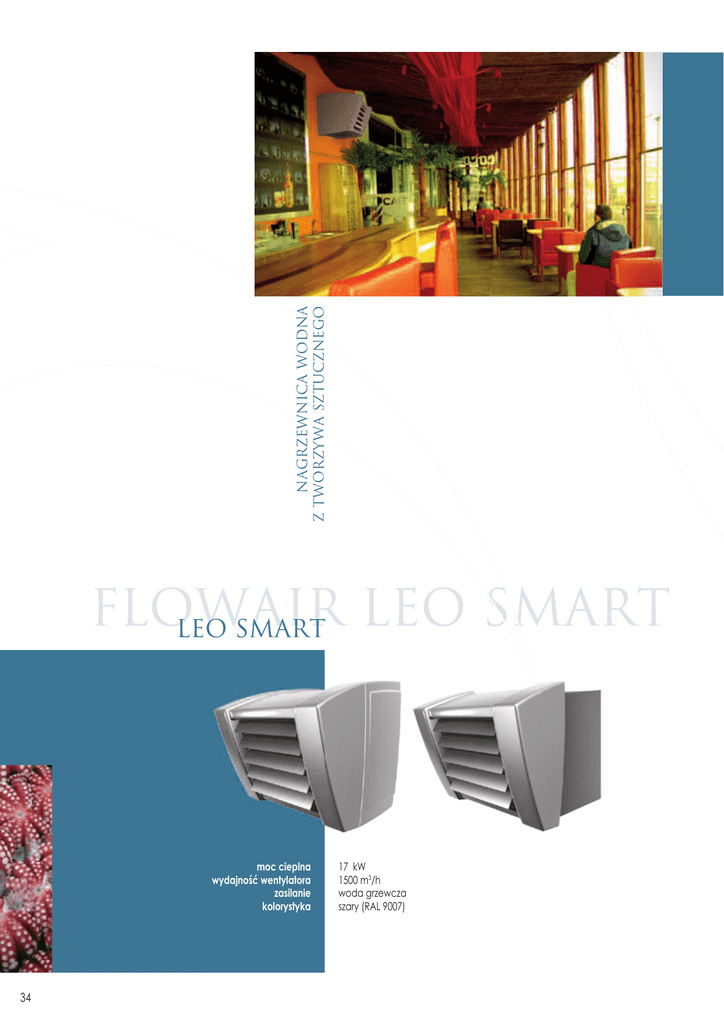NAGRZEWNICA WODNA Z TWORZYWA SZTUCZNEGO SM LEO SMART moc cieplna wydajność wentylatora zasilanie kolorystyka 34 17 kW 1500 m3/h woda grzewcza szary (RAL 9007) OBUDOWA SYSTEMY STEROWANIA ▪ pochylona o kąt 15o w stronę pomieszczenia kieruje strugę ogrzanego powietrza bezpośrednio do strefy przebywania ludzi ▪ elementy obudowy wykonane z antystatycznego tworzywa sztucznego ABS ▪ obudowa w całości zakrywa przyłączeniowe elementy instalacji grzewczej i elektrycznej ▪ LEO SMART P - tył urządzenia wykonany jest z antystatycznego tworzywa sztucznego ABS umożliwiającego zastosowanie filtra powietrza ▪ LEO SMART B - tył nagrzewnicy wykonany jest z perforowanej blachy z alucynku (Al-Zn) ▪ możliwość sterowania standardowymi , dostępnymi elementami automatyki takimi jak: termostat pomieszczeniowy (RA, RD), transformatorowy regulator obrotów (TR,TRd) ▪ przeznaczone 3 układy automatyki: STF - trzybiegowa regulacja wydajności wentylatora za pomocą panelu z wbudowanym termostatem MTF - trzybiegowa regulacja wydajności wentylatora za pomocą panelu z wbudowanym termostatem tygodniowym MTX - bezprzewodowa regulacja wydajności wentylatora za pomocą pilota WENTYLATOR NAWIEWNY KIEROWNICE POWIETRZA ▪ 6-cio polowy wentylator osiowy (960 obr/min) zapewnia cichą pracę urządzenia (zwiększony komfort pracy w małych pomieszczeniach) ▪ Niski pobór mocy elektrycznej (92 W) gwarantuje oszczędność energii ▪ umożliwiają płynną (w poziomie) zmianę kąta wylotu nawiewanego powietrza ▪ wykonane z anodowanego aluminium, stanowią estetyczne wykończenie nagrzewnicy DYSZA KIERUNKOWA WYMIENNIK CIEPŁA ▪ rozprowadza nawiewane powietrze na całą powierzchnię wymiennika ▪ zmniejsza poziom głośności pracy wentylatora oraz opory przepływu powietrza ▪ moc 17 kW dostosowana do pomieszczeń o małych i średnich kubaturach ▪ miedziane rurki z nałożonymi aluminiowymi lamelami zapewniają wysoki współczynnik przewodzenia ciepła ▪ króćce przyłączeniowe ½” wyprowadzone na tył urządzenia pozwalają na całkowite ukrycie instalacji grzewczej pod obudową ZASADA DZIAŁANIA Aparaty grzewcze LEO SMART zasilane są wodą grzewczą, która przepływając przez miedziane rurki, o odpowiedniej geometrii, oddaje ciepło. W celu zwiększenia powierzchni wymiany ciepła, na rurki nałożone zostały, w niewielkich odległościach między sobą, aluminiowe lamele. Są one, nagrzewane przez miedziane rurki, które przekazują ciepło strumieniowi nadmuchiwanego powietrza. Dzięki zastosowaniu materiałów o wysokim współczynniku przewodzenia ciepła oraz dzięki turbulentnemu przepływowi wody grzewczej, możliwy jest bardzo wysoki odbiór ciepła od czynnika grzewczego. Konstrukcja wymiennika ciepła, w połączeniu z odpowiednim kształtem konsoli montażowej, umożliwia ponadto kierowanie ogrzanego powietrza bezpośrednio do strefy przebywania ludzi. Ręcznie sterowane kierownice powietrza, zamontowane na wylocie z aparatu grzewczego, pozwalają na dodatkową regulację strumienia powietrza. WERSJE LEO SMART Nagrzewnica wodna LEO SMART dostępna jest w dwóch wersjach. Ich częścią wspólną jest przedni panel wykonany z tworzywa sztucznego ABS. Elementem różniącym te dwa rozwiązania jest tył urządzenia, który zasłania konsolę montażową oraz wyprowadzoną do tyłu instalację grzewczą, wraz ze wszystkimi jej elementami. Tylna część obudowy może być wykonana z tworzywa sztucznego – LEO SMART P, stanowi ona wtedy stylistyczną całość z przednią częścią urządzenia. Istnieje także druga wersja – LEO SMART B, w której obudowę wykonano z perforowanej blachy z „alucynku” (AL-Zn). Obie te wersje są bardzo nowoczesne i estetyczne. W zależności od rodzaju pomieszczenia (jego przeznaczenia i wyglądu), możliwy jest wybór najbardziej odpowiedniej z przedstawionych tu wersji. ZASTOSOWANIE Nowoczesny wygląd nadmuchowych nagrzewnic wodnych LEO SMART pozwala na zastosowanie ich w pomieszczeniach reprezentacyjnych. Dlatego nagrzewnice te doskonale nadają się do takich obiektów jak: • puby, restauracje, dyskoteki • salony samochodowe • sale wystawowe • sklepy (średniej wielkości) • salony meblowe 35 MONTAŻ DANE TECHNICZNE LEO SMART przepływ powietrza Vp = 1500 m3/h Tps1 Pt Qw Δpw Tps2 °C kW l/h kPa °C Tw1 / Tw2 = 90 / 70 OC -20 23,8 1052 8,3 20,7 -15 22,3 986 7,3 24,0 -10 20,9 922 6,8 27,1 -5 19,4 858 5,7 30,2 0 17,3 800 5,0 33,2 5 16,6 735 4,3 36,2 10 15,3 675 3,7 39,2 15 14,0 616 3,1 42,1 20 12,6 558 2,6 45,0 Konsola montażowa Do zamontowania nagrzewnicy należy użyć, dołączonej do kompletu, konsoli montażowej. Pozwala ona na podłączenie urządzenia równolegle do ściany. Przed skręceniem nagrzewnicy z zawiesiem, należy zmontować ze sobą wszystkie elementy konsoli. Zestaw zawiera wszystkie potrzebne śruby i nakrętki do prawidłowego montażu. min. 400 Tw1 / Tw2 = 80 / 60 OC -20 21,1 926 6,7 16,1 -15 19,6 862 5,9 19,2 -10 18,2 800 5,1 22,3 -5 16,8 737 4,4 25,3 0 15,4 676 3,8 28,3 5 14,0 616 3,2 31,3 10 12,7 557 2,6 34,2 15 11,3 500 2,2 37,1 20 10,0 445 1,7 39,8 min. 400 Tw1 / Tw2 = 70 / 50 OC max. 3000 -20 18,3 800 5,3 11,3 -15 16,8 737 4,6 14,4 -10 15,5 675 3,9 17,4 -5 14,0 614 3,3 20,4 0 12,7 555 2,7 23,4 5 11,3 496 2,2 26,2 10 10,0 440 1,7 31,1 15 8,7 380 1,3 31,9 20 7,4 323 1,0 34,6 Zasięg strumienia powietrza: 8,5 m* Poziom cisnienia akustycznego: 45 dB(A)** WYMIARY DANE ELEKTRYCZNE Pobór prądu Pobór mocy IP Klasa izolacji 230V / 50Hz 0,4 A 92 W 54 F 356 539 Zasilanie 691 583 596 Masa urządzenia z konsolą 23 kg Masa urządzenia z konsolą i napełnionego wodą 25 kg 516 Zasięg strumieni powietrza podano dla aparatów pracujących w pozycji pionowej (zamontowanych na ścianie), przy prędkości granicznej 0,5 m/s i temperaturze powietrza 20 ºC. ** Poziomy ciśnienia akustycznego w odległości 5 m od urządzenia. Przy zredukowanych prędkościach obrotowych wentylatora hałas jest odp