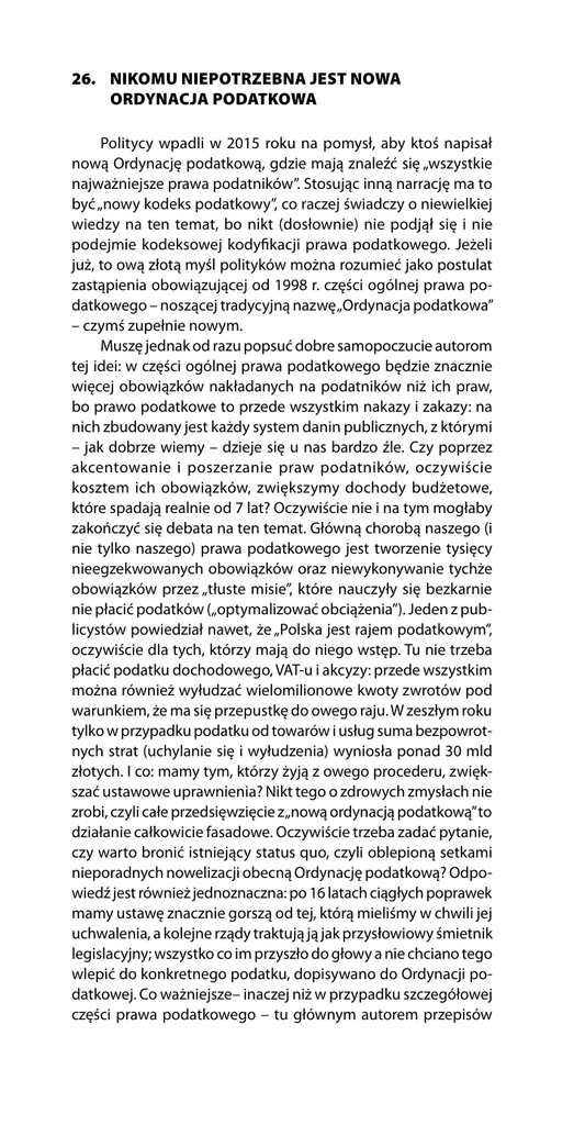 26. Nikomu niepotrzebna jest nowa Ordynacja podatkowa Politycy wpadli w 2015 roku na pomysł, aby ktoś napisał nową Ordynację podatkową, gdzie mają znaleźć się „wszystkie najważniejsze prawa podatników”. Stosując inną narrację ma to być „nowy kodeks podatkowy”, co raczej świadczy o niewielkiej wiedzy na ten temat, bo nikt (dosłownie) nie podjął się i nie podejmie kodeksowej kodyfikacji prawa podatkowego. Jeżeli już, to ową złotą myśl polityków można rozumieć jako postulat zastąpienia obowiązującej od 1998 r. części ogólnej prawa podatkowego – noszącej tradycyjną nazwę „Ordynacja podatkowa” – czymś zupełnie nowym. Muszę jednak od razu popsuć dobre samopoczucie autorom tej idei: w części ogólnej prawa podatkowego będzie znacznie więcej obowiązków nakładanych na podatników niż ich praw, bo prawo podatkowe to przede wszystkim nakazy i zakazy: na nich zbudowany jest każdy system danin publicznych, z którymi – jak dobrze wiemy – dzieje się u nas bardzo źle. Czy poprzez akcentowanie i poszerzanie praw podatników, oczywiście kosztem ich obowiązków, zwiększymy dochody budżetowe, które spadają realnie od 7 lat? Oczywiście nie i na tym mogłaby zakończyć się debata na ten temat. Główną chorobą naszego (i nie tylko naszego) prawa podatkowego jest tworzenie tysięcy nieegzekwowanych obowiązków oraz niewykonywanie tychże obowiązków przez „tłuste misie”, które nauczyły się bezkarnie nie płacić podatków („optymalizować obciążenia”). Jeden z publicystów powiedział nawet, że „Polska jest rajem podatkowym”, oczywiście dla tych, którzy mają do niego wstęp. Tu nie trzeba płacić podatku dochodowego, VAT-u i akcyzy: przede wszystkim można również wyłudzać wielomilionowe kwoty zwrotów pod warunkiem, że ma się przepustkę do owego raju. W zeszłym roku tylko w przypadku podatku od towarów i usług suma bezpowrotnych strat (uchylanie się i wyłudzenia) wyniosła ponad 30 mld złotych. I co: mamy tym, którzy żyją z owego procederu, zwiększać ustawowe uprawnienia? Nikt tego o zdrowych zmysłach nie zrobi, czyli całe przedsięwzięcie z „nową ordynacją podatkową” to działanie całkowicie fasadowe. Oczywiście trzeba zadać pytanie, czy warto bronić istniejący status quo, czyli oblepioną setkami nieporadnych nowelizacji obecną Ordynację podatkową? Odpowiedź jest również jednoznaczna: po 16 latach ciągłych poprawek mamy ustawę znacznie gorszą od tej, którą mieliśmy w chwili jej uchwalenia, a kolejne rządy traktują ją jak przysłowiowy śmietnik legislacyjny; wszystko co im przyszło do głowy a nie chciano tego wlepić do konkretnego podatku, dopisywano do Ordynacji podatkowej. Co ważniejsze– inaczej niż w przypadku szczegółowej części prawa podatkowego – tu głównym autorem przepisów była rządowa biurokracja, choć niektóre, zresztą wyjątkowo nieudane regulacje, napisał biznes doradczy (np. obecny kształt interpretacji urzędowych). Mieliśmy tu bowiem (i mamy) do czynienia ze swoistą dychotomią: przepisy dotyczące poszczególnych podatków tworzą faktycznie lobbyści reprezentujący tych, których one dotyczą oraz biznes podatkowy, który chce na nich zarabiać („prywatyzacja prawa podatkowego”), co w oczywisty sposób osłabia efektywność fiskalną systemu podatkowego, pogłębiająca się restrykcyjność przepisów części ogólnej, które jako jedyne pozostają jeszcze pod wpływem ministerialnych urzędników wiąże się właśnie z degradacją legislacyjną panującą w materialnym prawie podatkowym (części szczególnej), tworzonej pod dyktando lobbystów. Powyższy proces był (i jest) czymś zupełnie naturalnym, bo ktoś, kto chce jeszcze dbać o interes publiczny w toku tworzenia przepisów prawa podatkowego nie ma szansy dopchać się do przysłowiowego stołu, bo tam szeroko rozsiedli się ci, którzy nie bardzo chcą płacić podatki. Tak właśnie powstają „przepisy korzystne dla podatników” i nie bez powodu współczesny patologiczny stan ma tak dobrą prasę. Jeżeli np. urzędujący wiceminister finansów od spraw podatków biesiaduje z biznesmenam optymalizacyjnym wybierając w dodatku „podatnika roku” i nikt w mediach nie traktuje tego jako skandal, to jaka jest kondycja naszej demokracji? Ktoś niedawno nazwał obecny ustrój „bezimienną oligarchią” w odróżnieniu od ustroju oligarchicznego panującego w Rosji, w której jest bardzo zły, oraz na Ukrainie, w której jest bardzo dobry, bo „prozachodni”. Czy w wyniku prac nad nową Ordynacją powstaną przepisy lepsze od tych, które w pocie czoła doklejano do tej ustawy przez 16 lat? To mało prawdopodobne, bo właśnie istniejąca ustawa świadczy o stanie wiedzy oraz dorobku myśli na ten temat. W czasie organizowanego na Uniwersytecie Warszawskim seminarium na temat nowej Ordynacji podatkowej większość (wszyscy?) dyskutanci reprezentujący zresztą różne ośrodki akademickie, opowiedzieli się przeciw pisaniu wszystkiego od nowa, bo wiele nowego się nie wymyśli, a na powtarzanie tego co jest, szkoda czasu i pieniędzy. Czy chcąc naprawić – a jest to konieczne – obecne prawo podatkowe należy zacząć od Ordynacji podatkowej? Oczywiście nie. Wręcz odwrotnie: należy zacząć od … prawa karnego. Dziś najważniejszą patologią systemu podatkowego są fałszywi podatnicy, czyli bal przebierańców. Tworzy się dziesiątki tysięcy „podmiotów optymalizacyjnych”, które strojąc się w piórka podatników działają quasi legalnie lub udają legalizm w celu obniżenia zobowiązań podatkowych i wyłudzania zwrotów przez rzeczywistych podatników. Tu króluje cały międzynarodowy biznes doradczy, oferujący tego rodzaju usługi. Jest to działalność w zasadzie bezkarna, a owi przebierańcy korzystają z wszystkich praw podatników w tym również na gruncie Kodeksu Karnego Skarbowego, czyli chronimy o