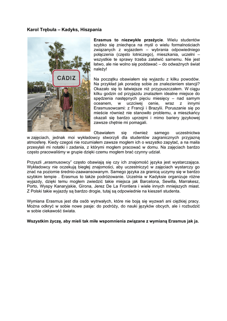 Karol Trębuła – Kadyks, Hiszpania Erasmus to niezwykłe przeżycie. Wielu studentów szybko się zniechęca na myśl o wielu formalnościach związanych z wyjazdem – wybrania odpowiedniego połączenia (często lotniczego), mieszkania, uczelni – wszystkie te sprawy trzeba załatwić samemu. Nie jest łatwo, ale nie wolno się poddawać – do odważnych świat należy! Na początku obawiałem się wyjazdu z kilku powodów. Na przykład jak poradzę sobie ze znalezieniem stancji? Okazało się to łatwiejsze niż przypuszczałem. W ciągu kilku godzin od przyjazdu znalazłem idealne miejsce do spędzenia następnych pięciu miesięcy – nad samym oceanem, w uczciwej cenie, wraz z innymi Erasmusowcami: z Francji i Brazylii. Poruszanie się po mieście również nie stanowiło problemu, a mieszkańcy okazali się bardzo uprzejmi i mimo bariery językowej zawsze chętnie mi pomagali. Obawiałem się również samego uczestnictwa w zajęciach, jednak moi wykładowcy stworzyli dla studentów zagranicznych przyjazną atmosferę. Kiedy czegoś nie rozumiałem zawsze mogłem ich o wszystko zapytać, a na maila przesyłali mi notatki i zadania, z którymi mogłem pracować w domu. Na zajęciach bardzo często pracowaliśmy w grupie dzięki czemu mogłem brać czynny udział. Przyszli „erasmusowcy” często obawiają się czy ich znajomość języka jest wystarczająca. Wykładowcy nie oczekują biegłej znajomości, aby uczestniczyć w zajęciach wystarczy go znać na poziomie średnio-zaawansowanym. Samego języka za granicą uczymy się w bardzo szybkim tempie . Erasmus to także podróżowanie. Uczelnia w Kadyksie organizuje różne wyjazdy, dzięki temu mogłem zwiedzić takie miejsca jak Barcelona, Sewilla, Marrakesz, Porto, Wyspy Kanaryjskie, Girona, Jerez De La Frontiera i wiele innych mniejszych miast. Z Polski takie wyjazdy są bardzo drogie, tutaj są odpowiednie na kieszeń studenta. Wymiana Erasmus jest dla osób wytrwałych, które nie boją się wyzwań ani ciężkiej pracy. Można odkryć w sobie nowe pasje: do podróży, do nauki języków obcych, ale i rozbudzić w sobie ciekawość świata. Wszystkim życzę, aby mieli tak miłe wspomnienia związane z wymianą Erasmus jak ja.
