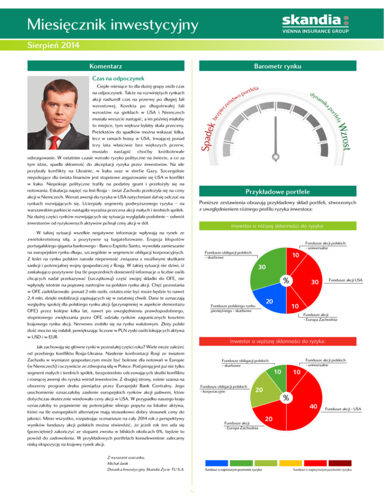Miesięcznik inwestycyjny Sierpień 2014 Komentarz Barometr rynku Czas na odpoczynek dyn am ik st Wzro Spadek fela o rt bez pie cz eń tfela por o stw ap Ciepłe miesiące to dla dużej grupy osób czas na odpoczynek. Także na rozwiniętych rynkach akcji nadszedł czas na przerwę po długiej fali wzrostowej. Korekta po długotrwałej fali wzrostów na giełdach w USA i Niemczech musiała wreszcie nastąpić, a im później miałoby to miejsce, tym większa byłaby skala przeceny. Pretekstów do spadków można wskazać kilka, lecz w ramach hossy w USA, trwającej ponad trzy lata właściwie bez większych przerw, musiało nastąpić choćby krótkotrwałe odreagowanie. W ostatnim czasie wzrosło ryzyko polityczne na świecie, a co za tym idzie, spadła skłonność do akceptacji ryzyka przez inwestorów. Na sile przybrały konflikty na Ukrainie, w Iraku oraz w strefie Gazy. Szczególnie niepokojące dla świata finansów jest stopniowe angażowanie się USA w konflikt w Iraku. Niepokoje polityczne trafiły na podatny grunt i przełożyły się na notowania. Eskalacja napięć na linii Rosja – świat Zachodu przełożyła się na ceny akcji w Niemczech. Wzrost awersji do ryzyka w USA natychmiast dał się odczuć na rynkach rozwijających się. Ucierpiały segmenty podwyższonego ryzyka – na warszawskim parkiecie nastąpiła wyraźna przecena akcji małych i średnich spółek. Na dużej części rynków rozwijających się sytuacja wyglądała podobnie – odwrót inwestorów od ryzykownych aktywów pchnął ceny akcji w dół. 1 Przykładowe portfele Poniższe zestawienia obrazują przykładowy skład portfeli, stworzonych z uwzględnieniem różnego profilu ryzyka inwestora: Inwestor o ni˝szej skłonnoÊci do ryzyka: W takiej sytuacji wszelkie negatywne informacje wpływają na rynek ze zwielokrotnioną siłą, a pozytywne są bagatelizowane. Erupcja kłopotów portugalskiego giganta bankowego - Banco Espirito Santo, wywołała zamieszanie na europejskim rynku długu, szczególnie w segmencie obligacji korporacyjnych. Z kolei na rynku polskim narosła niepewność związana z możliwymi skutkami sankcji i potencjalnej wojny gospodarczej z Rosją. W takiej sytuacji nie dziwi, iż zaskakująco pozytywne (na tle poprzednich doniesień) informacje o liczbie osób chcących nadal przekazywać (szczątkową) część swojej składki do OFE, nie wpłynęły istotnie na poprawę nastrojów na polskim rynku akcji. Chęć pozostania w OFE zadeklarowało ponad 2 mln osób, ostatecznie być może będzie to nawet 2.4 mln, dzięki mobilizacji zapisujących się w ostatniej chwili. Dane te oznaczają względny spokój dla polskiego rynku akcji (przynajmniej w aspekcie demontażu OFE) przez kolejne kilka lat, nawet po uwzględnieniu prawdopodobnego, stopniowego zwiększania przez OFE udziału rynków zagranicznych kosztem krajowego rynku akcji. Nerwowo zrobiło się na rynku walutowym. Złoty polski dość mocno się osłabił, powiększając liczone w PLN zyski osób lokujących aktywa w USD i w EUR. Fundusze akcji polskich - uniwersalne Fundusze obligacji polskich - skarbowe 10 30 % 20 Fundusze polskiego rynku pieniężnego - skarbowe 30 Fundusze akcji USA 10 Fundusze akcji - Europa Zachodnia Inwestor o wy˝szej skłonnoÊci do ryzyka: Jak zachowają się główne rynki w pozostałej części roku? Wiele może zależeć od przebiegu konfliktu Rosja-Ukraina. Nasilenie konfrontacji Rosji ze światem Zachodu w wymiarze gospodarczym może być bolesne dla notowań w Europie (w Niemczech) i oczywiście ze zdwojoną siłą w Polsce. Pod presją jest już nie tylko segment małych i średnich spółek, bezpośrednio odczuwających skutki konfliktu i rosnącej awersji do ryzyka wśród inwestorów. Z drugiej strony, rośnie szansa na obszerny program druku pieniądza przez Europejski Bank Centralny. Jego uruchomienie oznaczałoby zasilenie europejskich rynków akcji paliwem, które dotychczas skutecznie windowało ceny akcji w USA. W przypadku naszego kraju oznaczałoby to pojawienie się potencjalnie silnego popytu na lokalne aktywa, które na tle europejskich alternatyw mają stosunkowo dobry stosunek ceny do jakości. Mimo wszystko, rozpatrując scenariusze na cały 2014 rok z perspektywy wyników funduszy akcji polskich można stwierdzić, że jeżeli rok ten uda się (przeciętnie) zakończyć ze stopami zwrotu w bliskich okolicach 0%, będzie to powód do zadowolenia. W przykładowych portfelach konsekwentnie zalecamy niską ekspozycję na krajowy rynek akcji. Fundusze akcji polskich - uniwersalne Fundusze obligacji polskich - skarbowe 10 Fundusze obligacji polskich - korporacyjne 10 20 % Fundusze akcji - Europa Zachodnia Z wyrazami szacunku, Michał Janik Doradca Inwestycyjny Skandia Życie TU S.A. fundusz o najniższym poziomie ryzyka -1- 40 Fundusze akcji - USA 20 fundusz o najwyższym poziomie ryzyka Miesięcznik inwestycyjny Sierpień 2014 Wyniki funduszy Fundusze polskiego rynku pieni´˝nego - korporacyjne i pozostałe Legg Mason Pieni´˝ny FIO KAHA4 PLN 0,25% Noble Funds FIO Subfundusz Noble Fund Pieni´˝ny NB2 PLN 0,25% Optimum Fundusz Inwestycyjny Otwarty subfundusz Gotówkowy OPT1 PLN 0,20% Pioneer FIO Subfundusz Pioneer Pieni´˝ny PIO6 PLN 0,18% Skarbiec FIO Subfundusz Pieni´˝ny Skarbiec-Kasa SKAR4 PLN 0,24% UniFundusze FIO Subfundusz UniKorona Pieni´˝ny UNK4 PLN 0,35% UniFundusze SFIO Subfundusz UniWIBID UNK5 PLN 0,27% Fundusze dost´pne w aktualnej ofercie Skandii w sierpniu* Stopa zwrotu Ubezpieczeniowy Fundusz Kapitałowy Skandia 1m Kod Waluta w walucie w PLN wewn. 3m 12 m w PLN w PLN 0,25% 0,25% 0,20% 0,18% 0,24% 0,35% 0,27% 0,84% 1,04% 0,69% 0,62% 0,66% 1,38% 0,83% 2,62% 2,59% b.d. 2,32% 2,36% 4,74% 3,56% I, Fundusze akcji krajów rozwijajàcych si´ Fundusze akcji polskich – du˝ych spółek Investor Akcji Du˝ych Spółek Skarbiec FIO Subfundusz Akcji Skarbiec-Akcja VII, Fundusze obligacji DWS3 PLN SKAR3 PLN -4,36% -4,46% -4,36% -4,46% -4,49% -6,86% 1,35% -3,90% Fu