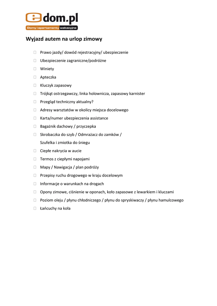 Wyjazd autem na urlop zimowy Prawo jazdy/ dowód rejestracyjny/ ubezpieczenie Ubezpieczenie zagraniczne/podróżne Winiety Apteczka Kluczyk zapasowy Trójkąt ostrzegawczy, linka holownicza, zapasowy karnister Przegląd techniczny aktualny? Adresy warsztatów w okolicy miejsca docelowego Karta/numer ubezpieczenia assistance Bagażnik dachowy / przyczepka Skrobaczka do szyb / Odmrażacz do zamków / Szufelka i zmiotka do śniegu Ciepłe nakrycia w aucie Termos z ciepłymi napojami Mapy / Nawigacja / plan podróży Przepisy ruchu drogowego w kraju docelowym Informacje o warunkach na drogach Opony zimowe, ciśnienie w oponach, koło zapasowe z lewarkiem i kluczami Poziom oleju / płynu chłodniczego / płynu do spryskiwaczy / płynu hamulcowego Łańcuchy na koła