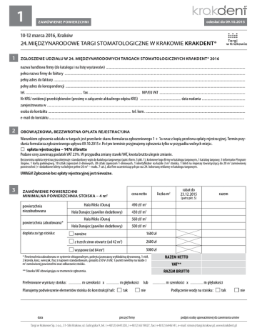 1 odesłać do 09.10.2015 ZAMÓWIENIE POWIERZCHNI 10-12 marca 2016, Kraków 24. MIĘDZYNARODOWE TARGI STOMATOLOGICZNE W KRAKOWIE KRAKDENT® 1 ZGŁOSZENIE UDZIAŁU W 24. MIĘDZYNARODOWYCH TARGACH STOMATOLOGICZNYCH KRAKDENT® 2016 nazwa handlowa firmy (do katalogu i na listę wystawców) ........................................................................................................................................................ pełna nazwa firmy do faktury ..................................................................................................................................................................................................... pełny adres do faktury ................................................................................................................................................................................................................. pełny adres do korespondencji .................................................................................................................................................................................................... tel. .............................................................. fax ......................................................... NIP/EU VAT .............................................................................................. Nr KRS/ ewidencji przedsiębiorców (prosimy o załączenie aktualnego odpisu KRS) ............................................. data nadania ................................................ zarejestrowana w ....................................................................................................................................................................................................................... osoba do kontaktu........................................................................................... tel. kom. ............................................................................................................. e-mail do kontaktu .................................................................................................................................................................................................................... 2 OBOWIĄZKOWA, BEZZWROTNA OPŁATA REJESTRACYJNA Warunkiem zgłoszenia udziału w targach jest przesłanie skanu formularza zgłoszeniowego 1 + 1a wraz z kopią przelewu opłaty rejestracyjnej. Termin przysłania formularza zgłoszeniowego upływa 09.10.2015 r. Po tym terminie przyjmujemy zgłoszenia tylko w przypadku wolnych miejsc. ££ opłata rejestracyjna – 1476 zł brutto Podane ceny zawierają podatek VAT 23%. W przypadku zmiany stawki VAT, kwota brutto ulegnie zmianie. Bezzwrotna opłata rejestracyjna obejmuje: standardowy wpis do katalogu targowego (patrz form. 5 pkt. 1), kolorowe logo firmy w katalogu targowym, 1 katalog targowy, 1 informator Program Targów, 1 kartę parkingową, 10 sztuk zaproszeń 3-dniowych, 30 sztuk zaproszeń 1-dniowych, 1 identyfikator na każde 3 m2 stoiska, 1 bilet na imprezę towarzyszącą do 20 m2 zamówionej powierzchni (+ dodatkowe bilety na kolejne pełne 20 m2 – maks. 7 szt.), dla firm uczestniczących po raz 24. kolorową reklamę w katalogu targowym. UWAGA! Zgłoszenie bez opłaty rejestracyjnej jest nieważne. 3 ZAMÓWIENIE POWIERZCHNI MINIMALNA POWIERZCHNIA STOISKA – 4 m2 powierzchnia niezabudowana powierzchnia zabudowana* dopłata za typ stoiska: cena netto Hala Wisła i Dunaj 490 zł/ m2 Hala Dunajec (pawilon dodatkowy) 430 zł/ m2 Hala Wisła i Dunaj 560 zł/ m2 Hala Dunajec (pawilon dodatkowy) 500 zł/ m2 narożne 1600 zł z trzech stron otwarte (od 42 m2) 2600 zł wyspowe (od 84 m2) 5000 zł * Powierzchnia zabudowana w systemie oktagonalnym, pokryta jasnoszarą wykładziną dywanową, 1 stół, 2 krzesła, kosz, wieszak, fryz z napisem standardowym, gniazdo 230 V-2 kW, 1 punkt świetlny na każde 3 m2 zamówionej powierzchni oraz odkurzanie stoiska. ................... m szerokości x ................... m głębokości Planujemy podwieszenie elementów stoiska do konstrukcji hali: data rabat do 23.12.2015 (patrz pkt. 5) razem RAZEM NETTO VAT** RAZEM BRUTTO ** Stawka VAT obowiązująca w momencie zgłoszenia. Preferowane wymiary stoiska: liczba m2 tak pieczęć firmy lub nie ................... m szerokości x ................... m głębokości Podłączenie wody na stoisku: tak podpis osoby upoważnionej do zawierania umów Targi w Krakowie Sp. z o.o., 31-586 Krakow, ul. Galicyjska 9, tel. (+4812) 6441203, (+4812) 6519027, fax (+4812) 6446141, e-mail: [email protected], www.krakdent.pl nie 1A odesłać do 09.10.2015 10-12 marca 2016, Kraków 24. MIĘDZYNARODOWE TARGI STOMATOLOGICZNE W KRAKOWIE KRAKDENT® 4 WARUNKI PŁATNOŚCI Akceptujemy warunki określone w Regulaminie Wystawcy KRAKDENT® 2016 oraz zobowiązujemy się do wniesienia opłaty rejestracyjnej oraz innych opłat za wszelkie zamówienia zgodne z pkt. 3 Regulaminu Wystawcy. Warunkiem objęcia stoiska jest w pełni uregulowana należność za wszelkie zamówienia do dnia 09.03.2016 r. gotówką/kartą kredytową na miejscu w Dziale Rozliczeń lub przelewem na podane konto. UWAGA! Nowy numer konta: BANK POLSKIEJ SPÓŁDZIELCZOŚCI S.A. II ODDZIAŁ W KRAKOWIE, Nr 21 1930 1220 2610 0623 1875 0001 (IBAN: PL21 1930 1220 2610 0623 1875 0001, SWIFT: POLUPLPR) Warunki finansowe zawarte w powyższym dokumencie są objęte klauzulą poufności wiążącą Wystawcę. Klauzula poufności obowiązuje Wystawcę przez okres 3 lat od daty otrzymania w/w zgłoszenia przez Targi w Krakowie Sp. z o.o. 5 RABATY Warunkiem uzyskania rabatu jest wpłacenie całej należności brutto wynikającej z formularza zgłoszeniowego nr 1 w terminie do 23.12.2015 r. UWAGA! Rabaty nie dotyczą opłaty rejestracyjnej oraz dopłaty za typ stoiska. Przysługujące rabaty firmom biorącym udział w Targach KRAKDENT®: ££ po raz 24 – 20% rabatu od ceny zamówionej powierzchni ££ po raz 14-10 –