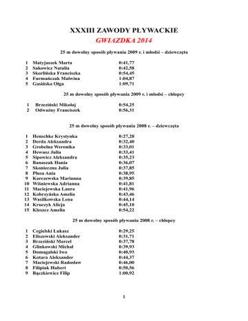 XXXIII ZAWODY PŁYWACKIE GWIAZDKA 2014 25 m dowolny sposób pływania 2009 r. i młodsi – dziewczęta 1 2 3 4 5 Matyjaszek Marta Sakowicz Natalia Skorlińska Franciszka Furmańczak Malwina Gasińska Olga 0:41,77 0:42,58 0:54,45 1:04,87 1:09,71 25 m dowolny sposób pływania 2009 r. i młodsi – chłopcy 1 2 Brzeziński Mikołaj Odważny Franciszek 0:54,25 0:56,31 25 m dowolny sposób pływania 2008 r. – dziewczęta 1 2 3 4 5 6 7 8 9 10 11 12 13 14 15 Henschke Krystynka Derda Aleksandra Grobelna Weronika Hewusz Julia Sipowicz Aleksandra Banaszak Hania Skonieczna Julia Płusa Ania Karczewska Marianna Wiśniewska Adrianna Maciejewska Laura Kobrzyńska Amelia Wasilkowska Lena Kruczyk Alicja Kleszcz Amelia 0:27,28 0:32,40 0:33,01 0:33,41 0:35,23 0:36,07 0:37,85 0:38,95 0:39,85 0:41,81 0:41,96 0:43,46 0:44,14 0:45,10 0:54,22 25 m dowolny sposób pływania 2008 r. – chłopcy 1 2 3 4 5 6 7 8 9 Cegielski Łukasz Eliszewski Aleksander Brzeziński Marcel Glinkowski Michał Domagalski Iwo Kotara Aleksander Maciejewski Radosław Filipiak Hubert Bączkiewicz Filip 0:29,25 0:31,71 0:37,78 0:39,93 0:40,93 0:44,37 0:46,00 0:50,56 1:00,92 1 25 m styl grzbietowy 2007 r. - I klasa – dziewczęta 1 2 3 4 5 6 7 8 9 10 11 12 13 14 15 16 17 18 19 20 21 22 23 24 25 26 27 28 Kawka Zuzanna Napierała Dominika Pelaczyk Lawinia Napieraj Zuzanna Zaremba Oliwia Wesołek Marta Wasiewicz Anna Szymczak Paulina Adamczyk Ingrid Beszterda Aleksandra Cieśla Milena Kęsa Alicja Haracewiat Julia Rybicka Klara Matyjaszek Anna Krzyżagórska Wiktoria Jóźwiak Lena Molęda Patrycja Polaszek Lena Korzeniowska Maja Walaszczyk Roksana Pohl Zuzanna Mazur Zuzanna Gabryel Joanna Jóźwiak Martyna Rybarczyk Antonina Krystyniak Julia Witczak Amelia 0:26,70 0:27,37 0:27,98 0:28,85 0:29,70 0:30,14 0:31,36 0:31,91 0:32,90 0:33,31 0:33,56 0:33,75 0:34,50 0:34,59 0:35,32 0:37,09 0:37,29 0:37,44 0:39,34 0:40,05 0:40,13 0:43,08 0:46,29 0:46,64 0:48,08 0:50,07 PK PK 25 m styl grzbietowy 2007 r. - I klasa – chłopcy 1 2 3 4 5 6 7 8 9 10 11 12 13 14 15 16 Wajnert Michał Brzozowski Piotr Michalski Oskar Korzeniowski Mikołaj Janczak Maciej Bugajny Miłosz Grycz Adam Sucharski Nicolas Dolata Jakub Kliński Paweł Wasiak Rafał Chełminiak Adam Czapla Filip Motylski Mateusz Kotara Jan Arciszewski Szymon 0:26,65 0:28,52 0:29,45 0:31,05 0:34,75 0:34,89 0:35,81 0:35,88 0:36,40 0:36,58 0:37,33 0:37,96 0:38,35 0:38,57 0:38,71 0:41,68 2 17 Kozber Maksymilian 18 Starczak Antoni 19 Kolenda Tymoteusz 0:45,84 0:47,32 0:49,54 25 m kraul 2007 r. - I klasa – dziewczęta 1 Trawińska Oliwia 2 Piotrowska Julia 0:26,47 0:40,83 25 m kraul 2007 r. - I klasa – chłopcy 1 Zawal Jan 0:32,62 25 m styl grzbietowy 2006 r. - II klasa – dziewczęta 1 2 3 4 5 6 7 8 9 10 11 12 13 14 15 16 17 18 19 20 21 22 23 24 Grzesiak Kornelia Michniak Patrycja Krauska Emma Przysuszyńska Anna Pawlak Karina Nojman Hanna Tomczak Zofia Kuś Julia Bartkowiak Natalia Jaśkowiak Julia Łada Katarzyna Knaś Natalia Nowak Amelia Rusinek Zofia Jankiewicz Justyna Starosta Aleksandra Hawrusik Joanna Oleksyn Antonina Żytkowiak Marianna Górska Weronika Szydłowska Gabrysia Mazur Aleksandra Olejnik Emilia Szymańska Marianna 0:24,89 0:25,48 0:25,72 0:26,74 0:26,96 0:27,83 0:28,78 0:29,31 0:30,18 0:30,25 0:30,47 0:31,00 0:31,44 0:31,82 0:32,07 0:32,19 0:33,66 0:35,07 0:36,81 0:36,92 0:37,50 0:37,53 0:40,33 0:47,64 25 m styl grzbietowy 2006 r. - II klasa – chłopcy 1 2 3 4 5 6 7 8 Piotrowicz Filip Czyż Alan Płusa Roman Marciniak Jakub Sapota Patryk Łada Łukasz Staszak Maksymilian Szadziul Maciej 0:25,14 0:26,91 0:28,95 0:29,46 0:30,00 0:30,21 0:31,78 0:33,46 3 9 10 11 12 13 14 15 16 17 18 19 20 21 Olejniczak Mateusz Kleszcz Dawid Grajewski Jakub Kamionka Patryk Odważny Kacper Banaszewski Bartek Lewandowski Oskar Zamelski Ignacy Siejak Dawid Kleszcz Jakub Kowalewski Michał Wojsz Adam Jezierny Bartosz 0:34,09 0:34,68 0:35,35 0:35,90 0:36,82 0:37,79 0:39,85 0:40,40 0:41,22 0:43,03 0:44,64 0:52,57 falstart 25 m kraul 2006 r. - II klasa – dziewczęta 1 2 3 4 5 6 7 8 9 10 Hofman Klara Wigman Nyah Koprowska Zuzanna Sipowicz Natalia Grobelna Martyna Sowińska Natasza Sakowicz Patrycja Garczarek Kamila Ratajczyk Wiktoria Przybylska Julia 0:23,81 0:23,89 0:24,21 0:26,64 0:26,85 0:28,10 0:28,17 0:30,72 0:32,43 PK 25 m kraul 2006 r. - II klasa – chłopcy 1 2 3 4 5 6 7 8 9 10 11 12 13 Gorzeń Norbert Hadryan Tymon Furmańczak Borys Frankowski Szymon Łysek Piotr Kawala Eryk Stawiński Igor Bolt Paweł Sarba Konrad Kopczyński Kuba Śniadecki Wojtek Starkowski Jędrzej Kopczyński Mikołaj 0:20,25 0:24,62 0:26,18 0:26,96 0:29,41 0:29,95 0:30,96 0:32,28 0:32,68 0:36,28 0:36,28 0:37,39 0:38,25 25 m styl grzbietowy 2005 r. - III klasa – dziewczęta 1 2 3 4 5 Piotrowska Hanna Wróblewska Karolina Szymańczyk Jagna Gomuła Martyna Wasilkowska Iga 0:21,46 0:25,65 0:25,93 0:26,29 0:26,65 4 6 7 8 9 10 11 12 13 14 15 16 17 18 19 20 21 22 23 24 25 26 27 28 29 30 Nowak Oliwia Cempel Zosia Zalewska Katarzyna Hoff Weronika Mielnik Aleksandra Zwolińska Jagoda Cichowicz Patrycja Drozdowska Julia Włoszyńska Julia Kaczmarska Magdalena Konieczna Eliza Andrysiak Martyna Derda Anastazja Lange Aleksandra Borowska Agnieszka Andrysiak Michalina Czeszak Zuzanna Lewandowska Julia Drzeżdżon Zuzanna Gołębiowska Laura Guzik Zofia Dobroś Marta Sydor Weronika Witt Karolina Szymoniak Martyna 0:26,87 0:27,78 0:27,80 0:28,00 0:28,33 0:28,42 0:28,59 0:29,31 0:29,39 0:30,23 0:30,36 0:30,67 0:31,07 0:31,59 0:31,71 0:31,82 0:32,75 0:32,91 0:34,77 0:35,03 0:36,00 0:36,25 0:38,00 0:38,41 0:44,16 25 m styl grzbietowy 2005 r. - III klasa – chłopcy 1 2 3 4 5 6 7 8 9 10 11 12 13 14 15 16 17 18 Wiśniewski Hubert Glinkowski Wojtek Alatkiewicz Szymon Piechocki Piotr Zalewski Filip Gaczkowski Piotr Rozynek Wojtek Gniot Jakub Chojnacki Jędrzej Kitajczuk Mateusz Kościecha Antek Majewski Alan Rybarczyk Jakub Markowski Kacper Pawlak Dawid Więcek Szymon Stachowiak Jan Janik Adam 0:22,76 0:25,68 0:27,64 0:28,72 0:30,25 0:3