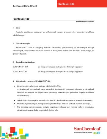Sunfount 480 Technical Data Sheet Sunfount 480 Karta techniczna produktu 1. Opis Roztwór nawilżający dodawany do offsetowych maszyn arkuszowych / zespołów nawilżania alkoholowego. 2. Charakterystyka SUNFOUNT® 480 to zastępczy roztwór alkoholowy przeznaczony do offsetowych maszyn arkuszowych, który można stosować również w maszynach drukarskich do druku offsetowego „na gorąco” (heatset). 3. Produkty standardowe SUNFOUNT® 480 do wody zawierającej maksymalnie 300 mg/l węglanów SUNFOUNT® 481 do wody zawierającej maksymalnie 300 mg/l węglanów 4. Właściwości roztworu SUNFOUNT® 480 Zmniejszenie / substytucja stężenia alkoholu (0%-5%), w określonych przypadkach może zachodzić konieczność stosowania alkoholu w niewielkich ilościach ze względu na indywidualne parametry konstrukcyjne (pośrednie zespoły nawilżania alkoholowego), Stabilizacja odczynu pH w zakresie od 4,8 do 5,3, bardziej korzystnym w procesie drukowania, Ochrona płyt drukowych, zabezpieczenie przed korozją podczas krótkich okresów przestoju, Nie powstają nierozpuszczalne związki wapnia powodujące tzw. łysienie wałków powodujące utrudniony transport farby w zespołach farbowych, Technical Data Sheet Sunfount 480 Dobre i równomierne nawilżanie płyt drukowych, szybko osiągana równowaga mieszaniny farba/woda poprzez właściwie dobrane parametry nawilżania, Ekonomiczne stężenie w zakresie tylko od 2 do 4%. 5. Oznakowanie Produkt SUNFOUNT® 480 należy oznakować w następujący sposób: „Xi: Produkt drażniący”, „R36: Działa drażniąco na oczy”, „R43: Może powodować uczulenie w kontakcie ze skórą”. Produkt SUNFOUNT® 481 nie zawiera niebezpiecznych substancji lub związków, zgodnie z Dyrektywami 67/548/EWG lub 1999/45/EWG. Karta charakterystyki dostępna na życzenie. 6. Pakowanie Produkt SUNFOUNT® jest dostępny w opakowaniach jednorazowych (25 kg i 200 kg) oraz opakowaniach wielorazowego użytku (600 kg i 1000 kg). Na życzenie oferujemy kurek spustowy do 200 kg opakowań jednorazowych i wielorazowego użytku. Woda lub mieszanki wody i alkoholu (etanol, izopropanol lub normalny propanol). Do typowych mieszanek należą: Szybki: Alkohol / Woda 1:1 Normalny: Alkohol / Woda 1:3 Wolny: Woda 7. Wyłączenie odpowiedzialności Wykaz zastosowań, podkładów i procedur dostarczony w niniejszej dokumentacji nie jest wykazem pełnym. Prosimy skontaktować się z lokalnym przedstawicielem Sun Chemical w celu przeprowadzenia pełnej oceny technicznej zastosowania lub procesu, w jakiego ramach chcą Państwo użyć naszych produktów. Produkty Sun Chemical przeznaczone są do sprzedaży użytkownikom profesjonalnym. Informacje zawarte w niniejszej dokumentacji mają charakter ogólny i zostały udostępnione, aby pomóc klientom w ustaleniu, czy nasze produkty nadają się do przewidywanych przez nich zastosowań. Żadne zawarte w niej zalecenia nie mają charakteru gwarancji, ponieważ nie mamy wpływu na sposób i warunki stosowania naszych produktów. Technical Data Sheet Sunfount 480 Zalecamy naszym klientom, aby w wystarczający sposób sprawdzili, czy poszczególne produkty spełniają ich wymagania w całej rozciągłości jeszcze przed rozpoczęciem procesu druku. Nie udziela się również żadnej domniemanej gwarancji atrakcyjności rynkowej ani możliwości zastosowania produktów opisanych w niniejszej dokumentacji. Sun Chemical w żadnym razie nie bierze na siebie odpowiedzialności za żadne szkody powstałe w wyniku zastosowania informacji zawartych w niniejszej dokumentacji lub opierania się na nich. Modyfikacje produktów w celu ich ulepszenia mogą nastąpić bez dalszego powiadomienia. 8. Pomoc techniczna/kontakt Nasze produkty przeznaczone są do sprzedaży użytkownikom profesjonalnym. Informacje zawarte w niniejszej dokumentacji mają charakter ogólny i zostały udostępnione, aby pomóc klientom w ustaleniu, czy nasze produkty nadają się do przewidywanych przez nich zastosowań. Żadne zawarte w niej zalecenia nie mają charakteru gwarancji, ponieważ nie mamy wpływu na sposób i warunki stosowania naszych produktów. Zalecamy naszym klientom, aby w wystarczający sposób sprawdzili, czy poszczególne produkty spełniają ich wymagania w całej rozciągłości jeszcze przed rozpoczęciem procesu drukarskiego. Nie udziela się również żadnej domniemanej gwarancji atrakcyjności rynkowej ani możliwości zastosowania produktów opisanych w niniejszej dokumentacji. Sun Chemical w żadnym razie nie bierze na siebie odpowiedzialności za żadne szkody powstałe w wyniku zastosowania informacji zawartych w niniejszej dokumentacji lub opierania się na nich. Modyfikacje produktów w celu ich ulepszenia mogą nastąpić bez dalszego powiadomienia. Po dalsze szczegółowe porady dotyczące stosowania prosimy skontaktować się z naszym działem technicznym. Karty charakterystyki produktu dostępne są na naszej stronie internetowej:http://www.sunchemical.com.pl lub prosimy o kontakt mailowy: [email protected]