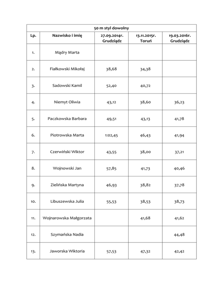 50 m styl dowolny Lp. Nazwisko i imię 27.09.2014r. Grudziądz 13.11.2015r. Toruń 1. Mądry Marta 2. 19.03.2016r. Grudziądz Fiałkowski Mikołaj 38,68 34,38 3. Sadowski Kamil 52,40 40,72 4. Niemyt Oliwia 43,12 38,60 36,23 5. Paczkowska Barbara 49,51 43,13 41,78 6. Piotrowska Marta 1:02,45 46,43 41,94 7. Czerwiński Wiktor 43,55 38,00 37,21 8. Wojnowski Jan 57,85 41,73 40,46 9. Zielińska Martyna 46,93 38,82 37,78 10. Libuszewska Julia 55,53 38,53 38,73 11. Wojnarowska Małgorzata 41,68 41,62 12. Szymańska Nadia 13. Jaworska Wiktoria 44,48 57,53 47,32 42,42 14. Rusinek Mateusz 1:17.31 57,04 53,95 50 m styl grzbietowy Lp. Nazwisko i imię 27.09.2014 Grudziądz 13.11.2015 Toruń 1. Mądry Marta 2. 28.11.2015 Brodnica 19.03.2016 Grudziądz Fiałkowski Mikołaj 48.92 42.48 3. Sadowski Kamil 55.93 47.71 4. Niemyt Oliwia 58.15 43.70 5. Paczkowska Barbara 59.71 55.75 6. Piotrowska Marta 1:01.65 46.97 7. Czerwiński Wiktor 53.12 46.14 45.69 8. Wojnowski Jan 58.25 54.38 49.34 9. Zielińska Martyna 55.27 10. Libuszewska Julia 57.78 11. Wojnarowska Małgorzata 47.22 48.83 46.04 50.83 12. Szymańska Nadia 52.28 51.02 13. Jaworska Wiktoria 1:01.15 51.86 14. Rusinek Mateusz 1:19.50 dyskwalifikacja 50m styl klasyczny Lp. Nazwisko i imię 13.11.2015r. Toruń 28.11.2015r. Brodnica 19.03.2016r. Grudziądz 1. Mądry Marta 2. Fiałkowski Mikołaj 3. Sadowski Kamil 4. Niemyt Oliwia 53.80 5. Paczkowska Barbara 59.12 6. Piotrowska Marta 59.41 7. Czerwiński Wiktor 52.41 50.76 8. Wojnowski Jan 53.84 52.70 9. Zielińska Martyna 53.63 52.13 10. Libuszewska Julia 49.64 48.08 11. Wojnarowska Małgorzata 57.67 1:00.53 12. Szymańska Nadia 52.85 52.98 13. Jaworska Wiktoria 1:02.34 1:01.24 14. Rusinek Mateusz 54.87 54.38 56.07 56.54 50m styl motylkowy Lp. Nazwisko i imię 13.11.2015r. Toruń 21.11.2015r. Grudziądz 28.11.2015r. Brodnica 41.93 42.53 19.03.2016r. Grudziądz 1. Mądry Marta 2. Fiałkowski Mikołaj 40.07 3. Sadowski Kamil 4. Niemyt Oliwia 5. Paczkowska Barbara 55.03 6. Piotrowska Marta 50.90 7. Czerwiński Wiktor 45.24 44.17 42.32 48.08 40.84 44.23 8. Wojnowski Jan 50.37 48.95 9. Zielińska Martyna 10. Libuszewska Julia 49.39 11. Wojnarowska Małgorzata 49.37 12. Szymańska Nadia 54.70 13. Jaworska Wiktoria dyskwalifikacja 14. Rusinek Mateusz 45.34 41.90 46.15 1:05.95 46.53 1:04.49