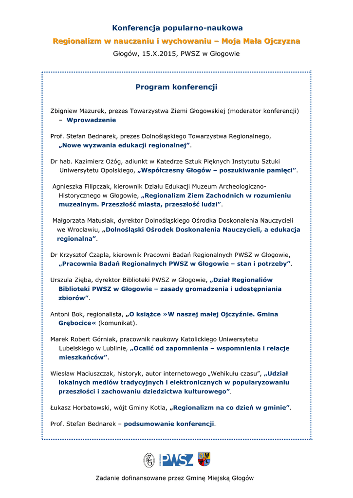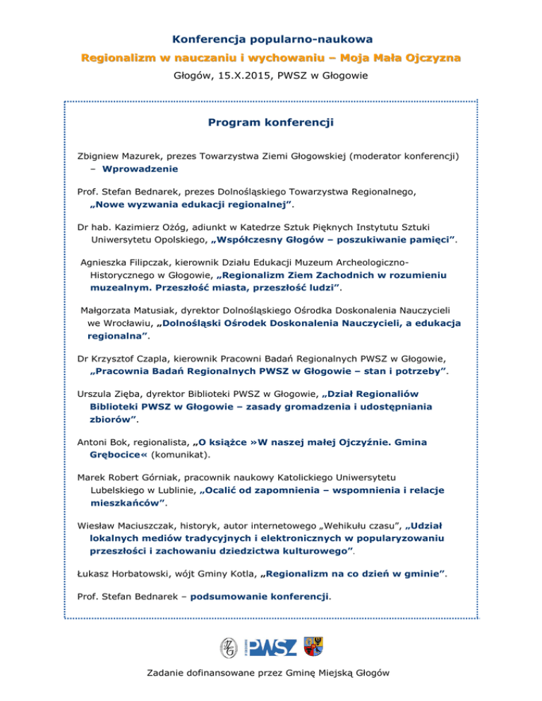 Konferencja popularno-naukowa Regionalizm w nauczaniu i wychowaniu – Moja Mała Ojczyzna Głogów, 15.X.2015, PWSZ w Głogowie Program konferencji Zbigniew Mazurek, prezes Towarzystwa Ziemi Głogowskiej (moderator konferencji) – Wprowadzenie Prof. Stefan Bednarek, prezes Dolnośląskiego Towarzystwa Regionalnego, „Nowe wyzwania edukacji regionalnej”. Dr hab. Kazimierz Ożóg, adiunkt w Katedrze Sztuk Pięknych Instytutu Sztuki Uniwersytetu Opolskiego, „Współczesny Głogów – poszukiwanie pamięci”. Agnieszka Filipczak, kierownik Działu Edukacji Muzeum ArcheologicznoHistorycznego w Głogowie, „Regionalizm Ziem Zachodnich w rozumieniu muzealnym. Przeszłość miasta, przeszłość ludzi”. Małgorzata Matusiak, dyrektor Dolnośląskiego Ośrodka Doskonalenia Nauczycieli we Wrocławiu, „Dolnośląski Ośrodek Doskonalenia Nauczycieli, a edukacja regionalna”. Dr Krzysztof Czapla, kierownik Pracowni Badań Regionalnych PWSZ w Głogowie, „Pracownia Badań Regionalnych PWSZ w Głogowie – stan i potrzeby”. Urszula Zięba, dyrektor Biblioteki PWSZ w Głogowie, „Dział Regionaliów Biblioteki PWSZ w Głogowie – zasady gromadzenia i udostępniania zbiorów”. Antoni Bok, regionalista, „O książce »W naszej małej Ojczyźnie. Gmina Grębocice« (komunikat). Marek Robert Górniak, pracownik naukowy Katolickiego Uniwersytetu Lubelskiego w Lublinie, „Ocalić od zapomnienia – wspomnienia i relacje mieszkańców”. Wiesław Maciuszczak, historyk, autor internetowego „Wehikułu czasu”, „Udział lokalnych mediów tradycyjnych i elektronicznych w popularyzowaniu przeszłości i zachowaniu dziedzictwa kulturowego”. Łukasz Horbatowski, wójt Gminy Kotla, „Regionalizm na co dzień w gminie”. Prof. Stefan Bednarek – podsumowanie konferencji. Zadanie dofinansowane przez Gminę Miejską Głogów