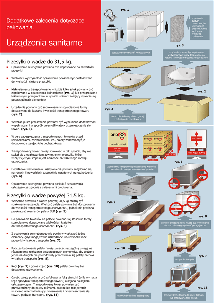 rys. 1 Dodatkowe zalecenia dotyczące pakowania. wypełnienie pustych przestrzeni, by uniemożliwić przemieszczenie się towaru wewnątrz opakowania Urządzenia sanitarne rys. 3 urządzenia powinny być zapakowane w styropianowe formy dopasowane do kształtu i wielkości transportowanego towaru zastosowanie opakowań jednostkowych Przesyłki o wadze do 31,5 kg. ,Opakowanie zewnętrzne powinno być dopasowane do zawartości przesyłki. ,Wielkość i wytrzymałość opakowania powinna być dostosowana do wielkości i ciężaru przesyłki. ,Małe elementy transportowane w liczbie kilku sztuk powinny być rys. 2 zapakowane w opakowania jednostkowe (rys. 1) lub przegrodzone tekturowymi przegródkami w sposób uniemożliwiający stykanie się poszczególnych elementów. ,Urządzenia powinny być zapakowane w styropianowe formy dopasowane do kształtu i wielkości transportowanego towaru (rys. 2). ,Wszelkie puste przestrzenie powinny być wypełnione dodatkowymi rys. 4 wzmocnienie krawędzi oraz górnej i dolnej powierzchni towaru wypełniaczami w sposób uniemożliwiający przemieszczanie się towaru (rys. 3). ,W celu zabezpieczenia transportowanych towarów przed uszkodzeniami, zarysowaniami itp., należy zabezpieczyć je dodatkowo stosując folię pęcherzykową. ,Transportowany towar należy spakować w taki sposób, aby nie max 180 cm www.dpd.com.pl www.dpd.com.pl www.dpd.com.pl www.dpd.com.pl max. waga: 31,5 kg stykał się z opakowaniem zewnętrznym przesyłki, które w największym stopniu jest narażone na wszelkiego rodzaju uszkodzenia. ,Dodatkowe wzmocnienia i usztywnienia powinny znajdować się www.dpd.com.pl max. waga: 500 kg max. 120 cm EUR max. 80 cm rys. 5 użycie formy styropianowej dopasowanej wielkością i kształtem do transportowanego asortymentu na rogach i krawędziach szczególnie narażonych na uszkodzenia (rys. 4). ŹLE ,Opakowanie zewnętrzne powinno posiadać oznakowania www.dpd.com.pl www.dpd.com.pl ŹLE ostrzegawcze zgodnie z zaleceniami producenta. Przesyłki o wadze powyżej 31,5 kg. ,Wszystkie przesyłki o wadze powyżej 31,5 kg muszą być spakowane na palecie. Wielkość palety powinna być dostosowana do wielkości transportowanego asortymentu, jednak nie powinna przekraczać rozmiarów palety EUR (rys. 5). rys. 6 ŹLE ŹLE rys. 8 ,Do pakowania towarów na palecie powinno się stosować formy styropianowe dopasowane wielkością i kształtem do transportowanego asortymentu (rys. 6). elementy składowe palety muszą być równomienie ułożone i nie mogą wystawać poza jej obrys ,Z opakowania zewnętrznego nie powinny wystawać żadne elementy, gdyż mogą zostać uszkodzone lub uszkodzić inne przesyłki w trakcie transportu (rys. 7). ,Podczas budowania palety należy zwracać szczególną uwagę na rys. 10 równomierne rozłożenie poszczególnych elementów, aby ułożone jedne na drugich nie powodowały przechylania się palety na boki w trakcie transportu (rys. 8). rys. 9 usztywnienie rogów ,Rogi (rys. 9) i górna część (rys. 10) palety powinny być dodatkowo usztywnione. ,Całość palety powinna być zafoliowana folią stretch i (o ile wymaga tego specyfika transportowanego towaru) oklejona naklejkami ostrzegawczymi. Transportowany towar powinien być przytwierdzony do palety taśmami, pasami lub folią stretch w sposób uniemożliwiający przesuwanie i przemieszczanie się towaru podczas transportu (rys. 11). www.dpd.com.pl www.dpd.com.pl rys. 11 usztywnienie górnej części palety przytwierdzenie towaru do palety taśmami lub zafoliowanie folią stretch