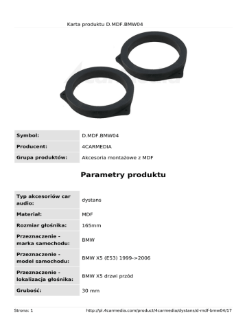 Karta produktu D.MDF.BMW04 Symbol: D.MDF.BMW04 Producent: 4CARMEDIA Grupa produktów: Akcesoria montażowe z MDF Parametry produktu Typ akcesoriów car audio: dystans Materiał: MDF Rozmiar głośnika: 165mm Przeznaczenie marka samochodu: Przeznaczenie model samochodu: Przeznaczenie lokalizacja głośnika: Grubość: Strona: 1 BMW BMW X5 (E53) 1999->2006 BMW X5 drzwi przód 30 mm http://pl.4carmedia.com/product/4carmedia/dystans/d-mdf-bmw04/17 Karta produktu D.MDF.BMW04 Właściwości car audio: impregnowany Informacje dodatkowe Masa brutto: Strona: 2 0,416 kg http://pl.4carmedia.com/product/4carmedia/dystans/d-mdf-bmw04/17