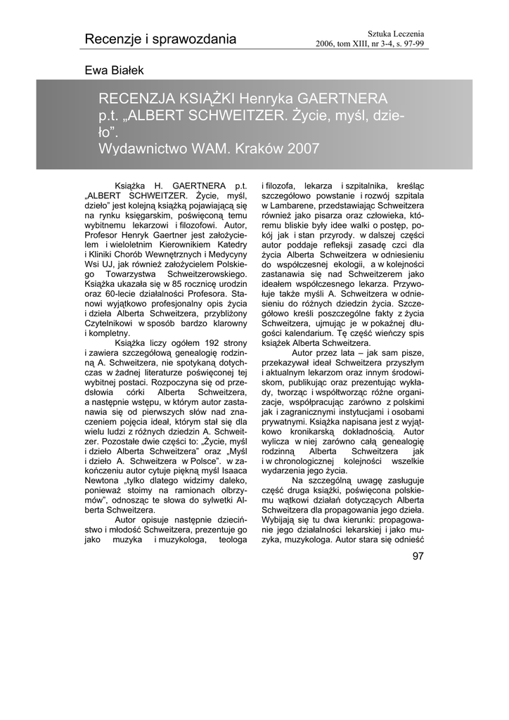 Recenzje i sprawozdania Sztuka Leczenia 2006, tom XIII, nr 3-4, s. 97-99 Ewa Białek RECENZJA KSIĄŻKI Henryka GAERTNERA p.t. „ALBERT SCHWEITZER. Życie, myśl, dzieło”. Wydawnictwo WAM. Kraków 2007 Książka H. GAERTNERA p.t. „ALBERT SCHWEITZER. Życie, myśl, dzieło” jest kolejną książką pojawiającą się na rynku księgarskim, poświęconą temu wybitnemu lekarzowi i filozofowi. Autor, Profesor Henryk Gaertner jest założycielem i wieloletnim Kierownikiem Katedry i Kliniki Chorób Wewnętrznych i Medycyny Wsi UJ, jak również założycielem Polskiego Towarzystwa Schweitzerowskiego. Książka ukazała się w 85 rocznicę urodzin oraz 60-lecie działalności Profesora. Stanowi wyjątkowo profesjonalny opis życia i dzieła Alberta Schweitzera, przybliżony Czytelnikowi w sposób bardzo klarowny i kompletny. Książka liczy ogółem 192 strony i zawiera szczegółową genealogię rodzinną A. Schweitzera, nie spotykaną dotychczas w żadnej literaturze poświęconej tej wybitnej postaci. Rozpoczyna się od przecórki Alberta Schweitzera, dsłowia a następnie wstępu, w którym autor zastanawia się od pierwszych słów nad znaczeniem pojęcia ideał, którym stał się dla wielu ludzi z różnych dziedzin A. Schweitzer. Pozostałe dwie części to: „Życie, myśl i dzieło Alberta Schweitzera” oraz „Myśl i dzieło A. Schweitzera w Polsce”. w zakończeniu autor cytuje piękną myśl Isaaca Newtona „tylko dlatego widzimy daleko, ponieważ stoimy na ramionach olbrzymów”, odnosząc te słowa do sylwetki Alberta Schweitzera. Autor opisuje następnie dzieciństwo i młodość Schweitzera, prezentuje go jako muzyka i muzykologa, teologa i filozofa, lekarza i szpitalnika, kreśląc szczegółowo powstanie i rozwój szpitala w Lambarene, przedstawiając Schweitzera również jako pisarza oraz człowieka, któremu bliskie były idee walki o postęp, pokój jak i stan przyrody. w dalszej części autor poddaje refleksji zasadę czci dla życia Alberta Schweitzera w odniesieniu do współczesnej ekologii, a w kolejności zastanawia się nad Schweitzerem jako ideałem współczesnego lekarza. Przywołuje także myśli A. Schweitzera w odniesieniu do różnych dziedzin życia. Szczegółowo kreśli poszczególne fakty z życia Schweitzera, ujmując je w pokaźnej długości kalendarium. Tę część wieńczy spis książek Alberta Schweitzera. Autor przez lata – jak sam pisze, przekazywał ideał Schweitzera przyszłym i aktualnym lekarzom oraz innym środowiskom, publikując oraz prezentując wykłady, tworząc i współtworząc różne organizacje, współpracując zarówno z polskimi jak i zagranicznymi instytucjami i osobami prywatnymi. Książka napisana jest z wyjątkowo kronikarską dokładnością. Autor wylicza w niej zarówno całą genealogię Alberta Schweitzera jak rodzinną i w chronologicznej kolejności wszelkie wydarzenia jego życia. Na szczególną uwagę zasługuje część druga książki, poświęcona polskiemu wątkowi działań dotyczących Alberta Schweitzera dla propagowania jego dzieła. Wybijają się tu dwa kierunki: propagowanie jego działalności lekarskiej i jako muzyka, muzykologa. Autor stara się odnieść 97 Recenzje i sprawozdania niektóre wydarzenia z życia Schweitzera do sytuacji w Polsce w ówczesnych czasach, inicjatyw światowych i na tym tle uwidacznia polskie inicjatywy. Autor ujął tu działania wielu instytucji (także szkół) jak również pojedynczych osób, w tym także swoje wszechstronne akcje jako czynnego propagatora wzoru lekarza i muzyka, jakim był Albert Schweitzer. Lektura książki mówi także wiele o sylwetce autora, jako niestrudzonego przez dziesiątki lat podróżnika śladami Schweitzera, autora, mówcy, także znawcy muzyki granej przez Schweitzera, podążającego wieloma szlakami Polski i nie tylko. Autor przybliża sylwetkę Alberta Schweitzera zarówno dorosłym jak i młodzieży, również innym środowiskom, w których działał. Należy tu wymienić Polskie Towarzystwo Szpitalnictwa, na bazie, którego zaczęła się działalność poświęcona Albertowi Schweitzerowi, następnie samodzielnie istniejące Polskie Towarzystwo Schweitzerowskie i jego sekcje oraz liczne związki z różnymi organizacjami, w tym Towarzystwem Edukacji Psychosomatycznej jak również z Polską i Światową Akademią Medycyny im. A. Schweitzera. W kolejności autor wymienia dzieła A. Schweitzera lub ich fragmenty wydane po polsku, ksiązki o życiu i działalności Schweitzera, tytuły rozpraw magisterskich, materiały sympozjalne, artykuły o Schweitzerze, wśród których znalazły się też liczne prace autora, prezentujące A.Schweitzera jako lekarza, muzykologa, teologa i filozofa, oraz muzyka, wymienia także utwory literackie, posiedzenia, konferencje, zjazdy o tematyce schweitzerowskiej. z ciekawostek autor wspomina o pamiątkowym medalu A. Schweitzera wydanym przez Polskie Towarzystwo Schweitzerowskie, znaczku Poczty Polskiej 98 i Szkołach Schweitzerowskich dla młodzieży oraz imprezach artystycznych, w które włączane były elementy poświęcone działalności A. Schweitzera i wystawy, w tym powstanie Towarzystwa Bachowskiego oraz ogłoszenie 1990 roku – „Rokiem Schweitzerowskim” i wiele inicjatyw z tym związanych. Na zakończenie prezentuje współprace z licznymi organizacjami i towarzystwami w Polsce (włączając także zarówno parafie jak i instytucje wyznaniowe –ewangelickie, gdyż Schweitzer był tego wyznania) i za granicą. Nie sposób wymienić ich wszystkich. Znajdzie je czytelnik w bogatej treści ksiązki. Sądząc po owocach – niezliczonej ilości inicjatyw związanych z osobą Alberta Schweitzera, można śmiało powiedzieć, że dzieło nie tylko A. Schweitzera wydało liczne owoce, ale szczególnie przesłanie autora znalazło podatny grunt, dając w wielu środowiskach ogromny odzew. Książka dopełnia istniejące dotychczas opracowania na temat Alberta Schweitzera i c