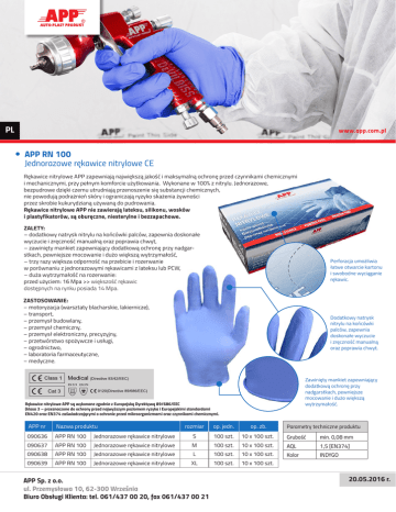 PL APP RN 100 Jednorazowe rękawice nitrylowe CE Rękawice nitrylowe APP zapewniają największą jakość i maksymalną ochronę przed czynnikami chemicznymi i mechanicznymi, przy pełnym komforcie użytkowania. Wykonane w 100% z nitrylu. Jednorazowe, bezpudrowe dzięki czemu utrudniają przenoszenie się substancji chemicznych, nie powodują podrażnień skóry i ograniczają ryzyko skażenia żywności przez skrobie kukurydzianą używaną do pudrowania. Rękawice nitrylowe APP nie zawierają lateksu, silikonu, wosków i plastyfikatorów, są oburęczne, niesterylne i bezzapachowe. ZALETY: – dodatkowy natrysk nitrylu na końcówki palców, zapewnia doskonałe wyczucie i zręczność manualną oraz poprawia chwyt, – zawinięty mankiet zapewniający dodatkową ochronę przy nadgarstkach, pewniejsze mocowanie i dużo większą wytrzymałość, – trzy razy większa odporność na przebicie i rozerwanie w porównaniu z jednorazowymi rękawicami z lateksu lub PCW, – duża wytrzymałość na rozerwanie: przed użyciem: 16 Mpa >> większość rękawic dostępnych na rynku posiada 14 Mpa. Perforacja umożliwia łatwe otwarcie kartonu i swobodne wyciąganie rękawic. ZASTOSOWANIE: – motoryzacja (warsztaty blacharskie, lakiernicze), – transport, – przemysł budowlany, – przemysł chemiczny, – przemysł elektroniczny, precyzyjny, – przetwórstwo spożywcze i usługi, – ogrodnictwo, – laboratoria farmaceutyczne, – medyczne. Dodatkowy natrysk nitrylu na końcówki palców, zapewnia doskonałe wyczucie i zręczność manualną oraz poprawia chwyt. Zawinięty mankiet zapewniający dodatkową ochronę przy nadgarstkach, pewniejsze mocowanie i dużo większą wytrzymałość. Rękawice nitrylowe APP są wykonane zgodnie z Europejską Dyrektywą 89/686/EEC (klasa 3 – przeznaczone do ochrony przed najwyższym poziomem ryzyka i Europejskimi standardami EN420 oraz EN374 zaświadczającymi o ochronie przed mikroorganizmami oraz czynnikami chemicznymi. APP nr Nazwa produktu rozmiar op. jedn. op. zb. 090636 APP RN 100 090637 APP RN 100 Jednorazowe rękawice nitrylowe S 100 szt. 10 x 100 szt. Grubość min. 0,08 mm Jednorazowe rękawice nitrylowe M 100 szt. 10 x 100 szt. 090638 AQL 1,5 [EN374] APP RN 100 Jednorazowe rękawice nitrylowe L 100 szt. 10 x 100 szt. Kolor INDYGO 090639 APP RN 100 Jednorazowe rękawice nitrylowe XL 100 szt. 10 x 100 szt. APP Sp. z o.o. ul. Przemysłowa 10, 62-300 Września Biuro Obsługi Klienta: tel. 061/437 00 20, fax 061/437 00 21 Parametry techniczne produktu 20.05.2016 r.