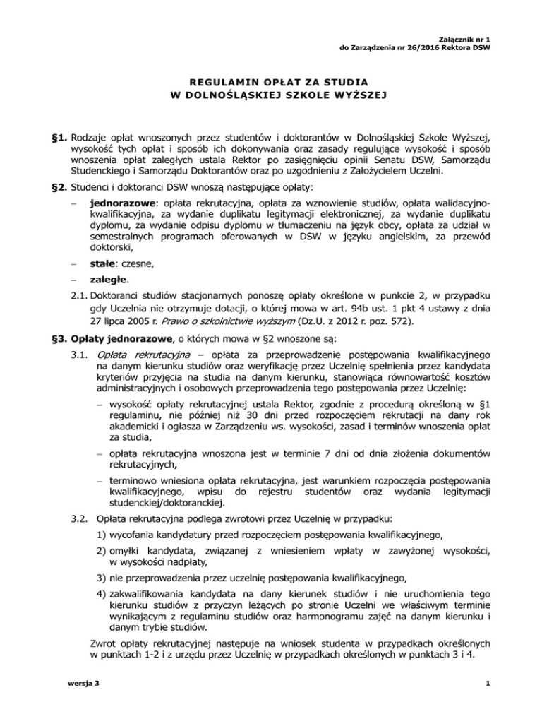Załącznik nr 1 do Zarządzenia nr 26/2016 Rektora DSW REGULAMIN OPŁAT ZA STUD IA W DOLNOŚLĄSKIEJ SZKOLE WYŻSZEJ §1. Rodzaje opłat wnoszonych przez studentów i doktorantów w Dolnośląskiej Szkole Wyższej, wysokość tych opłat i sposób ich dokonywania oraz zasady regulujące wysokość i sposób wnoszenia opłat zaległych ustala Rektor po zasięgnięciu opinii Senatu DSW, Samorządu Studenckiego i Samorządu Doktorantów oraz po uzgodnieniu z Założycielem Uczelni. §2. Studenci i doktoranci DSW wnoszą następujące opłaty: − jednorazowe: opłata rekrutacyjna, opłata za wznowienie studiów, opłata walidacyjnokwalifikacyjna, za wydanie duplikatu legitymacji elektronicznej, za wydanie duplikatu dyplomu, za wydanie odpisu dyplomu w tłumaczeniu na język obcy, opłata za udział w semestralnych programach oferowanych w DSW w języku angielskim, za przewód doktorski, − stałe: czesne, − zaległe. 2.1. Doktoranci studiów stacjonarnych ponoszę opłaty określone w punkcie 2, w przypadku gdy Uczelnia nie otrzymuje dotacji, o której mowa w art. 94b ust. 1 pkt 4 ustawy z dnia 27 lipca 2005 r. Prawo o szkolnictwie wyższym (Dz.U. z 2012 r. poz. 572). §3. Opłaty jednorazowe, o których mowa w §2 wnoszone są: 3.1. Opłata rekrutacyjna – opłata za przeprowadzenie postępowania kwalifikacyjnego na danym kierunku studiów oraz weryfikację przez Uczelnię spełnienia przez kandydata kryteriów przyjęcia na studia na danym kierunku, stanowiąca równowartość kosztów administracyjnych i osobowych przeprowadzenia tego postępowania przez Uczelnię: − wysokość opłaty rekrutacyjnej ustala Rektor, zgodnie z procedurą określoną w §1 regulaminu, nie później niż 30 dni przed rozpoczęciem rekrutacji na dany rok akademicki i ogłasza w Zarządzeniu ws. wysokości, zasad i terminów wnoszenia opłat za studia, − opłata rekrutacyjna wnoszona jest w terminie 7 dni od dnia złożenia dokumentów rekrutacyjnych, − terminowo wniesiona opłata rekrutacyjna, jest warunkiem rozpoczęcia postępowania kwalifikacyjnego, wpisu do rejestru studentów oraz wydania legitymacji studenckiej/doktoranckiej. 3.2. Opłata rekrutacyjna podlega zwrotowi przez Uczelnię w przypadku: 1) wycofania kandydatury przed rozpoczęciem postępowania kwalifikacyjnego, 2) omyłki kandydata, związanej z wniesieniem wpłaty w zawyżonej wysokości, w wysokości nadpłaty, 3) nie przeprowadzenia przez uczelnię postępowania kwalifikacyjnego, 4) zakwalifikowania kandydata na dany kierunek studiów i nie uruchomienia tego kierunku studiów z przyczyn leżących po stronie Uczelni we właściwym terminie wynikającym z regulaminu studiów oraz harmonogramu zajęć na danym kierunku i danym trybie studiów. Zwrot opłaty rekrutacyjnej następuje na wniosek studenta w przypadkach określonych w punktach 1-2 i z urzędu przez Uczelnię w przypadkach określonych w punktach 3 i 4. wersja 3 1 3.3. Opłata za wznowienie studiów – stanowi należność wnoszoną przez osoby uprzednio skreślone z listy studentów DSW, które na mocy decyzji Rektora uzyskały zgodę na ponowny wpis na listę studentów DSW: − wysokość opłaty za wznowienie studiów ustala Rektor, zgodnie z procedurą określoną w §1 regulaminu, nie później niż 30 dni przed rozpoczęciem roku akademickiego i ogłasza w Zarządzeniu ws. wysokości, zasad i terminów wnoszenia opłat za studia, − opłata za wznowienie studiów jest wnoszona w terminie do 7 dni od daty decyzji Rektora o ponownym wpisie na listę studentów i jest warunkiem realizacji tej decyzji. 3.3 Pozostałe opłaty: − opłata walidacyjno-kwalifikacyjna (za przygotowanie oceny kompletności dokumentacji przebiegu studiów, przygotowanie dokumentacji końcowej, karty obiegowej, wydanie dyplomu, rejestracja archiwizacyjna) – jest wnoszona w terminie 2 tygodni od uzyskania zaliczenia ostatniego semestru studiów (absolutorium), − wydanie duplikatu legitymacji elektronicznej, − wydanie duplikatu dyplomu, − wydanie odpisu dyplomu w tłumaczeniu na język obcy, − opłata za przewód doktorski – uregulowana Zarządzeniem Rektora DSW w sprawie wysokości, zasad i terminów wnoszenia opłat za studia. §4. Opłaty stałe: 4.1 Wysokość czesnego ustala Rektor, zgodnie z procedurą określoną w §1 regulaminu, nie później niż 30 dni przed rozpoczęciem każdego semestru i ogłasza odrębnym zarządzeniem. 4.2 Sposób wnoszenia opłat z tytułu czesnego określa Rektor w wydawanym na każdy rok akademicki zarządzaniu w sprawie wysokości, zasad i terminów wnoszenia opłat za studia. 4.3 Terminowa opłata czesnego jest warunkiem: − wpisania do właściwej grupy dziekańskiej (elektronicznego protokołu przedmiotu), − uzyskania wpisu na kolejny semestr studiów, po uprzednim spełnieniu warunków wskazanych w „Regulaminie studiów” oraz „Regulaminie studiów doktoranckich”. 4.4. Wysokość opłat indywidualnie: dla osób powtarzających rok/semestr/przedmiot jest ustalana − czesne – na podstawie proporcji pomiędzy przedmiotami zaliczonymi przez studenta przed skreśleniem z listy studentów i przedmiotami wymagającymi zaliczenia po wznowieniu studiów i ponownym wpisie na listę studentów, − praktyki – wysokość stawki godzinowej za praktyki wynosi 0,3 stawki za 1 godzinę zajęć. 4.5. opłata czesnego podlega zwrotowi jeśli student/doktorant zostaje skreślony z listy studentów/doktorantów DSW na własne życzenie. Wysokość zwrotu to czesne pomniejszone o koszt odbytych zajęć dydaktycznych do dnia zgłoszenia rezygnacji ze studiów. 4.6. opłaty z tytułu czesnego wnoszone są przez studentów cudzoziemców w EURO, a w przypadku płatności w walucie polskiej stosuje się przeliczenie według średniego kursu NBP w dniu wpłaty. wersja 3 2 §5. Opłaty zaległe – opłaty stałe nieuiszczone w terminach wskazanych przez studenta/doktoranta w zobowiązaniu do wnoszenia opłat lub „Korekcie zobowiązania do wnoszenia