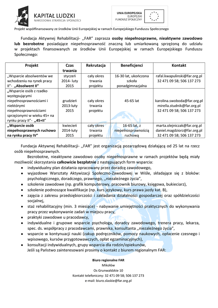 Projekt współfinansowany ze środków Unii Europejskiej w ramach Europejskiego Funduszu Społecznego Fundacja Aktywnej Rehabilitacji- ,,FAR” zaprasza osoby niepełnosprawne, nieaktywne zawodowo lub bezrobotne posiadające niepełnosprawnośd znaczną lub umiarkowaną sprzężoną do udziału w projektach finansowanych ze środków Unii Europejskiej w ramach Europejskiego Funduszu Społecznego: Projekt Czas trwania Rekrutacja Beneficjenci Kontakt „Wsparcie absolwentów we wchodzeniu na rynek pracy II”- ,,Absolwent II” „Wsparcie osób z rzadko występującymi niepełnosprawnościami i niektórymi niepełnosprawnościami sprzężonymi w wieku 45+ na rynku pracy II”- ,,45+II” ,,Wsparcie osób niepełnosprawnych ruchowo na rynku pracy IV” styczeo 2014- luty 2015 cały okres trwania projektu 16-30 lat, ukooczona szkoła ponadgimnazjalna [email protected] 32 471 09 58; 506 137 273 grudzieo 2013-luty 2015 cały okres trwania projektu 45-65 lat [email protected] [email protected] 32 471 09 58; 506 137 273 kwiecieo 2014-luty 2015 cały okres trwania projektu 16-65 lat, z niepełnosprawnością ruchową [email protected] [email protected] 32 471 09 58; 506 137 273 Fundacja Aktywnej Rehabilitacji- ,,FAR” jest organizacją pozarządową działającą od 25 lat na rzecz osób niepełnosprawnych. Bezrobotne, nieaktywne zawodowo osoby niepełnosprawne w ramach projektów będą miały możliwośd skorzystania całkowicie bezpłatnie z następujących form wsparcia: indywidualny plan działania opracowany przez doradcę zawodowego, wyjazdowe Warsztaty Aktywizacji Społeczno-Zawodowej w Wiśle, składające się z bloków: psychologicznego, doradczego, prawnego, ,,niezależnego życia”, szkolenie zawodowe (np. grafik komputerowy, pracownik biurowy, księgowa, bukieciarz), szkolenie podnoszące kwalifikacje (np. kurs językowy, kurs prawa jazdy kat. B), zajęcia z zakresu przedsiębiorczości i zakładania działalności gospodarczej oraz spółdzielczości socjalnej, staż rehabilitacyjny (min. 3 miesiące) - nabywanie umiejętności praktycznych do wykonywania pracy przez wykonywanie zadao w miejscu pracy, praktyki zawodowe u pracodawcy, indywidualne i grupowe wsparcie psychologa, doradcy zawodowego, trenera pracy, lekarza, spec. ds. współpracy z pracodawcami, prawnika, konsultanta ,,niezależnego życia”, wsparcie w kontynuacji nauki (zakup podręczników, pomocy naukowych, opłacenie czesnego i wpisowego, kursów przygotowawczych, opłat egzaminacyjnych), konsultacji indywidualnych, grupy wsparcia dla rodzin/opiekunów, Jeśli są Paostwo zainteresowani prosimy o kontakt z biurem regionalnym FAR: Biuro regionalne FAR Mikołów Os Grunwaldzkie 10 Kontakt telefoniczny: 32 471 09 58; 506 137 273 e-mail: [email protected] Projekt współfinansowany ze środków Unii Europejskiej w ramach Europejskiego Funduszu Społecznego