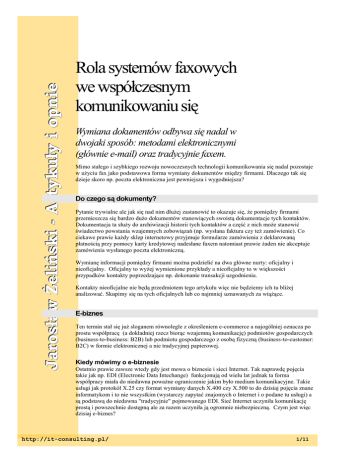 Jarosław Żeliński - Artykuły i opnie Rola systemów faxowych we współczesnym komunikowaniu się Wymiana dokumentów odbywa się nadal w dwojaki sposób: metodami elektronicznymi (głównie e-mail) oraz tradycyjnie faxem. Mimo stałego i szybkiego rozwoju nowoczesnych technologii komunikowania się nadal pozostaje w użyciu fax jako podstawowa forma wymiany dokumentów między firmami. Dlaczego tak się dzieje skoro np. poczta elektroniczna jest pewniejsza i wygodniejsza? Do czego są dokumenty? Pytanie trywialne ale jak się nad nim dłużej zastanowić to okazuje się, że pomiędzy firmami przemieszcza się bardzo dużo dokumentów stanowiących swoistą dokumentacje tych kontaktów. Dokumentacja ta służy do archiwizacji historii tych kontaktów a część z nich może stanowić świadectwo powstania wzajemnych zobowiązań (np. wysłana faktura czy też zamówienie). Co ciekawe prawie każdy sklep internetowy przyjmuje formularze zamówienia z deklarowaną płatnością przy pomocy karty kredytowej nadesłane faxem natomiast prawie żaden nie akceptuje zamówienia wysłanego poczta elektroniczną. Wymianę informacji pomiędzy firmami można podzielić na dwa główne nurty: oficjalny i nieoficjalny. Oficjalny to wyżej wymienione przykłady a nieoficjalny to w większości przypadków kontakty poprzedzające np. dokonanie transakcji uzgodnienia. Kontakty nieoficjalne nie będą przedmiotem tego artykułu więc nie będziemy ich tu bliżej analizować. Skupimy się na tych oficjalnych lub co najmniej uznawanych za wiążące. E-biznes Ten termin stał się już sloganem równolegle z określeniem e-commerce a najogólniej oznacza po prostu współpracę (a dokładniej rzecz biorąc wzajemną komunikację) podmiotów gospodarczych (business-to-business: B2B) lub podmiotu gospodarczego z osobą fizyczną (business-to-customer: B2C) w formie elektronicznej a nie tradycyjnej papierowej. Kiedy mówimy o e-biznesie Ostatnio prawie zawsze wtedy gdy jest mowa o biznesie i sieci Internet. Tak naprawdę pojęcia takie jak np. EDI (Electronic Data Intechange) funkcjonują od wielu lat jednak ta forma współpracy miała do niedawna poważne ograniczenie jakim było medium komunikacyjne. Takie usługi jak protokół X.25 czy format wymiany danych X.400 czy X.500 to do dzisiaj pojęcia znane informatykom i to nie wszystkim (wystarczy zapytać znajomych o Internet i o podane tu usługi) a są podstawą do niedawna "tradycyjnie" pojmowanego EDI. Sieć Internet uczyniła komunikację prostą i powszechnie dostępną ale za razem uczyniła ją ogromnie niebezpieczną. Czym jest więc dzisiaj e-biznes? http://it-consulting.pl/ 1/11 Rola systemów faxowych we współczesnym komunikowaniu się Sprzedaż detaliczna B2C to najlepiej znana część elektronicznego biznesu bo najwięcej się o niej pisze. Prowadzona jest praktycznie w całości z pomocą sieci Internet gdyż jest to jedyne publicznie dostępne masowe medium komunikacyjne. Równolegle promowany jest dostęp do zasobów sieciowych z pomocą telefonów komórkowych (WAP) ale obecnie liczba osób mających dostęp do sieci tą metodą jest o kilka rzędów mniejsza od użytkowników komputerów PC dlatego nadal jest to medium eksperymentalne. Niezależnie od tego jakie wielkości obrotów na tym rynku podawane są w prasie stanowią one śladowy ułamek ogólnej sprzedaży detalicznej (prowadzonej tradycyjnymi metodami). Utrudnieniami wzrostu tej metody sprzedaży są przyzwyczajenia do osobistego kontaktu ze sprzedawcą, traktowanie przez wielu ludzi wyjścia na zakupy jako rodzaj spędzania wolnego czasu oraz, chyba najważniejszy, ograniczone zaufanie do podawania w sieci numeru własnej karty kredytowej. Zaufanie to zmniejsza się dodatkowo wraz z doniesieniami o kradzieżach tych numerów. Kolejnym efektem ograniczonego zaufania do tej metody robienia zakupów jest wielkość pieniędzy jaką jesteśmy w stanie powierzyć sieci Internet. Statystyki wskazują, że 60% wartości sprzedaży detalicznej to produkty o wartości nie przekraczającej w przybliżeniu $100. Można więc uznać, że granicą kompromisu pomiędzy chęcią dokonania zakupu a ryzykowaną kwotą jest wartość zakupu wynosząca ok. $50. Badania ankietowe przeprowadzone w Polsce przez CDM Pekao S.A. wykazują podobne rezultaty: największa cześć badanych, kilkanaście procent, polskich internautów deklaruje chęć zakupu w Internecie książek i pracy. Na drugiej pozycji są produkty RTV/AGD lecz tylko niecałe 5%procent internautów deklaruje chęć ich zakupu w sieci. Współpraca pomiędzy firmami czyli e-biznes kategorii B2B W tej sferze ostrożność jest jeszcze większa. W przypadku indywidualnych zakupów (B2C) decyzje o metodzie zakupu i rodzaju płatności podejmuje kupujący jednoosobowo niejako "na poczekaniu". Zupełnie inaczej wygląda podejmowanie decyzji w firmach. Zawsze są to decyzje podejmowane gremialnie co powoduje, że czas jej podjęcia jest dłuższy a wymagany stopień zaufania do kontrahenta i metody zaciągania zobowiązań musi być znacznie większy. Przyczyna tego zjawiska jest prosta: decyzje dotyczą znacznie większych kwot. W efekcie stajemy przez koniecznością podjęcia trudnej decyzji o długoterminowych skutkach co owocuje wyborem rozwiązania dającego akceptowalne ryzyko. Gdzie tu jest dokument? Każdą transakcję należy w końcu sfinalizować w postaci złożonego zamówienia z określeniem sposobu dokonania płatności. W przypadku sprzedaży detalicznej dominującą metodą jest płatność z pomocą karty kredytowej. Polega to na wypełnieniu odpowiedniego formularza zawierającego między innymi dane zamawiającego oraz rodzaj i numer karty kredytowej, dane te z formularza są http://it-consulting.pl/ 19 września 2007 2/11 Rola systemów faxowych we współczesnym komunikowaniu się przesyłane przez sieć do serwera firmy prowadzącej sklep. Odbywa się to z pomocą kodowanego połączenia jednak należy mieć 