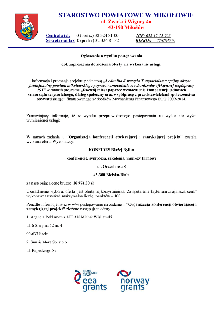 STAROSTWO POWIATOWE W MIKOŁOWIE ul. Żwirki i Wigury 4a 43-190 Mikołów Centrala tel. 0 (prefix) 32 324 81 00 Sekretariat fax 0 (prefix) 32 324 81 32 NIP: 635-15-75-953 REGON: 276284779 Ogłoszenie o wyniku postępowania dot. zaproszenia do złożenia oferty na wykonanie usługi: informacja i promocja projektu pod nazwą „J-ednolita S-trategia T-erytorialna = spójny obszar funkcjonalny powiatu mikołowskiego poprzez wzmocnienie mechanizmów efektywnej współpracy JST” w ramach programu „Rozwój miast poprzez wzmocnienie kompetencji jednostek samorządu terytorialnego, dialog społeczny oraz współpracę z przedstawicielami społeczeństwa obywatelskiego” finansowanego ze środków Mechanizmu Finansowego EOG 2009-2014. Zamawiający informuje, iż w wyniku przeprowadzonego postępowania na wykonanie wyżej wymienionej usługi: W ramach zadania 1 "Organizacja konferencji otwierającej i zamykającej projekt" została wybrana oferta Wykonawcy: KONFIDES Błażej Bylica konferencje, sympozja, szkolenia, imprezy firmowe ul. Orzechowa 8 43-300 Bielsko-Biała za następującą cenę brutto: 16 974,00 zł Uzasadnienie wyboru: oferta jest ofertą najkorzystniejszą. Za spełnienie kryterium „najniższa cena” wykonawca uzyskał maksymalna liczbę punktów – 100. Ponadto informujemy iż w w/w postępowaniu na zadanie 1 "Organizacja konferencji otwierającej i zamykającej projekt" złożono następujące oferty: 1. Agencja Reklamowa APLAN Michał Wisilewski ul. 6 Sierpnia 52 m. 4 90-637 Łódź 2. Sun & More Sp. z o.o. ul. Rapackiego 8c 71-467 Szczecin 3. VIS-MEDIA s.c. Grzegorz Kamiński, Iwona Kamińska Wielka Nieszawka, ul. Złota 7 87-165 Cierpice 4. Agencja Reklamowa FORMIND Sp. z o.o. ul. Kościuszki 6/5 40-049 Katowice 5. DIALOG AGENCJA PR Gumułka sp. k. ul. Matejki 4 40-077 Katowice 6. Grupa PRC Sp. z o.o. ul. Szpitalna 3 41-250 Czeladź W ramach zadania 2 "Stworzenie strony www wraz z obsługą i hostingiem przez okres realizacji projektu" została wybrana oferta Wykonawcy: VIS-MEDIA s.c. Grzegorz Kamiński, Iwona Kamińska Wielka Nieszawka, ul. Złota 7 87-165 Cierpice za następującą cenę brutto: 3 137,00 zł Uzasadnienie wyboru: oferta jest ofertą najkorzystniejszą. Za spełnienie kryterium „najniższa cena” wykonawca uzyskał maksymalna liczbę punktów – 100. Ponadto informujemy iż w w/w postępowaniu na zadanie 2 " Stworzenie strony www wraz z obsługą i hostingiem przez okres realizacji projektu " złożono następujące oferty: 1. Agencja Reklamowa APLAN Michał Wisilewski ul. 6 Sierpnia 52 m. 4 90-637 Łódź 2. sm32STUDIO Marek Mucharski ul. Grapa 10 34-300 Żywiec 3. Sun & More Sp. z o.o. ul. Rapackiego 8c 71-467 Szczecin 4. CONTICOM Anna Cecot ul. Morska 222/11 81-006 Gdynia 5. Agencja Reklamowa FORMIND Sp. z o.o. ul. Kościuszki 6/5 40-049 Katowice 6. KONFIDES Błażej Bylica konferencje, sympozja, szkolenia, imprezy firmowe ul. Orzechowa 8 43-300 Bielsko-Biała 7. DIALOG AGENCJA PR Gumułka sp. k. ul. Matejki 4 40-077 Katowice 8. Internet Assets sp. z o.o. ul. Traktorowa 126 91-204 Łódź 9. Grupa PRC Sp. z o.o. ul. Szpitalna 3 41-250 Czeladź W ramach zadania 3 "Wykonanie i montaż tablic informacyjnych i pamiątkowych" została wybrana oferta Wykonawcy: KONFIDES Błażej Bylica konferencje, sympozja, szkolenia, imprezy firmowe ul. Orzechowa 8 43-300 Bielsko-Biała za następującą cenę brutto: 2 952,00 zł Uzasadnienie wyboru: oferta jest ofertą najkorzystniejszą. Za spełnienie kryterium „najniższa cena” wykonawca uzyskał maksymalna liczbę punktów – 100. Ponadto informujemy iż w w/w postępowaniu na zadanie 3 " Wykonanie i montaż tablic informacyjnych i pamiątkowych" złożono następujące oferty: 1. Agencja Reklamowa APLAN Michał Wisilewski ul. 6 Sierpnia 52 m. 4 90-637 Łódź 2. Sun & More Sp. z o.o. ul. Rapackiego 8c 71-467 Szczecin 3. VIS-MEDIA s.c. Grzegorz Kamiński, Iwona Kamińska Wielka Nieszawka, ul. Złota 7 87-165 Cierpice 4. Agencja Reklamowa FORMIND Sp. z o.o. ul. Kościuszki 6/5 40-049 Katowice 5. DIALOG AGENCJA PR Gumułka sp. k. ul. Matejki 4 40-077 Katowice 6. Grupa PRC Sp. z o.o. ul. Szpitalna 3 41-250 Czeladź W ramach zadania 4 " Wydruk materiałów informacyjnych na potrzeby projektu " została wybrana oferta Wykonawcy: VIS-MEDIA s.c. Grzegorz Kamiński, Iwona Kamińska Wielka Nieszawka, ul. Złota 7 87-165 Cierpice za następującą cenę brutto: 3 000,00 zł Uzasadnienie wyboru: oferta jest ofertą najkorzystniejszą. Za spełnienie kryterium „najniższa cena” wykonawca uzyskał maksymalna liczbę punktów – 100. Ponadto informujemy iż w w/w postępowaniu na zadanie 4 " Wydruk materiałów informacyjnych na potrzeby projektu" złożono następujące oferty: 1. Agencja Reklamowa APLAN Michał Wisilewski ul. 6 Sierpnia 52 m. 4 90-637 Łódź 2. Sun & More Sp. z o.o. ul. Rapackiego 8c 71-467 Szczecin 3. Agencja Reklamowa FORMIND Sp. z o.o. ul. Kościuszki 6/5 40-049 Katowice 4. KONFIDES Błażej Bylica konferencje, sympozja, szkolenia, imprezy firmowe ul. Orzechowa 8 43-300 Bielsko-Biała 5. DIALOG AGENCJA PR Gumułka sp. k. ul. Matejki 4 40-077 Katowice 6. Grupa PRC Sp. z o.o. ul. Szpitalna 3 41-250 Czeladź