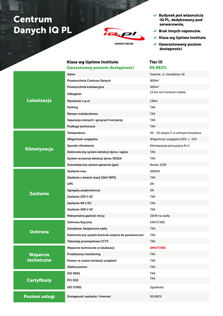 Budynek jest własnościa IQ PL, dedykowany pod serwerownie, Centrum DanychIQ PL Brak innych najemców. Klasa wg Uptime Institute ZAWSZE ONLINE Klasa wg Uptime Institute Gwaratowny poziom dostępności Tier III 99,982% Adres Gdańsk, ul. Geodetów 16 Powierzchnia Centrum Danych 800m2 Powierzchnia kolokacyjna 400m2 Odległość Lokalizacja Klimatyzacja Zasilanie Ochrona Wsparcie t echniczne Certyfikaty Poziom usługi Gwarantowany poziom dostępności 13 km od Centrum miasta Wysokość n.p.m 130m Parking TAK Rampa rozładunkowa TAK Separacja zimnych i gorących korytarzy TAK Podłoga techniczna TAK Temperatura 20 - 25 stopni C w zimnym korytarzu Wilgotność względna Wilgotność względna 50% +- 15% Sposób chłodzenia Klimatyzacja precyzyjna N+1 Elektroniczny system detekcji dymu i ognia TAK System wczesnej detekcji dymu VESDA TAK Automatyczny system gaszenia (gaz) Novec 1230 Zasilanie max. 500kW Zasilenie z dwóch stacji 15kV (RPZ) TAK UPS 2N Agregaty prądotwórcze 2N Zasilanie 230 V AC TAK Zasilanie 48 V DC TAK Zasilanie 400 V AC TAK Maksymalna gęstość mocy 15kW na szafę Ochrona fizyczna 24H/7/365 Zamykane, bezpieczne szafy TAK Elektroniczny system kontroli wejścia do pomieszczeń TAK Telewizja przemysłowa CCTV TAK Wsparcie techniczne w lokalizacji 24H/7/365 Proaktywny monitoring TAK Pomoc w czasie instalacji urządzeń TAK Zdalna pomoc TAK ISO 9001 TAK PCI DSS TAK ISO 27001 Zgodność Dostępność zasilania / Internet 99,982%