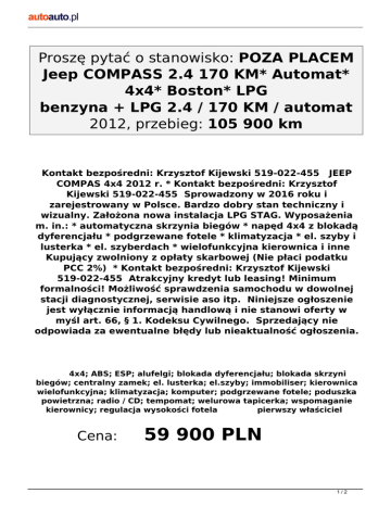 Proszę pytać o stanowisko: POZA PLACEM Jeep COMPASS 2.4 170 KM* Automat* 4x4* Boston* LPG benzyna + LPG 2.4 / 170 KM / automat 2012, przebieg: 105 900 km Kontakt bezpośredni: Krzysztof Kijewski 519-022-455 JEEP COMPAS 4x4 2012 r. * Kontakt bezpośredni: Krzysztof Kijewski 519-022-455 Sprowadzony w 2016 roku i zarejestrowany w Polsce. Bardzo dobry stan techniczny i wizualny. Założona nowa instalacja LPG STAG. Wyposażenia m. in.: * automatyczna skrzynia biegów * napęd 4x4 z blokadą dyferencjału * podgrzewane fotele * klimatyzacja * el. szyby i lusterka * el. szyberdach * wielofunkcyjna kierownica i inne Kupujący zwolniony z opłaty skarbowej (Nie płaci podatku PCC 2%) * Kontakt bezpośredni: Krzysztof Kijewski 519-022-455 Atrakcyjny kredyt lub leasing! Minimum formalności! Możliwość sprawdzenia samochodu w dowolnej stacji diagnostycznej, serwisie aso itp. Niniejsze ogłoszenie jest wyłącznie informacją handlową i nie stanowi oferty w myśl art. 66, § 1. Kodeksu Cywilnego. Sprzedający nie odpowiada za ewentualne błędy lub nieaktualność ogłoszenia. 4x4; ABS; ESP; alufelgi; blokada dyferencjału; blokada skrzyni biegów; centralny zamek; el. lusterka; el.szyby; immobiliser; kierownica wielofunkcyjna; klimatyzacja; komputer; podgrzewane fotele; poduszka powietrzna; radio / CD; tempomat; welurowa tapicerka; wspomaganie kierownicy; regulacja wysokości fotela pierwszy właściciel Cena: 59 900 PLN 1/2 brutto Opiekun: Krzysztof Kijewski +48 519 022 455 Al. Krakowska 178, Punkt C 2/2