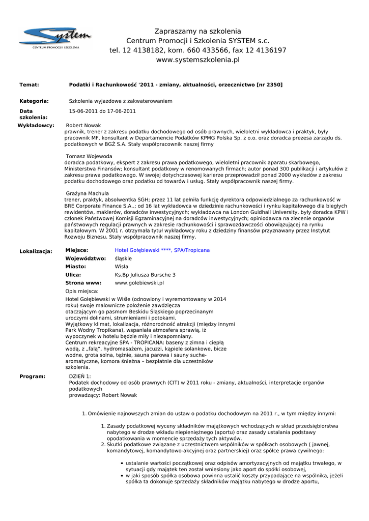 Zapraszamy na szkolenia Centrum Promocji i Szkolenia SYSTEM s.c. tel. 12 4138182, kom. 660 433566, fax 12 4136197 www.systemszkolenia.pl Temat: Podatki i Rachunkowość '2011 - zmiany, aktualności, orzecznictwo [nr 2350] Kategoria: Szkolenia wyjazdowe z zakwaterowaniem Data szkolenia: 15-06-2011 do 17-06-2011 Wykładowcy: Robert RobertNowak Nowak prawnik, prawnik,trener trenerzzzakresu zakresupodatku podatkudochodowego dochodowegood odosób osóbprawnych, prawnych,wieloletni wieloletniwykładowca wykładowcai ipraktyk, praktyk,były były pracownik pracownikMF, MF,konsultant konsultantwwDepartamencie DepartamenciePodatków PodatkówKPMG KPMGPolska PolskaSp. Sp.zzo.o. o.o.oraz orazdoradca doradcaprezesa prezesazarządu zarząduds. ds. podatkowych podatkowychwwBGŻ BGŻS.A. S.A.Stały Staływspółpracownik współpracowniknaszej naszejfirmy firmy Tomasz TomaszWojewoda Wojewoda doradca doradcapodatkowy, podatkowy,ekspert ekspertzzzakresu zakresuprawa prawapodatkowego, podatkowego,wieloletni wieloletnipracownik pracownikaparatu aparatuskarbowego, skarbowego, Ministerstwa MinisterstwaFinansów; Finansów;konsultant konsultantpodatkowy podatkowywwrenomowanych renomowanychfirmach; firmach;autor autorponad ponad300 300publikacji publikacjii iartykułów artykułówzz zakresu zakresuprawa prawapodatkowego. podatkowego.WWswojej swojejdotychczasowej dotychczasowejkarierze karierzeprzeprowadził przeprowadziłponad ponad2000 2000wykładów wykładówzzzakresu zakresu podatku podatkudochodowego dochodowegooraz orazpodatku podatkuod odtowarów towarówi iusług. usług.Stały Staływspółpracownik współpracowniknaszej naszejfirmy. firmy. Grażyna GrażynaMachula Machula trener, trener,praktyk, praktyk,absolwentka absolwentkaSGH; SGH;przez przez11 11lat latpełniła pełniłafunkcję funkcjędyrektora dyrektoraodpowiedzialnego odpowiedzialnegoza zarachunkowość rachunkowośćww BRE BRECorporate CorporateFinance FinanceS.A..; S.A..;od od16 16lat latwykładowca wykładowcawwdziedzinie dziedzinierachunkowości rachunkowościi irynku rynkukapitałowego kapitałowegodla dlabiegłych biegłych rewidentów, rewidentów,maklerów, maklerów,doradców doradcówinwestycyjnych; inwestycyjnych;wykładowca wykładowcana naLondon LondonGuidhall GuidhallUniversity, University,były byłydoradca doradcaKPW KPWi i członek członekPaństwowej PaństwowejKomisji KomisjiEgzaminacyjnej Egzaminacyjnejna nadoradców doradcówinwestycyjnych; inwestycyjnych;opiniodawca opiniodawcana nazlecenie zlecenieorganów organów państwowych państwowychregulacji regulacjiprawnych prawnychwwzakresie zakresierachunkowości rachunkowościi isprawozdawczości sprawozdawczościobowiązującej obowiązującejna narynku rynku kapitałowym. kapitałowym.WW2001 2001r.r.otrzymała otrzymałatytuł tytułwykładowcy wykładowcyroku rokuzzdziedziny dziedzinyfinansów finansówprzyznawany przyznawanyprzez przezInstytut Instytut Rozwoju RozwojuBiznesu. Biznesu.Stały Staływspółpracownik współpracowniknaszej naszejfirmy. firmy. Lokalizacja: Miejsce: Hotel Gołębiewski ****, SPA/Tropicana Miejsce: Hotel Gołębiewski ****, SPA/Tropicana Województwo: Województwo: śląskie śląskie Miasto: Wisła Miasto: Wisła Ulica: Ulica: Strona www: Strona www: Ks.Bp Juliusza Bursche 33 Ks.Bp Juliusza Bursche www.golebiewski.pl www.golebiewski.pl Opis miejsca: Opis miejsca: Hotel Gołębiewski ww Wiśle (odnowiony i wyremontowany ww 2014 Hotel Gołębiewski Wiśle (odnowiony i wyremontowany 2014 roku) swoje malownicze położenie zawdzięcza roku) swoje malownicze położenie zawdzięcza otaczającym gogo pasmom Beskidu Śląskiego poprzecinanym otaczającym pasmom Beskidu Śląskiego poprzecinanym uroczymi dolinami, strumieniami i potokami. uroczymi dolinami, strumieniami i potokami. Wyjątkowy klimat, lokalizacja, różnorodność atrakcji (między innymi Wyjątkowy klimat, lokalizacja, różnorodność atrakcji (między innymi Park Wodny Tropikana), wspaniała atmosfera sprawią, iż iż Park Wodny Tropikana), wspaniała atmosfera sprawią, wypoczynek ww hotelu będzie miły i niezapomniany. wypoczynek hotelu będzie miły i niezapomniany. Centrum rekreacyjne SPA - TROPICANA: baseny z zimna i ciepłą Centrum rekreacyjne SPA - TROPICANA: baseny z zimna i ciepłą wodą, z „falą”, hydromasażem, jacuzzi, kąpiele solankowe, bicze wodą, z „falą”, hydromasażem, jacuzzi, kąpiele solankowe, bicze wodne, grota solna, tężnie, sauna parowa i sauny suchewodne, grota solna, tężnie, sauna parowa i sauny suchearomatyczne, komora śnieżna – bezpłatnie dla uczestników aromatyczne, komora śnieżna – bezpłatnie dla uczestników szkolenia. szkolenia. Program: DZIEŃ 1: Podatek dochodowy od osób prawnych (CIT) w 2011 roku - zmiany, aktualności, interpretacje organów podatkowych prowadzący: Robert Nowak 1. Omówienie najnowszych zmian do ustaw o podatku dochodowym na 2011 r., w tym między innymi: 1. Zasady podatkowej wyceny składników majątkowych wchodzących w skład przedsiębiorstwa nabytego w drodze wkładu niepieniężnego (aportu) oraz zasady ustalania podstawy opodatkowania w momencie sprzedaży tych aktywów. 2. Skutki podatkowe związane z uczestnictwem wspólników w spółkach osobowych ( jawnej, komandytowej, komandytowo-akcyjnej oraz partnerskiej) oraz spółce prawa cywilnego: ustalanie wartości początkowej oraz odpisów amortyzacyjnych od majątku trwałego, w sytuacji gdy majątek ten został wniesiony jako aport do spółki osobowej, w jaki sposób spółka osobowa powinna ustalić koszty przypadające na wspólnika, jeżeli spółka ta dokonuje sprzedaży składników majątku nabytego w drodze aportu, zasady ustalania przychodu wspólnika spółki osobowej w przypadku wystąpienia wspólnika z takiej spółki oraz jej likwidacji, zasady ustalania przychodów oraz kosztów podatkowych, w przypadku odpłatnego zbycia składników majątkowych, otrzymanych od spółki osobowej w następstwie wystąpienia wspólnik