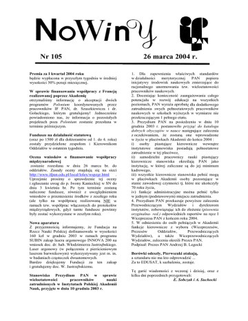 Nr 105 Premia za I kwartał 2004 roku będzie wypłacona w przyszłym tygodniu w średniej wysokości 50% pensji miesięcznej. W sprawie finansowania współpracy z Francją realizowanej poprzez Akademię otrzymaliśmy informację o akceptacji dwóch programów Polonium koordynowanych przez pracowników IF PAN, dr. Szuszkiewicza i dr. Gołackiego, którym gratulujemy! Jednocześnie powiadomiono nas, że informacja o pozostałych projektach poza Polonium zostanie przesłana w terminie późniejszym. Fundusze na działalność statutową (oraz po 1500 zł dla doktorantów od 1. do 4. roku) zostały przydzielone zespołom i Kierownikom Oddziałów w ostatnim tygodniu. Ocena wniosków o finansowanie współpracy międzynarodowej zostanie rozesłana w dniu 26 marca br. do oddziałów. Zasady oceny znajdują się na sieci http://www.ifpan.edu.pl/local/lolex/wspzgr.html . Uprzejmie prosimy o sprawdzenie tej oceny i zgłaszanie uwag do p. Iwony Kanieckiej w SN do dnia 3 kwietnia br. Po tym terminie zostaną naliczone fundusze, również z uwzględnieniem wniosków o przeniesienie środków z zeszłego roku (ale tylko na współpracę realizowaną NIE w ramach tzw. współprac włączonych do protokołów międzyrządowych, gdyż tamte fundusze powinny były zostać wykorzystane w zeszłym roku). Nowa aparatura Z przyjemnością informujemy, że Fundacja na Rzecz Nauki Polskiej dofinansowała w wysokości 160 kzł w grudniu 2003 w ramach programu SUBIN zakup lasera argonowego INNOVA 200 na wniosek doc. dr. hab. Włodzimierza Jastrzębskiego. Laser argonowy (w połączeniu z pierścieniowym laserem barwnikowym) wykorzystywany jest m. in. w badaniach cząsteczek dwuatomowych. Bardzo dziękujemy Fundacji za ten zakup i gratulujemy doc. W. Jastrzębskiemu. Stanowisko Prezydium PAN w sprawie wieloetatowości pracowników nauki zatrudnionych w Instytutach Polskiej Akademii Nauk, przyjęte w dniu 10 grudnia 2003 r. 26 marca 2004 r. 1. Dla zapewnienia właściwych standardów w działalności merytorycznej PAN popiera inicjatywy środowisk naukowych zmierzające do racjonalnego unormowania tzw. wieloetatowości pracowników naukowych. 2. Doceniając konieczność zaangażowania całego potencjału w rozwój edukacji na wszystkich poziomach, PAN wyraża aprobatę dla dodatkowego zatrudnienia swych pełnoetatowych pracowników naukowych w szkołach wyższych w wymiarze nie przekraczającym 1 pełnego etatu. 3. Prezydium PAN na posiedzeniu w dniu 10 grudnia 2003 r. postanowiło przyjąć do katalogu dobrych obyczajów w nauce następujące zalecenia z oczekiwaniem, że zostaną one wprowadzone w życie w placówkach Akademii do końca 2004 : i) osoby piastujące kierownicze wewnątrz instytutowe stanowiska posiadają pełnoetatowe zatrudnienie w tej placówce, ii) samodzielni pracownicy nauki piastujący kierownicze stanowiska określają PAN jako instytucję, w której zaliczane są do jej minimum kadrowego, iii) wszystkie kierownicze stanowiska pełnić mogą w placówkach Akademii osoby pozostające w stanie zawodowej czynności tj. które nie ukończyły 70 roku życia, iv) funkcje administracyjne można pełnić tylko w jednym (podstawowym) miejscu zatrudnienia. 4. Prezydium PAN przekazuje powyższe zalecenia Przewodniczącym Wydziałów i dyrektorom instytutów, zobowiązując ich do złożenie (pisownia oryginalna- red.) odpowiednich raportów na ręce I Wiceprezesa PAN z końcem roku 2004. 5. W odniesieniu do osób pełniących w Akademii funkcje kierownicze z wyboru (Wiceprezesów, Prezesów Oddziałów, Przewodniczących Wydziałów), a także Wiceprzewodniczących Wydziałów, zalecenia określi Prezes PAN. Podpisał: Prezes PAN Andrzej B. Legocki Borówki odeszły, Pierwszaki atakują, a sztandaru nie ma kto odprowadzić ... Za to EDUSAT, k sazhaleniu, zostaje. Tę garść wiadomości z wczoraj i dzisiaj, oraz z kilku dni poprzednich przygotowali: E. Sobczak i A. Suchocki