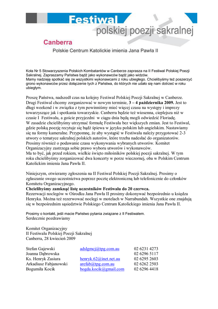 Koła Nr 5 Stowarzyszenia Polskich Kombatantów w Canberze zaprasza na II Festiwal Polskiej Poezji Sakralnej. Zapraszamy Państwa bądź jako wykonawców bądź jako widzów. Mamy nadzieję spotkać się ze wszystkimi wykonawcami z roku ubiegłego. Chcielibyśmy też poszerzyć grono wykonawców przez dołączenie tych z Państwa, do których nie udało się nam dotrzeć w roku ubiegłym. Proszę Państwa, nadszedł czas na kolejny Festiwal Polskiej Poezji Sakralnej w Canberze. Drugi Festiwal chcemy zorganizować w nowym terminie, 3 – 4 października 2009. Jest to długi weekend i w związku z tym powinniśmy mieć więcej czasu na występy i imprezy towarzyszące jak i spotkania towarzyskie. Canberra będzie też wiosenna, cieplejsza niż w czasie I Festiwalu, a goście przyjezdni w ciągu dnia będą mogli odwiedzić Floriadę. W zasadzie chcielibyśmy utrzymać formułę Festiwalu bez większych zmian. Jest to Festiwal, gdzie polską poezję recytuje się bądź śpiewa w języku polskim lub angielskim. Nastawiamy się na formy kameralne. Przypomnę, że aby wystąpić w Festiwalu należy przygotować 2-3 utwory o tematyce sakralnej polskich autorów, które trzeba nadesłać do organizatorów. Prosimy również o podawanie czasu wykonywania wybranych utworów. Komitet Organizacyjny zastrzega sobie prawo wyboru utworów i wykonawców. Ma to być, jak przed rokiem, wielkie święto miłośników polskiej poezji sakralnej. W tym roku chcielibyśmy zorganizować dwa koncerty w porze wieczornej, oba w Polskim Centrum Katolickim imienia Jana Pawła II. Niniejszym, otwieramy zgłoszenia na II Festiwal Polskiej Poezji Sakralnej. Prosimy o zgłaszanie swego uczestnictwa poprzez pocztę elektroniczną lub telefonicznie do członków Komitetu Organizacyjnego. Chcielibyśmy zamknąć listę uczestników Festiwalu do 20 czerwca. Rezerwacji noclegów w Ośrodku Jana Pawła II prosimy dokonywać bezpośrednio u księdza Henryka. Można też rezerwować noclegi w motelach w Narrabundah. Wszystkie one znajdują się w bezpośrednim sąsiedztwie Polskiego Centrum Katolickiego imienia Jana Pawła II. Prosimy o kontakt, jeśli macie Państwo pytania związane z II Festiwalem. Serdecznie pozdrawiamy Komitet Organizacyjny II Festiwalu Polskiej Poezji Sakralnej Canberra, 28 kwiecień 2009 Stefan Gajewski Joanna Dąbrowska Ks. Henryk Zasiura Arkadiusz Fabjanowski Bogumiła Kocik [email protected] [email protected] [email protected] [email protected] 02 6231 4273 02 6296 5117 02 6295 2603 02 6262 2503 02 6296 4418