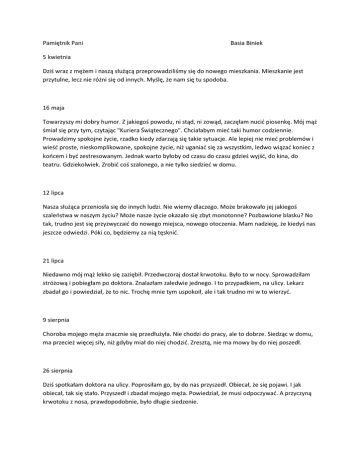 Pamiętnik Pani Basia Biniek 5 kwietnia Dziś wraz z mężem i naszą służącą przeprowadziliśmy się do nowego mieszkania. Mieszkanie jest przytulne, lecz nie różni się od innych. Myślę, że nam się tu spodoba. 16 maja Towarzyszy mi dobry humor. Z jakiegoś powodu, ni stąd, ni zowąd, zaczęłam nucić piosenkę. Mój mąż śmiał się przy tym, czytając "Kuriera Świątecznego". Chciałabym mieć taki humor codziennie. Prowadzimy spokojne życie, rzadko kiedy zdarzają się takie sytuacje. Ale lepiej nie mieć problemów i wieść proste, nieskomplikowane, spokojne życie, niż uganiać się za wszystkim, ledwo wiązać koniec z końcem i być zestresowanym. Jednak warto byłoby od czasu do czasu gdzieś wyjść, do kina, do teatru. Gdziekolwiek. Zrobić coś szalonego, a nie tylko siedzieć w domu. 12 lipca Nasza służąca przeniosła się do innych ludzi. Nie wiemy dlaczego. Może brakowało jej jakiegoś szaleństwa w naszym życiu? Może nasze życie okazało się zbyt monotonne? Pozbawione blasku? No tak, trudno jest się przyzwyczaić do nowego miejsca, nowego otoczenia. Mam nadzieję, że kiedyś nas jeszcze odwiedzi. Póki co, będziemy za nią tęsknić. 21 lipca Niedawno mój mąż lekko się zaziębił. Przedwczoraj dostał krwotoku. Było to w nocy. Sprowadziłam stróżową i pobiegłam po doktora. Znalazłam zaledwie jednego. I to przypadkiem, na ulicy. Lekarz zbadał go i powiedział, że to nic. Trochę mnie tym uspokoił, ale i tak trudno mi w to wierzyć. 9 sierpnia Choroba mojego męża znacznie się przedłużyła. Nie chodzi do pracy, ale to dobrze. Siedząc w domu, ma przecież więcej siły, niż gdyby miał do niej chodzić. Zresztą, nie ma mowy by do niej poszedł. 26 sierpnia Dziś spotkałam doktora na ulicy. Poprosiłam go, by do nas przyszedł. Obiecał, że się pojawi. I jak obiecał, tak się stało. Przyszedł i zbadał mojego męża. Powiedział, że musi odpoczywać. A przyczyną krwotoku z nosa, prawdopodobnie, było długie siedzenie. 11 września Od jakiegoś czasu u męża występują stany nerwowe. Nie wiem, co to może być. Mąż jest czerwony, gorący, jak gdyby wulkan, z którego zaraz miałaby wypłynąć lawa. Kompletnie nie mam pojęcia, co robić. 24 września Niedawno wymyśliłam, jak dodać otuchy mężowi. Od kilku dni skracam mu pasek w kamizelce. Myślę, że pomoże mu to chociaż trochę, w walce z chorobą. No i mam nadzieję, że jeśli się dowie, to nie obrazi się na mnie. Przecież chcę dla niego jak najlepiej. 29 września Tak jak ostatnio mówiłam, cały czas skracałam pasek w kamizelce męża. Dziś jednak usłyszałam od niego, że on sam ściągał pasek, by mnie uspokoić. No cóż, widać, oboje chcieliśmy dobrze. To się nazywa miłość! ☺ 7 października Drogi Pamiętniku. Kilka godzin temu pożegnałam mojego męża. Jeśli masz jakiś kontakt z Panem Bogiem, to zapytaj Go, dlaczego on zmarł. Bardzo Cię o to proszę. Trudno pogodzić jest się z myślą, że kogoś, kogo kochamy, już nigdy więcej nie zobaczymy. Szczególnie, jeśli chcemy z tą osobą spędzić resztę życia. A przecież jesteśmy młodzi... 3 listopada Właśnie sprzedałam wszystkie rzeczy z mieszkania. Stół, dwa łóżka, szafę, wszystko!!! Zostawiłam tylko kamizelkę i swoją parasolkę, które też zapewne sprzedam. 18 listopada Powoli staram się przyzwyczajać do tego, że, wstając, nie mam komu powiedzieć "dzień dobry". Nie mam komu zrobić śniadania, nie mam komu uprasować koszuli. Ale minęły już prawie dwa miesiące. Czuję, że staję się coraz silniejsza. Uczucie to, nie jest jednak tak mocne, jakie chciałabym, żeby było. Czas się więc wyprowadzić. Dlaczego? To proste. Wszystko tutaj przypomina mi ukochanego. Dziś sprzedałam swój parasol i kamizelkę mojego męża. Zamknęłam drzwi na klucz, który oddałam stróżowi. Chyba nie jesteście zdziwieni moją decyzją? Tak czy siak, zostałam skazana tylko i wyłącznie na siebie. Wraz z tą decyzją postanowiłam zakończyć pisanie tutaj. Żegnajcie.