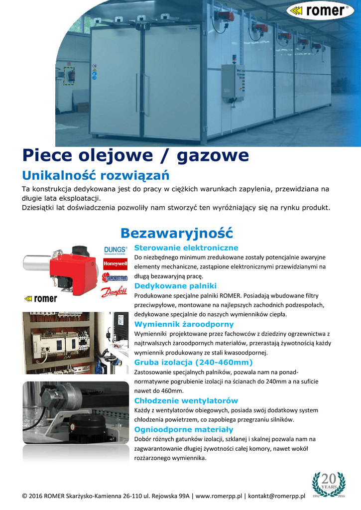 Producent wysokiej jakości lakierni proszkowych Piece olejowe / gazowe Unikalność rozwiązań Ta konstrukcja dedykowana jest do pracy w ciężkich warunkach zapylenia, przewidziana na długie lata eksploatacji. Dziesiątki lat doświadczenia pozwoliły nam stworzyć ten wyróżniający się na rynku produkt. Bezawaryjność Sterowanie elektroniczne Do niezbędnego minimum zredukowane zostały potencjalnie awaryjne elementy mechaniczne, zastąpione elektronicznymi przewidzianymi na długą bezawaryjną pracę. Dedykowane palniki Produkowane specjalne palniki ROMER. Posiadają wbudowane filtry przeciwpyłowe, montowane na najlepszych zachodnich podzespołach, dedykowane specjalnie do naszych wymienników ciepła. Wymiennik żaroodporny Wymienniki projektowane przez fachowców z dziedziny ogrzewnictwa z najtrwalszych żaroodpornych materiałów, przerastają żywotnością każdy wymiennik produkowany ze stali kwasoodpornej. Gruba izolacja (240-460mm) Zastosowanie specjalnych palników, pozwala nam na ponadnormatywne pogrubienie izolacji na ścianach do 240mm a na suficie nawet do 460mm. Chłodzenie wentylatorów Każdy z wentylatorów obiegowych, posiada swój dodatkowy system chłodzenia powietrzem, co zapobiega przegrzaniu silników. Ognioodporne materiały Dobór różnych gatunków izolacji, szklanej i skalnej pozwala nam na zagwarantowanie długiej żywotności całej komory, nawet wokół rozżarzonego wymiennika. © 2016 ROMER Skarżysko-Kamienna 26-110 ul. Rejowska 99A | www.romerpp.pl | [email protected] Producent wysokiej jakości lakierni proszkowych Oszczędność Wysokiej sprawności wymienniki (do 90%) Przeciwprądowa rurowa konstrukcja. Aż trzy komory mieszające. Bezpośrednie umiejscowienie w komorze grzejnej. Ogromna powierzchnia oddawania ciepła. Wydłużona droga odmuchu, dobrany opór. Te wszystkie aspekty składają się na znakomitą wydajność naszej konstrukcji. Rozbudowane sterowanie PLC kontroluje temperaturowym zakresem pracy wymiennika, co dodatkowo poprawia jego sprawność. Minimalizacja mostów cieplnych Konstrukcja ramy jest w całości spawana, zmontowana. Nie składamy jej z części jak niektórzy producenci, uniemożliwia to powstawanie mostków cieplnych. Izolacja układana jest na zakład, co zapobiega rozszczelnieniom. Precyzja Wymuszony obieg powietrza Piec posiada możliwość ustawienia dawki powietrza. Za pomocą wyprofilowanych oczek na ścianach odbywa się kalibracja pieca po procesie kontroli jakości. Wentylator zasysając powietrze wtłacza je ścianami wymuszając jego obieg, odpowiadając za odpowiedni rozrzut w swojej strefie. Rozdzielenie wymienników Rozwiązanie gwarantuje idealny rozrzut temperatur niespotykany wręcz w standardowych konstrukcjach. Zwykły piec konkurencji posiada z reguły jeden ogromny wymiennik, wówczas droga którą powietrze musi przebyć jest dłuższa co pogarsza parametry rozrzutu temperatur. Nie wykonalnym jest w zwykłym piecu rozprowadzić równomiernie ciepło w najdalsze jego zakątki korzystając z jednego olbrzymiego rozgrzanego do czerwoności źródła. Nasze unikalne rozwiązanie opiera się o więcej źródeł o małej mocy. wymienniki powielane są na długości konstrukcji zachowując przy tym stały odstęp. Nie przegrzewają pieca miejscowo, grzeją go równomiernie ze stałym przyrostem. Zwiększenie ich ilości pozwala na skrócenie długości przebytej przez powietrze drogi i świetnie poprawia rozrzut temperatur. Rozrzut temperatury Jesteśmy w stanie osiągnąć rozrzut (I) klasy spełniający normy AMS2750 wymagany w przemyśle aeronautycznym czy motoryzacyjnym, co stawia nas w światowej czołówce producentów. Każda ze stref jest osobno monitorowana i posiada swój niezależny zespół grzejny. © 2016 ROMER Skarżysko-Kamienna 26-110 ul. Rejowska 99A | www.romerpp.pl | [email protected] Producent wysokiej jakości lakierni proszkowych Przyjemność użytkowania Panel dotykowy Interfejs z kolorowym wyświetlaczem monitoruje poprawne działanie każdego z podzespołów i np. analizując przyrost temperatury informuje o stanie procesu i czasie do jego końca. Programowanie krzywych Sterownik umożliwia wcześniejsze zdefiniowanie do 5 programów, i krzywych do 5 zdarzeń czasowo - temperaturowych. Historia procesów Każdy z cykli jest rejestrowany, z możliwością odtworzenia jego przebiegu. Licznik spalania Analizując ustawienia palników przeliczane jest zużycie paliwa. Bezpieczeństwo Nierdzewne poszycie W miejscach narażonych na wyższe temperatury poszycie zostało wykonane z gatunków nierdzewnych gwarantujących długą eksploatację. Wymienniki przeciwwybuchowe Wymienniki ciepła posiadają klapy przeciwwybuchowe które w razie niespodziewanej detonacji paliwa otwierają się automatycznie zapobiegając jego rozerwaniu. Zamknięcia przeciwwybuchowe (PN-EN 746-1) Drzwi pieca posiadają również zabezpieczenia przeciwwybuchowe. Zamknięcia na drzwiach automatycznie otworzą się w razie detonacji w komorze pieca. Otwarcie od wewnątrz Zastosowanie naszych unikalnych zamknięć umożliwia otworzenie drzwi od środka, w przypadku kiedy w komorze zostanie zamknięty człowiek. Jest to wymagane normą w razie gdy komora jest na tyle duża, że da się do niej wejść. Deklaracja zgodności CE Nasze piece zostały zaprojektowane pod kątem spełnienia wszelkich niezbędnych norm europejskich w zakresie bezpieczeństwa użytkowania. Dopuszczone są do obrotu na terenie unii europejskiej i wystawiamy na nie deklarację zgodności CE. Elastyczność Dwie niezależne komory Istnieje możliwość korzystania z dwóch komór niezależnie. Sterownik umożliwia programowanie niezależnych procesów. Dla przykładu w pierwszej komorze może odbywać się proces wypalania, natomiast w drugiej suszenia z zupełnie innymi parametrami, w innym czasie. © 2016 ROMER Skarżysko-Kamienna 26-110 ul. Rejowska 99A | www.romerpp.pl | [email protected]