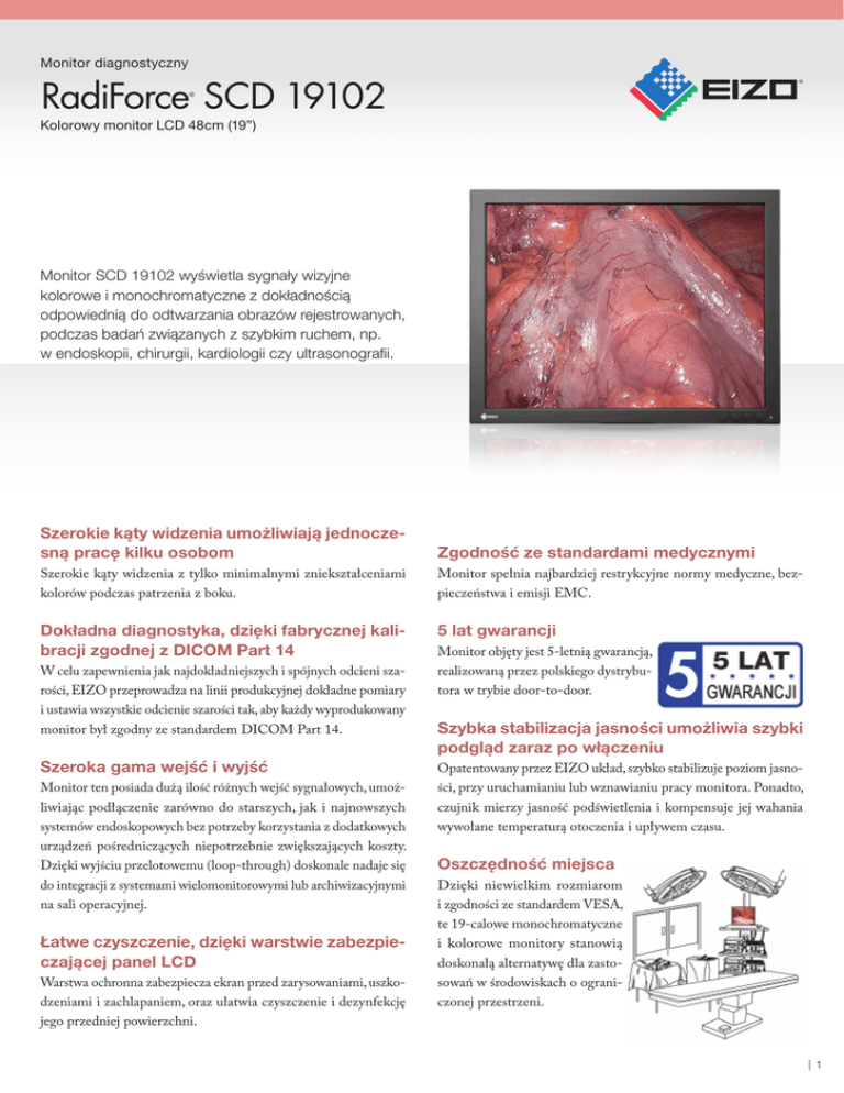 Monitor diagnostyczny RadiForce SCD 19102 ® Kolorowy monitor LCD 48cm (19”) Monitor SCD 19102 wyświetla sygnały wizyjne kolorowe i monochromatyczne z dokładnością odpowiednią do odtwarzania obrazów rejestrowanych, podczas badań związanych z szybkim ruchem, np. w endoskopii, chirurgii, kardiologii czy ultrasonografii. Szerokie kąty widzenia umożliwiają jednoczesną pracę kilku osobom Zgodność ze standardami medycznymi Szerokie kąty widzenia z tylko minimalnymi zniekształceniami kolorów podczas patrzenia z boku. Monitor spełnia najbardziej restrykcyjne normy medyczne, bezpieczeństwa i emisji EMC. Dokładna diagnostyka, dzięki fabrycznej kalibracji zgodnej z DICOM Part 14 5 lat gwarancji W celu zapewnienia jak najdokładniejszych i spójnych odcieni szarości, EIZO przeprowadza na linii produkcyjnej dokładne pomiary i ustawia wszystkie odcienie szarości tak, aby każdy wyprodukowany monitor był zgodny ze standardem DICOM Part 14. Szeroka gama wejść i wyjść Monitor ten posiada dużą ilość różnych wejść sygnałowych, umożliwiając podłączenie zarówno do starszych, jak i najnowszych systemów endoskopowych bez potrzeby korzystania z dodatkowych urządzeń pośredniczących niepotrzebnie zwiększających koszty. Dzięki wyjściu przelotowemu (loop-through) doskonale nadaje się do integracji z systemami wielomonitorowymi lub archiwizacyjnymi na sali operacyjnej. Łatwe czyszczenie, dzięki warstwie zabezpieczającej panel LCD Warstwa ochronna zabezpiecza ekran przed zarysowaniami, uszkodzeniami i zachlapaniem, oraz ułatwia czyszczenie i dezynfekcję jego przedniej powierzchni. Monitor objęty jest 5-letnią gwarancją, realizowaną przez polskiego dystrybutora w trybie door-to-door. Szybka stabilizacja jasności umożliwia szybki podgląd zaraz po włączeniu Opatentowany przez EIZO układ, szybko stabilizuje poziom jasności, przy uruchamianiu lub wznawianiu pracy monitora. Ponadto, czujnik mierzy jasność podświetlenia i kompensuje jej wahania wywołane temperaturą otoczenia i upływem czasu. Oszczędność miejsca Dzięki niewielkim rozmiarom i zgodności ze standardem VESA, te 19-calowe monochromatyczne i kolorowe monitory stanowią doskonałą alternatywę dla zastosowań w środowiskach o ograniczonej przestrzeni. | 1 RadiForce SCD 19102 ® Wyraźny obraz, dzięki konwersji I/P Aby zminimalizować artefakty, zazwyczaj występujące na ruchomych obrazach po przeprowadzeniu konwersji I/P (z przeplotem / progresywny), model ten wykrywa ilość zmian zachodzących w czasie odtwarzania pomiędzy kolejnymi klatkami i stosuje idealnie do nich dobraną siłę korekcji. Kompatybilność z uchwytami i ramionami VESA Zgodność ze standardem VESA umożliwia montowanie do posiadanych już akcesoriów. 2 | RadiForce SCD 19102 ® Specyfikacja techniczna Dostępne modele SCD 19102 D: ze stopką SCD 19102 C: bez stopki SCD 19102 CP: bez stopki, z panelem ochronnym Kolor obudowy Panel antracytowy szary Typ IPS Podświetlenie CCFL Rozmiar 48 cm / 19” (481 mm) Rozdzielczość naturalna 1280 x 1024 (5:4) Aktywna powierzchnia wyświetlania 376 x 301 mm (poziomo × pionowo) Sygnał wideo Zasilanie Dodatkowe cechy i funkcje Wielkość piksela 0.294 x 0.294 mm Paleta odcieni szarości 10-bit (DisplayPort): 1,024 z palety 16,369 odcieni 8-bit: 256 z palety 16,369 odcieni Paleta barw 16.77 milionów Kąty widzenia (poziomo / pionowo) 170°, 170° Jasność (typowa) 280 cd/m² Jasność (zalecana do kalibracji) - Kontrast (typowy) 600:1 Czas reakcji (typowy) 28 ms (On/Off) Wejścia sygnałowe BNC (Composite) x 1, DVI-I x 1, D-Sub mini 15 pin (Separate Sync, Composite Sync, SoG) x 1, S-Video x 1 Złacza wyjściowe (Loop Through) – Cyfrowa częstotliwość odświeżania 31 - 100 kHz, 48 - 85 Hz Analogowa częstotliwość odświeżania 24 - 100 kHz, 48 -120 Hz Synchronizacja – Wymagania energetyczne AC 100 - 120 V, 200 - 240 V: 50 / 60 Hz Maksymalne zużycie energii 58 W Typowe zużycie energii - Tryb oszczędności energii Mniej niż 8 W Zarządzanie energią Cyfrowe: DVI DMPM, Analogowe: VESA DPM Język menu OSD angielski, niemiecki Czujnik Specyfikacja fizyczna Waga netto SCD 19102 D: 10.7 kg SCD 19102 C: 6.4 kg SCD 19102 CP: 7 kg Waga netto (bez podstawy) - Wymagania środowiskowe – Certyfikaty i standardy* CE (Medical Device Directive), EN60601-1, UL60601-1, CSA C22.2 No. 601-1, FCC-A, RoHS, China RoHS, WEEE, CCC, GOST-R. Dostarczane akcesoria Kabel zasilający, kable sygnałowe (DVI-D - DVI-D, BNC - D-Sub mini 15 pin), płyta z instrukcją obsługi, karta gwarancyjna Gwarancja 5 lat * Najświeższych informacji udziela lokalny dystrybutor EIZO. Autoryzowany dystrybutor produktów EIZO w Polsce Alstor sp. j. ul. Wenecka 12, 03-244 Warszawa tel. (022) 510 24 00 www.eizo.pl, [email protected]