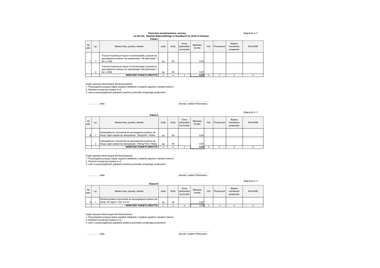 Formularz asortymentowo- cenowy na leki dla Szpitala Wojewódzkiego w Suwałkach na okres 6 miesięcy Pakiet I Nr pak. 1 Lp. Nazwa leku, postać, dawka Jedn Ilość 1 Toxinum botulinicum typum A ad iniectabile; proszek do sporządzenia roztworu do wstrzykiwań; 100 jednostek; 1 fiol. a 100j. op 50 Toxinum botulinicum typum A ad iniectabile; proszek do sporządzenia roztworu do wstrzykiwań; 500 jednostek; 1 fiol. a 500j. WARTOŚĆ PAKIETU BRUTTO: op x 50 x 2 Cena jednostko wa brutto Wartość brutto Załącznik nr 3 Vat Producent Nazwa handlowa preparatu Kod EAN x x x x 0,00 x 0,00 0,00 Część opisowo-informacyjna dla Wykonawców: 1. Poszczególne pozycje należy wypełnić dokładnie i czytelnie zgodnie z tytułami kolumn. 2. Wartości muszą być podane w zł. 3. Leki w poszczsególnych pakietach powinny pochodzić od jednego producenta ………………………………………… data: dnia ………………2011r. PODPIS ………………………………….. WYKONAWCY pieczęć i podpis Wykonawcy Załącznik nr 3 Pakiet II Nr pak. 2 Lp. 1 2 Nazwa leku, postać, dawka Jedn Ilość Carboplatinum, koncentrat do sporządzania roztworu do infuzji, bądź roztwór do wstrzykiwań; 50mg/5ml; 1fiolka op 40 Carboplatinum, koncentrat do sporządzania roztworu do infuzji, bądź roztwór do wstrzykiwań; 150mg/15ml; 1fiolka WARTOŚĆ PAKIETU BRUTTO: op x 40 x Cena jednostko wa brutto Wartość brutto Vat Producent Nazwa handlowa preparatu Kod EAN x x x x 0,00 x 0,00 0,00 Część opisowo-informacyjna dla Wykonawców: 1. Poszczególne pozycje należy wypełnić dokładnie i czytelnie zgodnie z tytułami kolumn. 2. Wartości muszą być podane w zł. 3. Leki i w poszczególnych pakietach powinny pochodzić od jednego producenta ………………………………………… data: dnia ………………2011r. PODPIS ………………………………….. WYKONAWCY pieczęć i podpis Wykonawcy Załącznik nr 3 Pakiet III Nr pak. 3 Lp. Nazwa leku, postać, dawka 1 Panitumumabum koncentrat do sporządzania roztworu do infuzji, 20 mg/ml 1 fiol. a 5 ml WARTOŚĆ PAKIETU BRUTTO: Jedn Ilość op x 40 x Cena jednostko wa brutto x Wartość brutto 0,00 0,00 Vat Producent Nazwa handlowa preparatu Kod EAN x x x x Część opisowo-informacyjna dla Wykonawców: 1. Poszczególne pozycje należy wypełnić dokładnie i czytelnie zgodnie z tytułami kolumn. 2. Wartości muszą być podane w zł. 3. Leki i w poszczególnych pakietach powinny pochodzić od jednego producenta ………………………………………… data: dnia ………………2011r. PODPIS ………………………………….. WYKONAWCY pieczęć i podpis Wykonawcy Załącznik nr 3 Pakiet IV Nr pak. 4 Lp. 1 Nazwa leku, postać, dawka Caelyx, koncentrat do sporządzania roztworu do infuzji, 2 mg/ml 1 fiol. a 10 ml WARTOŚĆ PAKIETU BRUTTO: Jedn Ilość op x 40 x Cena jednostko wa brutto x Wartość brutto 0,00 0,00 Vat Producent Nazwa handlowa preparatu Kod EAN x x x x Część opisowo-informacyjna dla Wykonawców: 1. Poszczególne pozycje należy wypełnić dokładnie i czytelnie zgodnie z tytułami kolumn. 2. Wartości muszą być podane w zł. 3. Leki i w poszczególnych pakietach powinny pochodzić od jednego producenta ………………………………………… data: dnia ………………2011r. PODPIS ………………………………….. WYKONAWCY pieczęć i podpis Wykonawcy Załącznik nr 3 Pakiet V Nr pak. 5 Lp. Nazwa leku, postać, dawka 1 Dacarbazinum, proszek do sporządzania roztworu do wstrzykiwań i infuzji, 100 mg; opakowanie 10 fiol. 2 Dacarbazinum, proszek do sporządzania roztworu do wstrzykiwań i infuzji, 200 mg; opakowanie 10 fiol. WARTOŚĆ PAKIETU BRUTTO: Jedn Ilość op 12 op x 12 x Cena jednostko wa brutto x Wartość brutto 0,00 Vat x Nazwa handlowa Producent preparatu x x Kod EAN x Część opisowo-informacyjna dla Wykonawców: 1. Poszczególne pozycje należy wypełnić dokładnie i czytelnie zgodnie z tytułami kolumn. 2. Wartości muszą być podane w zł. 3. Leki i w poszczególnych pakietach powinny pochodzić od jednego producenta ………………………………………… data: dnia ………………2011r. PODPIS ………………………………….. WYKONAWCY pieczęć i podpis Wykonawcy Załącznik nr 3 Pakiet VI Nr pak. 6 Lp. 1 2 Nazwa leku, postać, dawka Docetaxelum, koncentrat do sporządzania roztworu do infuzji, 20 mg, 1 fiolka Docetaxelum, koncentrat do sporządzania roztworu do infuzji, 80 mg, 1 fiolka WARTOŚĆ PAKIETU BRUTTO: Jedn Ilość op 70 op x 70 x Cena jednostko wa brutto Wartość brutto Vat Nazwa handlowa Producent preparatu Kod EAN 0,00 x 0,00 0,00 x x x x Część opisowo-informacyjna dla Wykonawców: 1. Poszczególne pozycje należy wypełnić dokładnie i czytelnie zgodnie z tytułami kolumn. 2. Wartości muszą być podane w zł. 3. Leki i w poszczególnych pakietach powinny pochodzić od jednego producenta UWAGA: 1. Zaoferowane leki muszą być zgodne z obowiązującą od dnia 01.07.2012r. listą leków refundowanych dostępnych w ramach programów lekowych oraz leków stosowanych w ramach chemioterapii. 2.Zamawiający wymaga umieszczenia kodu EAN – dotyczy leków objętych listą refundacyjną obowiązującą od dnia 01.07.2012r. i ujętych w programach lekowych oraz leków stosowanych w ramach chemioterapii ………………………………………… data: dnia ………………2011r. PODPIS ………………………………….. WYKONAWCY pieczęć i podpis Wykonawcy