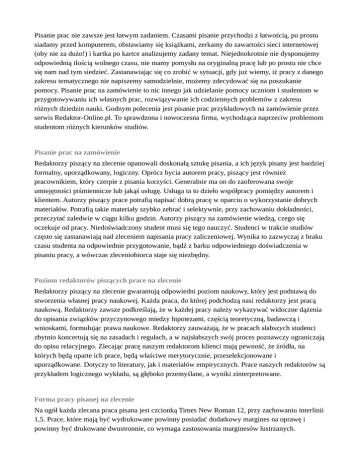 Pisanie prac nie zawsze jest łatwym zadaniem. Czasami pisanie przychodzi z łatwością, po prostu siadamy przed komputerem, obstawiamy się książkami, zerkamy do zawartości sieci internetowej (oby nie za dużo!) i kartka po kartce analizujemy zadany temat. Niejednokrotnie nie dysponujemy odpowiednią ilością wolnego czasu, nie mamy pomysłu na oryginalną pracę lub po prostu nie chce się nam nad tym siedzieć. Zastanawiając się co zrobić w sytuacji, gdy już wiemy, iż pracy z danego zakresu tematycznego nie napiszemy samodzielnie, możemy zdecydować się na poszukanie pomocy. Pisanie prac na zamówienie to nic innego jak udzielanie pomocy uczniom i studentom w przygotowywaniu ich własnych prac, rozwiązywanie ich codziennych problemów z zakresu różnych dziedzin nauki. Godnym polecenia jest pisanie prac przykładowych na zamówienie przez serwis Redaktor-Online.pl. To sprawdzona i nowoczesna firma, wychodząca naprzeciw problemom studentom różnych kierunków studiów. Pisanie prac na zamówienie Redaktorzy piszący na zlecenie opanowali doskonałą sztukę pisania, a ich język pisany jest bardziej formalny, uporządkowany, logiczny. Oprócz bycia autorem pracy, piszący jest również pracownikiem, który czerpie z pisania korzyści. Generalnie ma on do zaoferowana swoje umiejętności piśmiennicze lub jakąś usługę. Usługa ta to dzieło współpracy pomiędzy autorem i klientem. Autorzy piszący prace potrafią napisać dobrą pracę w oparciu o wykorzystanie dobrych materiałów. Potrafią takie materiały szybko zebrać i selektywnie, przy zachowaniu dokładności, przeczytać zaledwie w ciągu kilku godzin. Autorzy piszący na zamówienie wiedzą, czego się oczekuje od pracy. Niedoświadczony student musi się tego nauczyć. Studenci w trakcie studiów często się zastanawiają nad zleceniem napisania pracy zaliczeniowej. Wynika to zazwyczaj z braku czasu studenta na odpowiednie przygotowanie, bądź z barku odpowiedniego doświadczenia w pisaniu pracy, a wówczas zleceniobiorca staje się niezbędny. Poziom redaktorów piszących prace na zlecenie Redaktorzy piszący na zlecenie gwarantują odpowiedni poziom naukowy, który jest podstawą do stworzenia własnej pracy naukowej. Każda praca, do której podchodzą nasi redaktorzy jest pracą naukową. Redaktorzy zawsze podkreślają, że w każdej pracy należy wykazywać widoczne dążenia do opisania związków przyczynowego miedzy hipotezami, częścią teoretyczną, badawczą i wnioskami, formułując prawa naukowe. Redaktorzy zauważają, że w pracach słabszych studenci zbytnio koncertują się na zasadach i regułach, a w najsłabszych swój proces poznawczy ograniczają do opisu relacyjnego. Zlecając pracę naszym redaktorom klienci mają pewność, że źródła, na których będą oparte ich prace, będą właściwe merytorycznie, przeselekcjonowane i uporządkowane. Dotyczy to literatury, jak i materiałów empirycznych. Prace naszych redaktorów są przykładem logicznego wykładu, są głęboko przemyślane, a wyniki zinterpretowane. Forma pracy pisanej na zlecenie Na ogół każda zlecana praca pisana jest czcionką Times New Roman 12, przy zachowaniu interlinii 1,5. Prace, które mają być wydrukowane powinny posiadać dodatkowy margines na oprawę i powinny być drukowane dwustronnie, co wymaga zastosowania marginesów lustrzanych. Wszystkie elementy w pracy są wygenerowane automatycznie, tak by w sposób łatwy klient mógł zaktualizować wszystkie spisy. Prace oddawane przez naszych redaktorów są zawsze bardzo czytelne i przejrzyste, przy zastosowaniu indywidualnych preferencji klienta w zakresie formatowania teksu. Każda praca jest wysyłana w dowolnie wskazanym formacie, przy czym prace tekstowe na ogół są wysyłane w formacie word (*.docx), lub word 1997-2003 (*.doc). Do każdej pracy dołączane są aneksy i lista źródeł, w ten sposób klient może łatwo przyswoić ich treść.