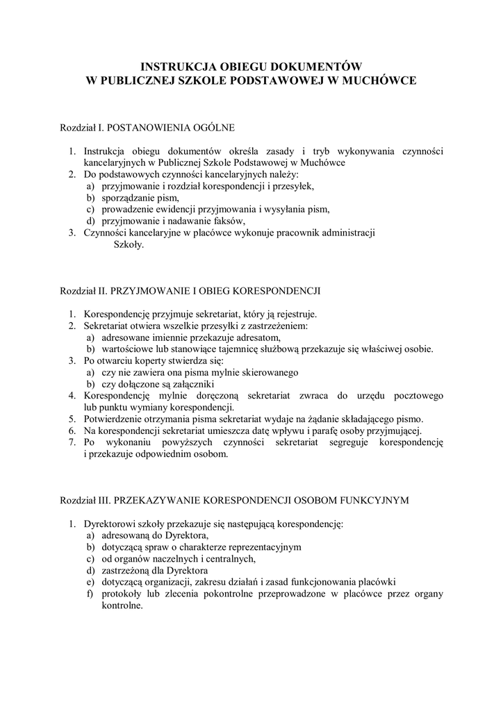 INSTRUKCJA OBIEGU DOKUMENTÓW W PUBLICZNEJ SZKOLE PODSTAWOWEJ W MUCHÓWCE Rozdział I. POSTANOWIENIA OGÓLNE 1. Instrukcja obiegu dokumentów określa zasady i tryb wykonywania czynności kancelaryjnych w Publicznej Szkole Podstawowej w Muchówce 2. Do podstawowych czynności kancelaryjnych należy: a) przyjmowanie i rozdział korespondencji i przesyłek, b) sporządzanie pism, c) prowadzenie ewidencji przyjmowania i wysyłania pism, d) przyjmowanie i nadawanie faksów, 3. Czynności kancelaryjne w placówce wykonuje pracownik administracji Szkoły. Rozdział II. PRZYJMOWANIE I OBIEG KORESPONDENCJI 1. Korespondencję przyjmuje sekretariat, który ją rejestruje. 2. Sekretariat otwiera wszelkie przesyłki z zastrzeżeniem: a) adresowane imiennie przekazuje adresatom, b) wartościowe lub stanowiące tajemnicę służbową przekazuje się właściwej osobie. 3. Po otwarciu koperty stwierdza się: a) czy nie zawiera ona pisma mylnie skierowanego b) czy dołączone są załączniki 4. Korespondencję mylnie doręczoną sekretariat zwraca do urzędu pocztowego lub punktu wymiany korespondencji. 5. Potwierdzenie otrzymania pisma sekretariat wydaje na żądanie składającego pismo. 6. Na korespondencji sekretariat umieszcza datę wpływu i parafę osoby przyjmującej. 7. Po wykonaniu powyższych czynności sekretariat segreguje korespondencję i przekazuje odpowiednim osobom. Rozdział III. PRZEKAZYWANIE KORESPONDENCJI OSOBOM FUNKCYJNYM 1. Dyrektorowi szkoły przekazuje się następującą korespondencję: a) adresowaną do Dyrektora, b) dotyczącą spraw o charakterze reprezentacyjnym c) od organów naczelnych i centralnych, d) zastrzeżoną dla Dyrektora e) dotyczącą organizacji, zakresu działań i zasad funkcjonowania placówki f) protokoły lub zlecenia pokontrolne przeprowadzone w placówce przez organy kontrolne. Rozdział IV. CZYNNOŚCI KANCELARYJNE SEKRETARIATU 1. Pracownik sekretariatu przyjmuje korespondencję, rejestruje ją oraz przekazuje odpowiednio: dyrektorowi lub jego zastępcy. Rozdział V. WEWNĘTRZNY OBIEG DOKUMENTÓW 1. W Publicznej Szkole Podstawowej w Muchówce obowiązuje system kancelaryjny oparty na rzeczowym wykazie akt. 2. Wykaz akt stanowi jednolitą, rzeczową klasyfikację akt powstającą w toku działalności placówki oraz zawiera jej klasyfikację archiwalną. 3. Akta jednorodne posiadają to samo hasło klasyfikacyjne i symbol liczbowy. 4. Oprócz haseł jednolity, rzeczowy wykaz akt zawiera oznaczenia kategorii archiwalnej akt. a) symbol „A” – dla oznaczenia kategorii materiałów archiwalnych posiadających wartość historyczną, b) symbol „B” – dla oznaczenia kategorii materiałów archiwalnych nie posiadających wartości historycznej c) do dokumentacji oznaczonej symbolem „B” dodaje się cyfry arabskie, które oznaczają liczbę lat przechowywania tej dokumentacji. 5. Dokumentacja oznaczona symbolem BE jest zaliczana do dokumentacji mającej krótkotrwałe znaczenie praktyczne. 6. Spis spraw zakłada się na każdy rok oddzielnie. Dopuszcza się prowadzenie teczek przez okres dłuższy niż jeden rok. 7. Spis spraw prowadzi się na specjalnych formularzach – rejestrach. 8. Znak sprawy jest stałą cechą rozpoznawczą sprawy i zawiera: a) symbol literowy placówki: PSP b) symbol liczbowy hasła wg jednolitego, rzeczowego wykazu akt c) kolejną liczbę pisma d) cyfrę oznaczającą rok /min. dwie ostatnie/. 9. Nie podlegają rejestracji: a) publikacje b) foldery reklamowe c) ogłoszenia i afisze itp. d) potwierdzenia odbioru e) faktury i inne dokumenty księgowe f) zaproszenia, życzenia i inne pisma o podobnym charakterze. Rozdział VI . ZAŁATWIANIE SPRAW 1. Przy pisemnym załatwianiu spraw stosuje się następujące formy: a) odręczną b) korespondencyjną c) inną /przy użyciu pieczęci z odpowiednim tekstem na formularzu/ 2. Załatwianie spraw może być: 1. tymczasowe, gdy zachodzi potrzeba postępowania wyjaśniającego 2. ostateczne 3. Przy sporządzaniu kopii dokumentu należy umieścić klauzulę „Za zgodność z oryginałem”, a także datę i podpis osoby stwierdzającej zgodność treści. 4. Sprawy załatwia się według kolejności ich wpływu i stopnia pilności. Każdą sprawę załatwia się oddzielnym pismem, nie łącząc z innymi sprawami nie mającymi z nią związku. 5. Pismo załatwiające sprawę powinno być pod względem formy zewnętrznej dostosowane do blankietów korespondencyjnych formatu A4 lub A5. Przy załatwianiu niektórych spraw wykorzystuje się druki i formularze przewidziane przepisami szczegółowymi. . Rozdział VII. WYSYŁANIE I DORĘCZANIE PISM. 1. Korespondencja może być przekazywana odbiorcy w postaci pisma wysłanego: a) przesyłką listową b) faksem c) pocztą elektroniczną KURATORIUM OŚWIATY DELEGATURA W Tarnowie al. Solidarności , 33-100 Tarnów / ZESPÓŁ WIZYTATORÓW w Bochni, ul. K. Wielkiego 2 dokumentacja związana z realizacją obowiązku szkolnego, sprawy związane z nadzorem pedagogicznym, sprawozdania itp./ Wydział Oświaty, Nowy Wiśnicz, ul. Rynek 38 - dokumenty związane ze sprawami kadr i płac - dokumenty dotyczące budżetu - plany związane z budżetem - dokumenty dotyczące inwentaryzacji - wszelkie rozliczenia kasowe Pozostałe dokumenty składa się w odpowiednich komórkach organizacyjnych Urzędu Miasta i Gminy Nowy Wiśnicz. 2. Pisma wysłane powinny być opatrzone pieczęciami i podpisami. 3. Sprawy załatwione wysyła się niezwłocznie. Rozdział VIII. PRZECHOWYWANIE AKT 1. Akta spraw przechowuje się w szkole oraz archiwum zakładowym. Rozdział IX. PRZEKAZYWANIE AKT DO ARCHIWUM ZAKŁADOWEGO 1. W celu przechowywania akt spraw ostatecznie zakończonych placówki prowadzą archiwa zakładowe. 2. Przekazywanie akt odbywa się na podstawie spisu po uporządkowaniu akt. 3. Przez uporządkowanie akt rozumie się: a) opisanie teczek na ich zewnętrznej stronie b) ponumerowanie teczek i wpisanie ich do rejestru archiwum 4. W razie likwidacji placówki prz