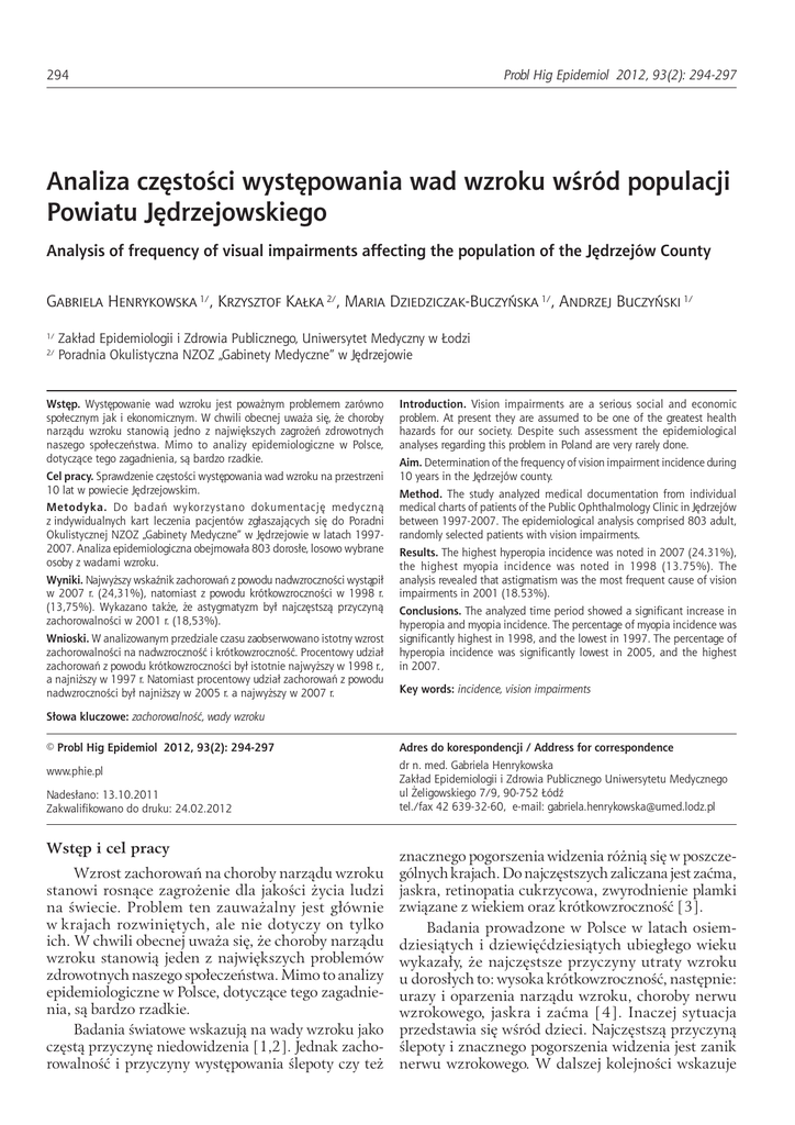294 Probl Hig Epidemiol 2012, 93(2): 294-297 Analiza częstości występowania wad wzroku wśród populacji Powiatu Jędrzejowskiego Analysis of frequency of visual impairments affecting the population of the Jędrzejów County Gabriela Henrykowska 1/, Krzysztof Kałka 2/, Maria Dziedziczak-Buczyńska 1/, Andrzej Buczyński 1/ 1/ 2/ Zakład Epidemiologii i Zdrowia Publicznego, Uniwersytet Medyczny w Łodzi Poradnia Okulistyczna NZOZ „Gabinety Medyczne” w Jędrzejowie Wstęp. Występowanie wad wzroku jest poważnym problemem zarówno społecznym jak i ekonomicznym. W chwili obecnej uważa się, że choroby narządu wzroku stanowią jedno z największych zagrożeń zdrowotnych naszego społeczeństwa. Mimo to analizy epidemiologiczne w Polsce, dotyczące tego zagadnienia, są bardzo rzadkie. Cel pracy. Sprawdzenie częstości występowania wad wzroku na przestrzeni 10 lat w powiecie Jędrzejowskim. Metodyka. Do badań wykorzystano dokumentację medyczną z indywidualnych kart leczenia pacjentów zgłaszających się do Poradni Okulistycznej NZOZ „Gabinety Medyczne” w Jędrzejowie w latach 19972007. Analiza epidemiologiczna obejmowała 803 dorosłe, losowo wybrane osoby z wadami wzroku. Wyniki. Najwyższy wskaźnik zachorowań z powodu nadwzroczności wystąpił w 2007 r. (24,31%), natomiast z powodu krótkowzroczności w 1998 r. (13,75%). Wykazano także, że astygmatyzm był najczęstszą przyczyną zachorowalności w 2001 r. (18,53%). Wnioski. W analizowanym przedziale czasu zaobserwowano istotny wzrost zachorowalności na nadwzroczność i krótkowzroczność. Procentowy udział zachorowań z powodu krótkowzroczności był istotnie najwyższy w 1998 r., a najniższy w 1997 r. Natomiast procentowy udział zachorowań z powodu nadwzroczności był najniższy w 2005 r. a najwyższy w 2007 r. Introduction. Vision impairments are a serious social and economic problem. At present they are assumed to be one of the greatest health hazards for our society. Despite such assessment the epidemiological analyses regarding this problem in Poland are very rarely done. Aim. Determination of the frequency of vision impairment incidence during 10 years in the Jędrzejów county. Method. The study analyzed medical documentation from individual medical charts of patients of the Public Ophthalmology Clinic in Jędrzejów between 1997-2007. The epidemiological analysis comprised 803 adult, randomly selected patients with vision impairments. Results. The highest hyperopia incidence was noted in 2007 (24.31%), the highest myopia incidence was noted in 1998 (13.75%). The analysis revealed that astigmatism was the most frequent cause of vision impairments in 2001 (18.53%). Conclusions. The analyzed time period showed a significant increase in hyperopia and myopia incidence. The percentage of myopia incidence was significantly highest in 1998, and the lowest in 1997. The percentage of hyperopia incidence was significantly lowest in 2005, and the highest in 2007. Key words: incidence, vision impairments Słowa kluczowe: zachorowalność, wady wzroku © Probl Hig Epidemiol 2012, 93(2): 294-297 www.phie.pl Nadesłano: 13.10.2011 Zakwalifikowano do druku: 24.02.2012 Wstęp i cel pracy Wzrost zachorowań na choroby narządu wzroku stanowi rosnące zagrożenie dla jakości życia ludzi na świecie. Problem ten zauważalny jest głównie w krajach rozwiniętych, ale nie dotyczy on tylko ich. W chwili obecnej uważa się, że choroby narządu wzroku stanowią jeden z największych problemów zdrowotnych naszego społeczeństwa. Mimo to analizy epidemiologiczne w Polsce, dotyczące tego zagadnienia, są bardzo rzadkie. Badania światowe wskazują na wady wzroku jako częstą przyczynę niedowidzenia [1,2]. Jednak zachorowalność i przyczyny występowania ślepoty czy też Adres do korespondencji / Address for correspondence dr n. med. Gabriela Henrykowska Zakład Epidemiologii i Zdrowia Publicznego Uniwersytetu Medycznego ul Żeligowskiego 7/9, 90-752 Łódź tel./fax 42 639-32-60, e-mail: [email protected] znacznego pogorszenia widzenia różnią się w poszczególnych krajach. Do najczęstszych zaliczana jest zaćma, jaskra, retinopatia cukrzycowa, zwyrodnienie plamki związane z wiekiem oraz krótkowzroczność [3]. Badania prowadzone w Polsce w latach osiemdziesiątych i dziewięćdziesiątych ubiegłego wieku wykazały, że najczęstsze przyczyny utraty wzroku u dorosłych to: wysoka krótkowzroczność, następnie: urazy i oparzenia narządu wzroku, choroby nerwu wzrokowego, jaskra i zaćma [4]. Inaczej sytuacja przedstawia się wśród dzieci. Najczęstszą przyczyną ślepoty i znacznego pogorszenia widzenia jest zanik nerwu wzrokowego. W dalszej kolejności wskazuje Henrykowska G i wsp. Analiza częstości występowania wad wzroku wśród populacji Powiatu Jędrzejowskiego się retinopatię wcześniaków, zaćmę obustronną, krótkowzroczność, wady wrodzone oraz zwyrodnienie siatkówki i jaskrę [5]. Obecnie, według danych szacunkowych, około 2,3 miliarda ludzi na świecie ma wady wzroku. Większość z nich mogłaby mieć lepszą ostrość wzroku po dobraniu odpowiedniej korekcji, co znacznie poprawiłoby ich jakość życia [6]. Biorąc pod uwagę powyższe dane zasadnym wydaje się przeprowadzenie dokładniejszych badań epidemiologicznych w populacji polskiej. Dlatego też celem pracy była analiza częstości występowania wad wzroku na przestrzeni 10 lat wśród wybranej grupy osób. Analizując występowanie ww. wad wzroku z podziałem na miesiące zaobserwowano znaczny wzrost zachorowalności z powodu starczowzroczności w miesiącach jesiennych i zimowych (10,88-21,06%). Natomiast w innych miesiącach rzadko przekraczała 5%. Krótkowzroczność rzadziej wykrywano w miesiącach od września do grudnia. U osób z astygmatyzmem najwyższą zachorowalność zaobserwowano w maju (13,81%), natomiast z powodu nadwzroczności w lutym (11,16%) (ryc. 3). 100 60 % 40 20 0 krótkowzroczność nadwzro