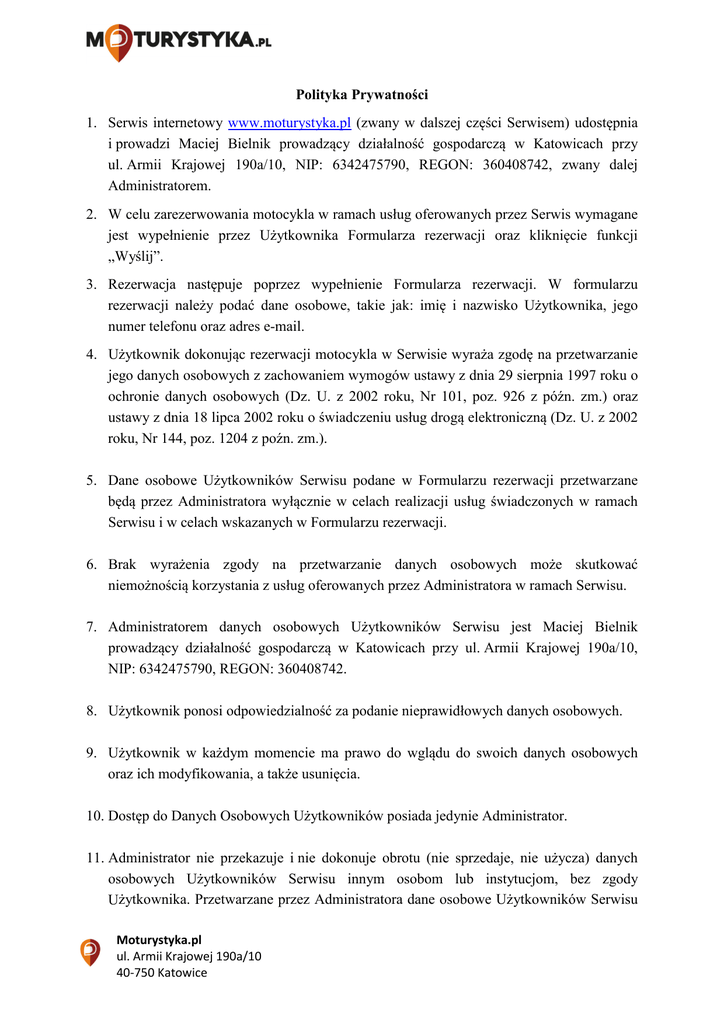 Polityka Prywatności 1. Serwis internetowy www.moturystyka.pl (zwany w dalszej części Serwisem) udostępnia i prowadzi Maciej Bielnik prowadzący działalność gospodarczą w Katowicach przy ul. Armii Krajowej 190a/10, NIP: 6342475790, REGON: 360408742, zwany dalej Administratorem. 2. W celu zarezerwowania motocykla w ramach usług oferowanych przez Serwis wymagane jest wypełnienie przez Użytkownika Formularza rezerwacji oraz kliknięcie funkcji „Wyślij”. 3. Rezerwacja następuje poprzez wypełnienie Formularza rezerwacji. W formularzu rezerwacji należy podać dane osobowe, takie jak: imię i nazwisko Użytkownika, jego numer telefonu oraz adres e-mail. 4. Użytkownik dokonując rezerwacji motocykla w Serwisie wyraża zgodę na przetwarzanie jego danych osobowych z zachowaniem wymogów ustawy z dnia 29 sierpnia 1997 roku o ochronie danych osobowych (Dz. U. z 2002 roku, Nr 101, poz. 926 z późn. zm.) oraz ustawy z dnia 18 lipca 2002 roku o świadczeniu usług drogą elektroniczną (Dz. U. z 2002 roku, Nr 144, poz. 1204 z poźn. zm.). 5. Dane osobowe Użytkowników Serwisu podane w Formularzu rezerwacji przetwarzane będą przez Administratora wyłącznie w celach realizacji usług świadczonych w ramach Serwisu i w celach wskazanych w Formularzu rezerwacji. 6. Brak wyrażenia zgody na przetwarzanie danych osobowych może skutkować niemożnością korzystania z usług oferowanych przez Administratora w ramach Serwisu. 7. Administratorem danych osobowych Użytkowników Serwisu jest Maciej Bielnik prowadzący działalność gospodarczą w Katowicach przy ul. Armii Krajowej 190a/10, NIP: 6342475790, REGON: 360408742. 8. Użytkownik ponosi odpowiedzialność za podanie nieprawidłowych danych osobowych. 9. Użytkownik w każdym momencie ma prawo do wglądu do swoich danych osobowych oraz ich modyfikowania, a także usunięcia. 10. Dostęp do Danych Osobowych Użytkowników posiada jedynie Administrator. 11. Administrator nie przekazuje i nie dokonuje obrotu (nie sprzedaje, nie użycza) danych osobowych Użytkowników Serwisu innym osobom lub instytucjom, bez zgody Użytkownika. Przetwarzane przez Administratora dane osobowe Użytkowników Serwisu Moturystyka.pl ul. Armii Krajowej 190a/10 40-750 Katowice mogą zostać udostępnione uprawnionym organom państwa na ich żądanie, na potrzeby prowadzonych przez nie postępowań lub osobom trzecim na podstawie orzeczeń organów państwa. 12. Administrator gromadzi informacje pozyskiwane automatycznie, dotyczące adresów IP Użytkowników odwiedzających Serwis i korzystających z usług świadczonych w ramach Serwisu. Zebrane w ten sposób informacje służą administrowaniu Serwisem, okresowym analizom statystyki odwiedzin, ustaleniu, które strony odwiedzane są najczęściej, określeniu poziomu funkcjonalności stron Serwisu. Informacje dotyczące IP Użytkowników mogą zostać przekazane uprawnionym organom państwa, na ich żądanie na potrzeby prowadzonych przez nie postępowań lub osobom trzecim na podstawie orzeczeń organów państwa. 13. Pytania i wątpliwości w zakresie polityki prywatności użytkownicy Serwisu mogą zgłaszać poprzez adres e-mail: [email protected] 14. W przypadku zmiany obowiązującej polityki prywatności, odpowiednie modyfikacje powyższych zasad zostaną udostępnione na stronie Serwisu. Moturystyka.pl ul. Armii Krajowej 190a/10 40-750 Katowice