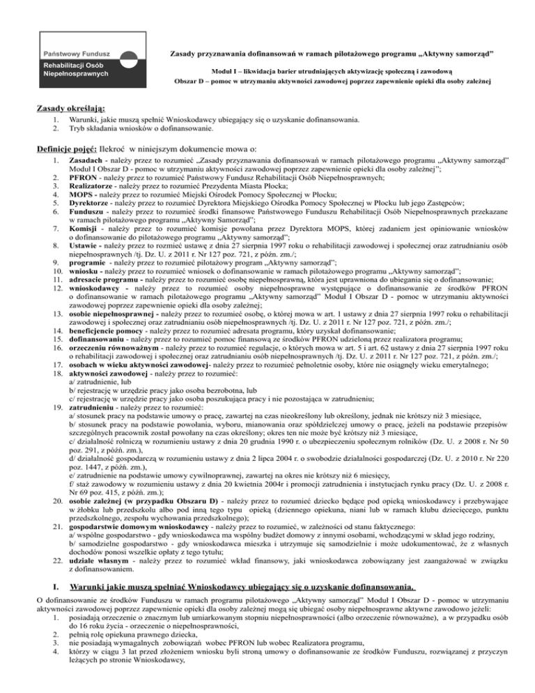Zasady przyznawania dofinansowań w ramach pilotażowego programu „Aktywny samorząd” Moduł I – likwidacja barier utrudniających aktywizację społeczną i zawodową Obszar D – pomoc w utrzymaniu aktywności zawodowej poprzez zapewnienie opieki dla osoby zależnej Zasady określają: 1. 2. Warunki, jakie muszą spełnić Wnioskodawcy ubiegający się o uzyskanie dofinansowania. Tryb składania wniosków o dofinansowanie. Definicje pojęć: Ilekroć w niniejszym dokumencie mowa o: 1. 2. 3. 4. 5. 6. 7. 8. 9. 10. 11. 12. 13. 14. 15. 16. 17. 18. 19. 20. 21. 22. I. Zasadach - należy przez to rozumieć „Zasady przyznawania dofinansowań w ramach pilotażowego programu „Aktywny samorząd” Moduł I Obszar D - pomoc w utrzymaniu aktywności zawodowej poprzez zapewnienie opieki dla osoby zależnej”; PFRON - należy przez to rozumieć Państwowy Fundusz Rehabilitacji Osób Niepełnosprawnych; Realizatorze - należy przez to rozumieć Prezydenta Miasta Płocka; MOPS - należy przez to rozumieć Miejski Ośrodek Pomocy Społecznej w Płocku; Dyrektorze - należy przez to rozumieć Dyrektora Miejskiego Ośrodka Pomocy Społecznej w Płocku lub jego Zastępców; Funduszu - należy przez to rozumieć środki finansowe Państwowego Funduszu Rehabilitacji Osób Niepełnosprawnych przekazane w ramach pilotażowego programu „Aktywny Samorząd”; Komisji - należy przez to rozumieć komisje powołana przez Dyrektora MOPS, której zadaniem jest opiniowanie wniosków o dofinansowanie do pilotażowego programu „Aktywny samorząd”; Ustawie - należy przez to rozmieć ustawę z dnia 27 sierpnia 1997 roku o rehabilitacji zawodowej i społecznej oraz zatrudnianiu osób niepełnosprawnych /tj. Dz. U. z 2011 r. Nr 127 poz. 721, z późn. zm./; programie - należy przez to rozumieć pilotażowy program „Aktywny samorząd”; wniosku - należy przez to rozumieć wniosek o dofinansowanie w ramach pilotażowego programu „Aktywny samorząd”; adresacie programu - należy przez to rozumieć osobę niepełnosprawną, która jest uprawniona do ubiegania się o dofinansowanie; wnioskodawcy - należy przez to rozumieć osoby niepełnosprawne występujące o dofinansowanie ze środków PFRON o dofinansowanie w ramach pilotażowego programu „Aktywny samorząd” Moduł I Obszar D - pomoc w utrzymaniu aktywności zawodowej poprzez zapewnienie opieki dla osoby zależnej; osobie niepełnosprawnej - należy przez to rozumieć osobę, o której mowa w art. 1 ustawy z dnia 27 sierpnia 1997 roku o rehabilitacji zawodowej i społecznej oraz zatrudnianiu osób niepełnosprawnych /tj. Dz. U. z 2011 r. Nr 127 poz. 721, z późn. zm./; beneficjencie pomocy - należy przez to rozumieć adresata programu, który uzyskał dofinansowanie; dofinansowaniu - należy przez to rozumieć pomoc finansową ze środków PFRON udzieloną przez realizatora programu; orzeczeniu równoważnym - należy przez to rozumieć regulacje, o których mowa w art. 5 i art. 62 ustawy z dnia 27 sierpnia 1997 roku o rehabilitacji zawodowej i społecznej oraz zatrudnianiu osób niepełnosprawnych /tj. Dz. U. z 2011 r. Nr 127 poz. 721, z późn. zm./; osobach w wieku aktywności zawodowej- należy przez to rozumieć pełnoletnie osoby, które nie osiągnęły wieku emerytalnego; aktywności zawodowej - należy przez to rozumieć: a/ zatrudnienie, lub b/ rejestrację w urzędzie pracy jako osoba bezrobotna, lub c/ rejestrację w urzędzie pracy jako osoba poszukująca pracy i nie pozostająca w zatrudnieniu; zatrudnieniu - należy przez to rozumieć: a/ stosunek pracy na podstawie umowy o pracę, zawartej na czas nieokreślony lub określony, jednak nie krótszy niż 3 miesiące, b/ stosunek pracy na podstawie powołania, wyboru, mianowania oraz spółdzielczej umowy o pracę, jeżeli na podstawie przepisów szczególnych pracownik został powołany na czas określony; okres ten nie może być krótszy niż 3 miesiące, c/ działalność rolniczą w rozumieniu ustawy z dnia 20 grudnia 1990 r. o ubezpieczeniu społecznym rolników (Dz. U. z 2008 r. Nr 50 poz. 291, z późń. zm.), d/ działalność gospodarczą w rozumieniu ustawy z dnia 2 lipca 2004 r. o swobodzie działalności gospodarczej (Dz. U. z 2010 r. Nr 220 poz. 1447, z późń. zm.), e/ zatrudnienie na podstawie umowy cywilnoprawnej, zawartej na okres nie krótszy niż 6 miesięcy, f/ staż zawodowy w rozumieniu ustawy z dnia 20 kwietnia 2004r i promocji zatrudnienia i instytucjach rynku pracy (Dz. U. z 2008 r. Nr 69 poz. 415, z późń. zm.); osobie zależnej (w przypadku Obszaru D) - należy przez to rozumieć dziecko będące pod opieką wnioskodawcy i przebywające w żłobku lub przedszkolu albo pod inną tego typu opieką (dziennego opiekuna, niani lub w ramach klubu dziecięcego, punktu przedszkolnego, zespołu wychowania przedszkolnego); gospodarstwie domowym wnioskodawcy - należy przez to rozumieć, w zależności od stanu faktycznego: a/ wspólne gospodarstwo - gdy wnioskodawca ma wspólny budżet domowy z innymi osobami, wchodzącymi w skład jego rodziny, b/ samodzielne gospodarstwo - gdy wnioskodawca mieszka i utrzymuje się samodzielnie i może udokumentować, że z własnych dochodów ponosi wszelkie opłaty z tego tytułu; udziale własnym - należy przez to rozumieć wkład finansowy, jaki wnioskodawca zobowiązany jest zaangażować w związku z dofinansowaniem. Warunki jakie muszą spełniać Wnioskodawcy ubiegający się o uzyskanie dofinansowania. O dofinansowanie ze środków Funduszu w ramach programu pilotażowego „Aktywny samorząd” Moduł I Obszar D - pomoc w utrzymaniu aktywności zawodowej poprzez zapewnienie opieki dla osoby zależnej mogą się ubiegać osoby niepełnosprawne aktywne zawodowo jeżeli: 1. posiadają orzeczenie o znacznym lub umiarkowanym stopniu niepełnosprawności (albo orzeczenie równoważne), a w przypadku osób do 16 roku życia - orzeczenie o niepełnosprawności, 2. pełnią rolę opiekuna prawnego dziecka, 3. nie posiadaj