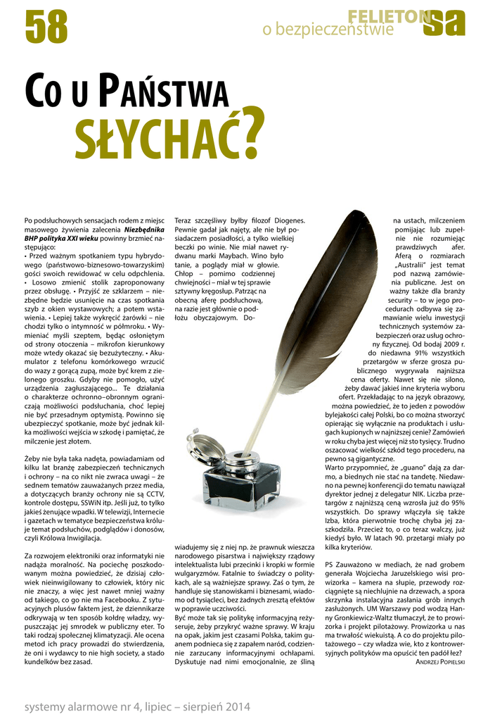 58 Felieton o bezpieczeństwie Co u Państwa słychać? Po podsłuchowych sensacjach rodem z miejsc masowego żywienia zalecenia Niezbędnika BHP polityka XXI wieku powinny brzmieć następująco: • Przed ważnym spotkaniem typu hybrydowego (państwowo-biznesowo-towarzyskim) gości swoich rewidować w celu odpchlenia. • Losowo zmienić stolik zaproponowany przez obsługę. • Przyjść ze szklarzem – niezbędne będzie usunięcie na czas spotkania szyb z okien wystawowych; a potem wstawienia. • Lepiej także wykręcić żarówki – nie chodzi tylko o intymność w półmroku. • Wymieniać myśli szeptem, będąc osłoniętym od strony otoczenia – mikrofon kierunkowy może wtedy okazać się bezużyteczny. • Akumulator z telefonu komórkowego wrzucić do wazy z gorącą zupą, może być krem z zielonego groszku. Gdyby nie pomogło, użyć urządzenia zagłuszającego... Te działania o charakterze ochronno–obronnym ograniczają możliwości podsłuchania, choć lepiej nie być przesadnym optymistą. Powinno się ubezpieczyć spotkanie, może być jednak kilka możliwości wejścia w szkodę i pamiętać, że milczenie jest złotem. Żeby nie była taka nadęta, powiadamiam od kilku lat branżę zabezpieczeń technicznych i ochrony – na co nikt nie zwraca uwagi – że sednem tematów zauważanych przez media, a dotyczących branży ochrony nie są CCTV, kontrole dostępu, SSWiN itp. Jeśli już, to tylko jakieś żenujące wpadki. W telewizji, Internecie i gazetach w tematyce bezpieczeństwa króluje temat podsłuchów, podglądów i donosów, czyli Królowa Inwigilacja. Za rozwojem elektroniki oraz informatyki nie nadąża moralność. Na pociechę poszkodowanym można powiedzieć, że dzisiaj człowiek nieinwigilowany to człowiek, który nic nie znaczy, a więc jest nawet mniej ważny od takiego, co go nie ma Facebooku. Z sytuacyjnych plusów faktem jest, że dziennikarze odkrywają w ten sposób kołdrę władzy, wypuszczając jej smrodek w publiczny eter. To taki rodzaj społecznej klimatyzacji. Ale ocena metod ich pracy prowadzi do stwierdzenia, że oni i wydawcy to nie high society, a stado kundelków bez zasad. Teraz szczęśliwy byłby filozof Diogenes. Pewnie gadał jak najęty, ale nie był posiadaczem posiadłości, a tylko wielkiej beczki po winie. Nie miał nawet rydwanu marki Maybach. Wino było tanie, a poglądy miał w głowie. Chłop – pomimo codziennej chwiejności – miał w tej sprawie sztywny kręgosłup. Patrząc na obecną aferę podsłuchową, na razie jest głównie o podłożu obyczajowym. Do- wiadujemy się z niej np. że prawnuk wieszcza narodowego pisarstwa i największy rządowy intelektualista lubi przecinki i kropki w formie wulgaryzmów. Fatalnie to świadczy o politykach, ale są ważniejsze sprawy. Zaś o tym, że handluje się stanowiskami i biznesami, wiadomo od tysiącleci, bez żadnych zresztą efektów w poprawie uczciwości. Być może tak się politykę informacyjną reżyseruje, żeby przykryć ważne sprawy. W kraju na opak, jakim jest czasami Polska, takim guanem podnieca się z zapałem naród, codziennie zarzucany informacyjnymi ochłapami. Dyskutuje nad nimi emocjonalnie, ze śliną systemy alarmowe nr 4, lipiec – sierpień 2014 na ustach, milczeniem pomijając lub zupełnie nie rozumiejąc prawdziwych afer. Aferą o rozmiarach „Australii” jest temat pod nazwą zamówienia publiczne. Jest on ważny także dla branży security – to w jego procedurach odbywa się zamawianie wielu inwestycji technicznych systemów zabezpieczeń oraz usług ochrony fizycznej. Od bodaj 2009 r. do niedawna 91% wszystkich przetargów w sferze grosza publicznego wygrywała najniższa cena oferty. Nawet się nie silono, żeby dawać jakieś inne kryteria wyboru ofert. Przekładając to na język obrazowy, można powiedzieć, że to jeden z powodów bylejakości całej Polski, bo co można stworzyć opierając się wyłącznie na produktach i usługach kupionych w najniższej cenie? Zamówień w roku chyba jest więcej niż sto tysięcy. Trudno oszacować wielkość szkód tego procederu, na pewno są gigantyczne. Warto przypomnieć, że „guano” dają za darmo, a biednych nie stać na tandetę. Niedawno na pewnej konferencji do tematu nawiązał dyrektor jednej z delegatur NIK. Liczba przetargów z najniższą ceną wzrosła już do 95% wszystkich. Do sprawy włączyła się także Izba, która pierwotnie trochę chyba jej zaszkodziła. Przecież to, o co teraz walczy, już kiedyś było. W latach 90. przetargi miały po kilka kryteriów. PS Zauważono w mediach, że nad grobem generała Wojciecha Jaruzelskiego wisi prowizorka – kamera na słupie, przewody rozciągnięte są niechlujnie na drzewach, a spora skrzynka instalacyjna zasłania grób innych zasłużonych. UM Warszawy pod wodzą Hanny Gronkiewicz-Waltz tłumaczył, że to prowizorka i projekt pilotażowy. Prowizorka u nas ma trwałość wiekuistą. A co do projektu pilotażowego – czy władza wie, kto z kontrowersyjnych polityków ma opuścić ten padół łez? Andrzej Popielski