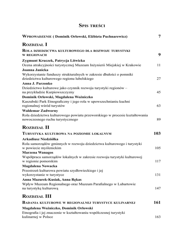 Spis treści Wprowadzenie ( Dominik Orłowski, Elżbieta Puchnarewicz) 7 Rozdział I Rola dziedzictwa kulturowego dla rozwoju turystyki w regionach Zygmunt Kruczek, Patrycja Litwicka Ocena atrakcyjności turystycznej Muzeum Inżynierii Miejskiej w Krakowie Joanna Janicka Wykorzystanie funduszy strukturalnych w zakresie dbałości o pomniki dziedzictwa kulturowego regionu lubelskiego Anna J. Parzonko Dziedzictwo kulturowe jako czynnik rozwoju turystyki regionów – na przykładzie Kurpiowszczyzny Dominik Orłowski, Magdalena Woźniczko Kaszubski Park Etnograficzny i jego rola w upowszechnianiu kuchni regionalnej wśród turystów Waldemar Zadworny Rola dziedzictwa kulturowego powiatu przeworskiego w procesie kształtowania nowoczesnego ruchu turystycznego 9 11 27 45 63 89 Rozdział II Turystyka kulturowa na poziomie lokalnym Arkadiusz Niedziółka Rola samorządów gminnych w rozwoju dziedzictwa kulturowego i turystyki w powiecie myślenickim Marzena Wanagos Współpraca samorządów lokalnych w zakresie rozwoju turystyki kulturowej w regionie pomorskim Magdalena Nowacka Przestrzeń kulturowa powiatu szydłowieckiego i jej wykorzystanie w turystyce Anna Mazurek-Kusiak, Anna Rękas Wpływ Muzeum Regionalnego oraz Muzeum Parafialnego w Lubartowie na turystykę kulturową 103 105 117 131 147 Rozdział III Badania kulturowe w regionalnej turystyce kulinarnej 161 Magdalena Woźniczko, Dominik Orłowski Etnografia i jej znaczenie w kształtowaniu współczesnej turystyki kulinarnej w Polsce 163 Ewa Czarniecka-Skubina, Józef Grochowicz, Ewa Koniuch Wpływ różnych narodów na kuchnię podlaską i jej atrakcyjność turystyczną Beata Mikuta Wstępne badania nad wykorzystaniem wielokulturowości w ofercie żywieniowej gospodarstw agroturystycznych Podlasia 181 199 Rozdział IV Technologia i produkty kuchni regionalnych jako ważny komponent turystyki kulturowej Rafał Nadulski Wybrane procesy technologiczne produkcji żywności jako atrakcja turystyczna Iwona Wielesik Sery z Wiżajn jako element regionalnego dziedzictwa kulinarnego i ich wykorzystanie w ofercie turystycznej Suwalszczyzny Ewa Czarniecka-Skubina, Dorota Nowak Miody − polskie tradycje oraz ich współczesne wykorzystanie jako elementu atrakcyjności turystycznej regionów Dorota Nowak, Ewa Czarniecka-Skubina Łowiectwo i tradycja polskiej kuchni myśliwskiej jako atuty regionalnej oferty turystycznej 215 217 233 249 267 Rozdział V Nowe możliwości rozwoju turystyki kulturowej w regionach Jarosław Uglis Turystyka kulturowa szansą dywersyfikacji oferty turystycznej regionu Renata Konewecka, Jan Krupa Szlaki ginących zawodów jako produkt turystyczny województwa podkarpackiego Bożena Łagowska, Agnieszka Jamiołkowska Dwory szlacheckie jako potencjał turystyki kulturowej na Lubelszczyźnie Barbara Górka, Marek Krzemiński Wstępne badania nad poszukiwaniem wspólnego mianownika między turystyką biznesową i kulturową Bolesław Iwan Uwarunkowania rozwoju turystyki kulturowej w regionie świętokrzyskim Joanna Urbaniak Turystyka filmowa specyficznym produktem turystycznym w Polsce i na świecie 285 287 307 323 337 357 377