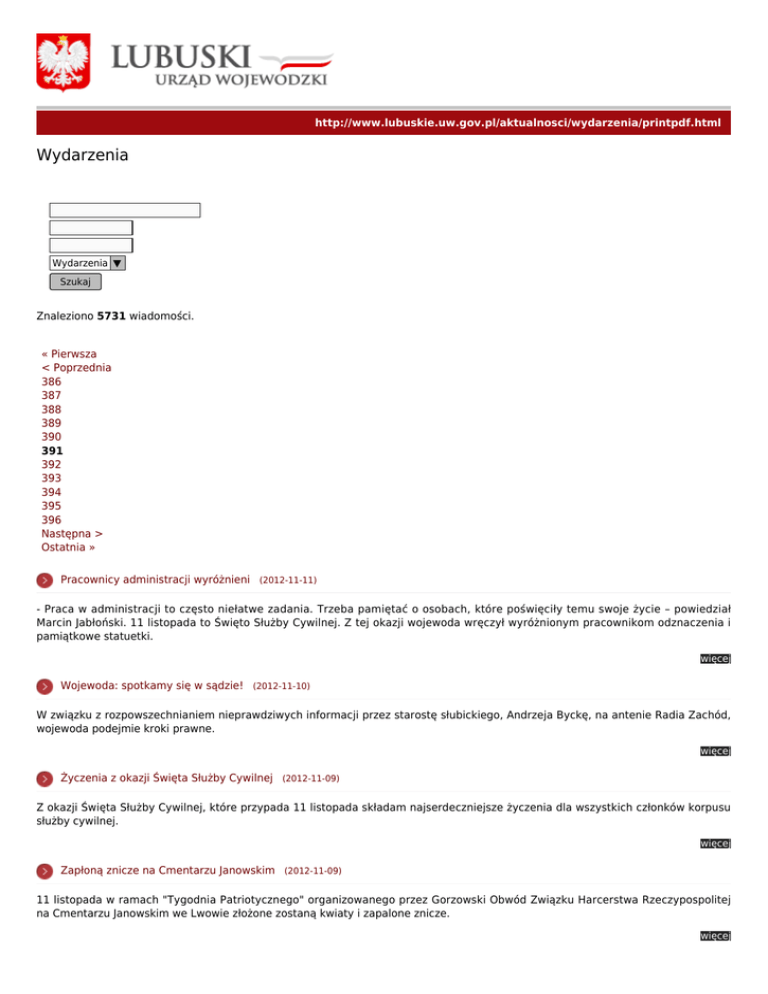 http://www.lubuskie.uw.gov.pl/aktualnosci/wydarzenia/printpdf.html Wydarzenia Wydarzenia ▼ Szukaj Znaleziono 5731 wiadomości. « Pierwsza < Poprzednia 386 387 388 389 390 391 392 393 394 395 396 Następna > Ostatnia » Pracownicy administracji wyróżnieni (2012-11-11) - Praca w administracji to często niełatwe zadania. Trzeba pamiętać o osobach, które poświęciły temu swoje życie – powiedział Marcin Jabłoński. 11 listopada to Święto Służby Cywilnej. Z tej okazji wojewoda wręczył wyróżnionym pracownikom odznaczenia i pamiątkowe statuetki. więcej Wojewoda: spotkamy się w sądzie! (2012-11-10) W związku z rozpowszechnianiem nieprawdziwych informacji przez starostę słubickiego, Andrzeja Byckę, na antenie Radia Zachód, wojewoda podejmie kroki prawne. więcej Życzenia z okazji Święta Służby Cywilnej (2012-11-09) Z okazji Święta Służby Cywilnej, które przypada 11 listopada składam najserdeczniejsze życzenia dla wszystkich członków korpusu służby cywilnej. więcej Zapłoną znicze na Cmentarzu Janowskim (2012-11-09) 11 listopada w ramach "Tygodnia Patriotycznego" organizowanego przez Gorzowski Obwód Związku Harcerstwa Rzeczypospolitej na Cmentarzu Janowskim we Lwowie złożone zostaną kwiaty i zapalone znicze. więcej Wojewoda: Sygnał cyfrowy działa! (2012-11-09) Przejście z telewizyjnego sygnału analogowego na cyfrowe odbyło się bez większych problemów – poinformował ministra Michała Boniego wojewoda Marcin Jabłoński. więcej Wojewodowie o oszczędzaniu i „schetynówkach” (2012-11-08) Powołanie Wojewódzkich Centrów Usług Wspólnych i sposób finansowania tzw. „schetynówek” to tematy Konwentu Wojewodów, który odbył się 6-7 listopada br. w Kielcach. więcej LUW sprawdza dostępność cyfrowej telewizji (2012-11-08) Pracownicy Lubuskiego Urzędu Wojewódzkiego reagują na wszelkie sygnały, dotyczące kłopotów z odbiorem kanałów telewizyjnych po wyłączaniu sygnału analogowego. więcej Wojewódzkie obchody Święta Niepodległości w Gorzowie (2012-11-08) 11 listopada obchodzimy Święto Niepodległości, najważniejsze polskie święto narodowe. Wojewoda lubuski Marcin Jabłoński serdecznie zaprasza mieszkańców województwa lubuskiego na uroczyste obchody. więcej W Zielonej Górze powstanie Centrum Bioróżnorodności - Muzeum Przyrodnicze (2012-11-08) Wojewódzki Konserwator Zabytków zgodził się na adaptację budynków przy ulicy Dąbrowskiego w Zielonej Górze; powstanie tam Centrum Bioróżnorodności - Muzeum Przyrodnicze. więcej 15-lecie KSSSE [wideo] (2012-11-08) Wojewoda lubuski wziął udział w uroczystościach związanych z 15-leciem działalności Kostrzyńsko-Słubickiej Specjalnej Strefy Ekonomicznej. więcej « Pierwsza < Poprzednia 386 387 388 389 390 391 392 393 394 395 396 Następna > Ostatnia »