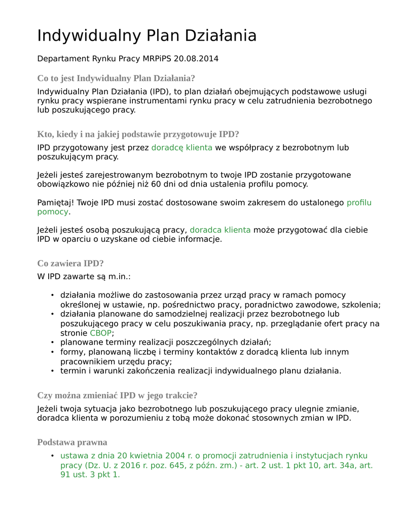 Indywidualny Plan Działania Departament Rynku Pracy MRPiPS 20.08.2014 Co to jest Indywidualny Plan Działania? Indywidualny Plan Działania (IPD), to plan działań obejmujących podstawowe usługi rynku pracy wspierane instrumentami rynku pracy w celu zatrudnienia bezrobotnego lub poszukującego pracy. Kto, kiedy i na jakiej podstawie przygotowuje IPD? IPD przygotowany jest przez doradcę klienta we współpracy z bezrobotnym lub poszukującym pracy. Jeżeli jesteś zarejestrowanym bezrobotnym to twoje IPD zostanie przygotowane obowiązkowo nie później niż 60 dni od dnia ustalenia profilu pomocy. Pamiętaj! Twoje IPD musi zostać dostosowane swoim zakresem do ustalonego profilu pomocy. Jeżeli jesteś osobą poszukującą pracy, doradca klienta może przygotować dla ciebie IPD w oparciu o uzyskane od ciebie informacje. Co zawiera IPD? W IPD zawarte są m.in.: • działania możliwe do zastosowania przez urząd pracy w ramach pomocy określonej w ustawie, np. pośrednictwo pracy, poradnictwo zawodowe, szkolenia; • działania planowane do samodzielnej realizacji przez bezrobotnego lub poszukującego pracy w celu poszukiwania pracy, np. przeglądanie ofert pracy na stronie CBOP; • planowane terminy realizacji poszczególnych działań; • formy, planowaną liczbę i terminy kontaktów z doradcą klienta lub innym pracownikiem urzędu pracy; • termin i warunki zakończenia realizacji indywidualnego planu działania. Czy można zmieniać IPD w jego trakcie? Jeżeli twoja sytuacja jako bezrobotnego lub poszukującego pracy ulegnie zmianie, doradca klienta w porozumieniu z tobą może dokonać stosownych zmian w IPD. Podstawa prawna • ustawa z dnia 20 kwietnia 2004 r. o promocji zatrudnienia i instytucjach rynku pracy (Dz. U. z 2016 r. poz. 645, z późn. zm.) - art. 2 ust. 1 pkt 10, art. 34a, art. 91 ust. 3 pkt 1.