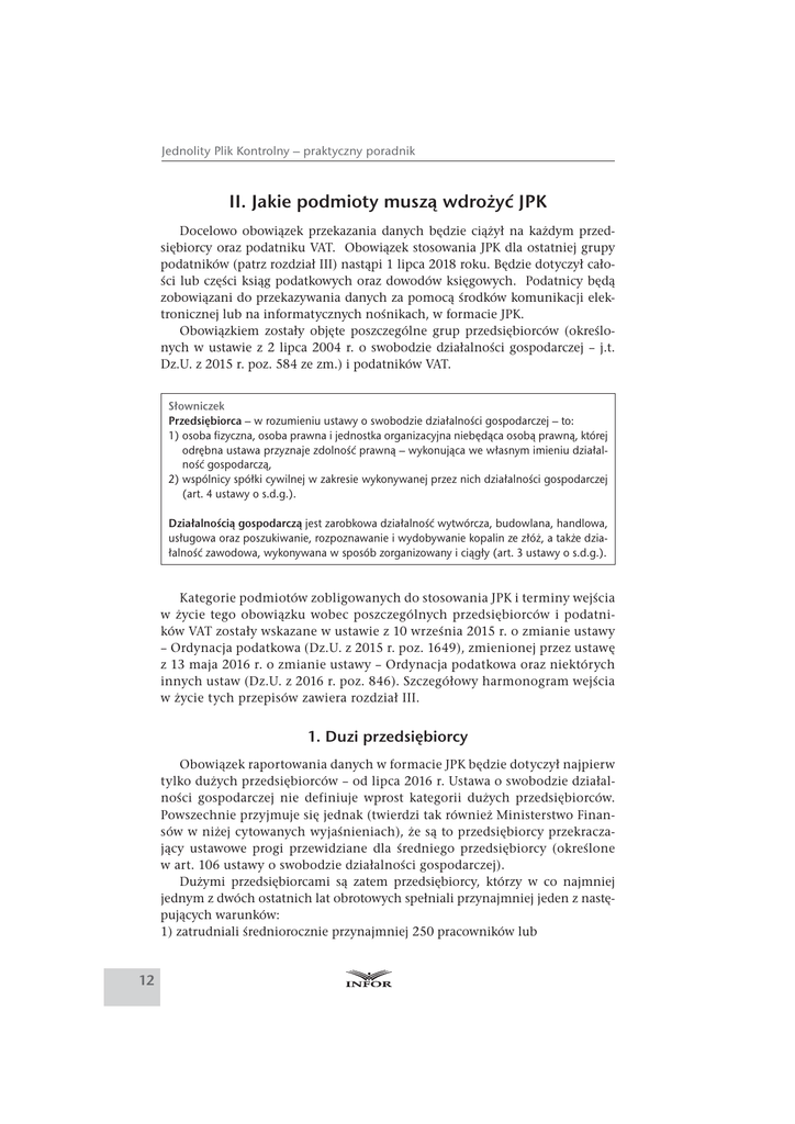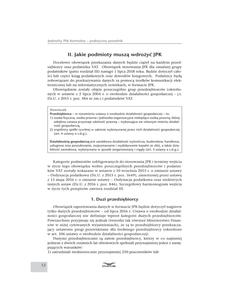Jednolity Plik Kontrolny – praktyczny poradnik II. Jakie podmioty muszą wdrożyć JPK Docelowo obowiązek przekazania danych będzie ciążył na każdym przedsiębiorcy oraz podatniku VAT. Obowiązek stosowania JPK dla ostatniej grupy podatników (patrz rozdział III) nastąpi 1 lipca 2018 roku. Będzie dotyczył całości lub części ksiąg podatkowych oraz dowodów księgowych. Podatnicy będą zobowiązani do przekazywania danych za pomocą środków komunikacji elektronicznej lub na informatycznych nośnikach, w formacie JPK. Obowiązkiem zostały objęte poszczególne grup przedsiębiorców (określonych w ustawie z 2 lipca 2004 r. o swobodzie działalności gospodarczej – j.t. Dz.U. z 2015 r. poz. 584 ze zm.) i podatników VAT. Słowniczek Przedsiębiorca – w rozumieniu ustawy o swobodzie działalności gospodarczej – to: 1) osoba fizyczna, osoba prawna i jednostka organizacyjna niebędąca osobą prawną, której odrębna ustawa przyznaje zdolność prawną – wykonująca we własnym imieniu działalność gospodarczą, 2) wspólnicy spółki cywilnej w zakresie wykonywanej przez nich działalności gospodarczej (art. 4 ustawy o s.d.g.). Działalnością gospodarczą jest zarobkowa działalność wytwórcza, budowlana, handlowa, usługowa oraz poszukiwanie, rozpoznawanie i wydobywanie kopalin ze złóż, a także działalność zawodowa, wykonywana w sposób zorganizowany i ciągły (art. 3 ustawy o s.d.g.). Kategorie podmiotów zobligowanych do stosowania JPK i terminy wejścia w życie tego obowiązku wobec poszczególnych przedsiębiorców i podatników VAT zostały wskazane w ustawie z 10 września 2015 r. o zmianie ustawy – Ordynacja podatkowa (Dz.U. z 2015 r. poz. 1649), zmienionej przez ustawę z 13 maja 2016 r. o zmianie ustawy – Ordynacja podatkowa oraz niektórych innych ustaw (Dz.U. z 2016 r. poz. 846). Szczegółowy harmonogram wejścia w życie tych przepisów zawiera rozdział III. 1. Duzi przedsiębiorcy Obowiązek raportowania danych w formacie JPK będzie dotyczył najpierw tylko dużych przedsiębiorców – od lipca 2016 r. Ustawa o swobodzie działalności gospodarczej nie definiuje wprost kategorii dużych przedsiębiorców. Powszechnie przyjmuje się jednak (twierdzi tak również Ministerstwo Finansów w niżej cytowanych wyjaśnieniach), że są to przedsiębiorcy przekraczający ustawowe progi przewidziane dla średniego przedsiębiorcy (określone w art. 106 ustawy o swobodzie działalności gospodarczej). Dużymi przedsiębiorcami są zatem przedsiębiorcy, którzy w co najmniej jednym z dwóch ostatnich lat obrotowych spełniali przynajmniej jeden z następujących warunków: 1) zatrudniali średniorocznie przynajmniej 250 pracowników lub 12 Jakie podmioty muszą wdrożyć JPK 2) osiągnęli roczny obrót netto ze sprzedaży towarów, wyrobów i usług oraz operacji finansowych przynajmniej w wysokości równowartości w złotych 50 milionów euro lub sumy aktywów ich bilansu sporządzonego na koniec jednego z tych lat wyniosły przynajmniej wysokość równowartości w złotych 43 milionów euro. PRZYKŁAD Spółka X SA w roku 2014 zatrudniała średniorocznie 231 pracowników, a w roku 2015 średniorocznie 220 pracowników. Spółka osiągnęła w 2014 roku obrót netto ze sprzedaży towarów, wyrobów i usług oraz operacji finansowych w kwocie stanowiącej równowartość 55 milionów euro. Natomiast w 2015 roku jej obrót netto wyniósł 47 milionów euro. Rok obrotowy Spółki pokrywa się z rokiem kalendarzowym. Spółka należy do kategorii tzw. dużych przedsiębiorców z uwagi na fakt przekroczenia w 2014 roku poziomu 50 milionów euro obrotów netto. UWAGA! Do końca czerwca 2016 r. duzi przedsiębiorcy muszą zaimplementować do swoich programów finansowo-księgowych i handlowych struktury JPK, ponieważ organ podatkowy może zażądać od nich danych w tej postaci już w lipcu 2016 r. Co więcej, duzi przedsiębiorcy, którzy są czynnymi podatnikami VAT, mają jednocześnie obowiązek comiesięcznego dostarczania danych z ewidencji zakupu i sprzedaży VAT. Dane te będą musiały dostarczać do 25. dnia każdego kolejnego miesiąca bez wcześniejszego żądania urzędu skarbowego. To oznacza, że po raz pierwszy duzi przedsiębiorcy będą zobowiązani do przesłania ewidencji VAT, w formie uzgodnionej struktury logicznej (czyli JPK), już do 25 sierpnia 2016 r. Wyjaśnienia Ministerstwa Finansów odnośnie do kategorii dużych przedsiębiorców (źródło: http://www.mf.gov.pl/kontrola-skarbowa/dzialalnosc/jednolity-plik-kontrolny) Pytanie podatnika: W nawiązaniu do wcześniejszych kontaktów w sprawie JPK, uprzejmie informuję, że bardzo zależy nam na Państwa stanowisku co do zakresu stosowania zmienionych przepisów ustawy z 29 sierpnia 1997 r. – Ordynacja podatkowa (j.t. Dz.U. z 2015 r. poz. 613 ze zm.) i wprowadzeniem nowego art. 193a tej ustawy, w odniesieniu do tak zwanych dużych przedsiębiorców już od 1 lipca 2016 r. Nie mamy wątpliwości, że przepisy te będą stosowane w odniesieniu do następujących przedsiębiorców: 1) zatrudnienie średnioroczne większe bądź równe 250 osób, obrót większy niż 50 mln euro, aktywa mniejsze bądź równe 43 mln euro, 2) zatrudnienie średnioroczne większe bądź równe 250 osób, obrót mniejszy bądź równy 50 mln euro, aktywa większe od 43 mln euro, 13 Jednolity Plik Kontrolny – praktyczny poradnik 3) zatrudnienie średnioroczne większe bądź równe 250 osób, obrót większy niż 50 mln euro, aktywa większe niż 43 mln euro, ale mamy wątpliwości co do zakresu stosowania tych przepisów w odniesieniu do przedsiębiorców: 4) zatrudnienie średnioroczne mniejsze niż 250 osób, obrót większy od 50 mln euro, aktywa większe od 43 mln euro, 5) zatrudnienie średnioroczne większe bądź równe 250 osób, obrót mniejszy bądź równy 50 mln euro, aktywa mniejsze bądź równe 43 mln euro. Oczywiście chodzi o co najmniej jedno z dwóch ostatnich 