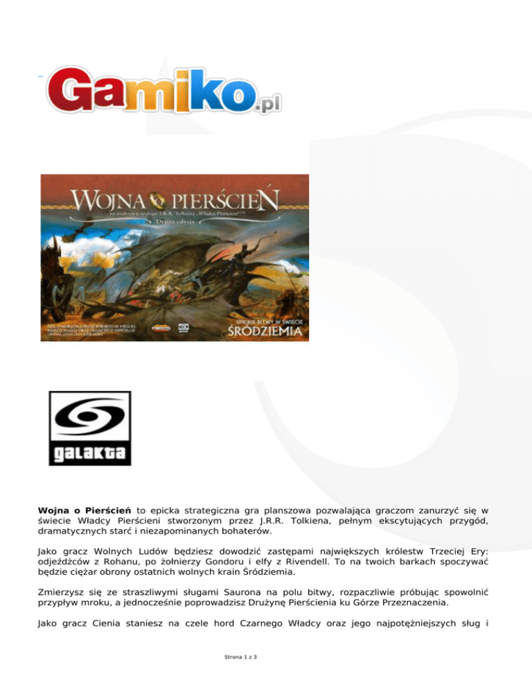 Wojna o Pierścień to epicka strategiczna gra planszowa pozwalająca graczom zanurzyć się w świecie Władcy Pierścieni stworzonym przez J.R.R. Tolkiena, pełnym ekscytujących przygód, dramatycznych starć i niezapominanych bohaterów. Jako gracz Wolnych Ludów będziesz dowodzić zastępami największych królestw Trzeciej Ery: odjeźdżców z Rohanu, po żołnierzy Gondoru i elfy z Rivendell. To na twoich barkach spoczywać będzie ciężar obrony ostatnich wolnych krain Śródziemia. Zmierzysz się ze straszliwymi sługami Saurona na polu bitwy, rozpaczliwie próbując spowolnić przypływ mroku, a jednocześnie poprowadzisz Drużynę Pierścienia ku Górze Przeznaczenia. Jako gracz Cienia staniesz na czele hord Czarnego Władcy oraz jego najpotężniejszych sług i Strona 1 z 3 spróbujesz okryć krainy Śródziemia wieczną ciemnością. Na twoje rozkazy czekają legiony orków, trolli, jeźdźców wilków i straszliwe Upiory Pierścienia. Wytrop Powiernika Pierścienia i odzyskaj najcenniejszy skarb Saurona albo zmiażdż wrogów potęgą swoich armii. Oto twoja szansa, zmienić bieg historii całej ery... Zwartość pudełka: olbrzymia (70x100 cm) plansza składająca się z dwóch części 205 plastikowych figurek przedstawiających armie i postacie (ponad trzydzieści różnych wzorów) 16 kości akcji 5 kości bitwy 76 tekturowych żetonów 110 kart Wydarzeń i Postaci instrukcja dwa arkusze pomocy gracza Wiek 12+ Liczba graczy 2-4 graczy Czas gry ok. 180 minut Wydanie polskie Producent Galakta Strona 2 z 3 Projektant Roberto di Meglio Marco Maggi Francesco Nepitello Strona 3 z 3