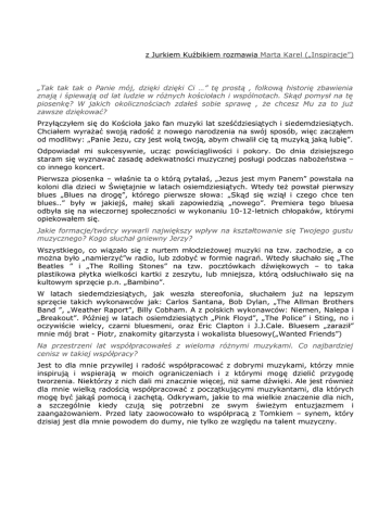 z Jurkiem Kuźbikiem rozmawia Marta Karel („Inspiracje”) „Tak tak tak o Panie mój, dzięki dzięki Ci …” tę prostą , folkową historię zbawienia znają i śpiewają od lat ludzie w różnych kościołach i wspólnotach. Skąd pomysł na tę piosenkę? W jakich okolicznościach zdałeś sobie sprawę , że chcesz Mu za to już zawsze dziękować? Przyłączyłem się do Kościoła jako fan muzyki lat sześćdziesiątych i siedemdziesiątych. Chciałem wyrażać swoją radość z nowego narodzenia na swój sposób, więc zacząłem od modlitwy: „Panie Jezu, czy jest wolą twoją, abym chwalił cię tą muzyką jaką lubię”. Odpowiadał mi sukcesywnie, ucząc powściągliwości i pokory. Do dnia dzisiejszego staram się wyznawać zasadę adekwatności muzycznej posługi podczas nabożeństwa – co innego koncert. Pierwsza piosenka – właśnie ta o którą pytałaś, „Jezus jest mym Panem” powstała na koloni dla dzieci w Świętajnie w latach osiemdziesiątych. Wtedy też powstał pierwszy blues „Blues na drogę”, którego pierwsze słowa: „Skąd się wziął i czego chce ten blues..” były w jakiejś, małej skali zapowiedzią „nowego”. Premiera tego bluesa odbyła się na wieczornej społeczności w wykonaniu 10-12-letnich chłopaków, którymi opiekowałem się. Jakie formacje/twórcy wywarli największy wpływ na kształtowanie się Twojego gustu muzycznego? Kogo słuchał gniewny Jerzy? Wszystkiego, co wiązało się z nurtem młodzieżowej muzyki na tzw. zachodzie, a co można było „namierzyć”w radio, lub zdobyć w formie nagrań. Wtedy słuchało się „The Beatles ” i „The Rolling Stones” na tzw. pocztówkach dźwiękowych – to taka plastikowa płytka wielkości kartki z zeszytu, lub mniejsza, którą odsłuchiwało się na kultowym sprzęcie p.n. „Bambino”. W latach siedemdziesiątych, jak weszła stereofonia, słuchałem już na lepszym sprzęcie takich wykonawców jak: Carlos Santana, Bob Dylan, „The Allman Brothers Band ”, „Weather Raport”, Billy Cobham. A z polskich wykonawców: Niemen, Nalepa i „Breakout”. Później w latach osiemdziesiątych „Pink Floyd”, „The Police” i Sting, no i oczywiście wielcy, czarni bluesmeni, oraz Eric Clapton i J.J.Cale. Bluesem „zaraził” mnie mój brat - Piotr, znakomity gitarzysta i wokalista bluesowy(„Wanted Friends”) Na przestrzeni lat współpracowałeś z wieloma różnymi muzykami. Co najbardziej cenisz w takiej współpracy? Jest to dla mnie przywilej i radość współpracować z dobrymi muzykami, którzy mnie inspirują i wspierają w moich ograniczeniach i z którymi mogę dzielić przygodę tworzenia. Niektórzy z nich dali mi znacznie więcej, niż same dźwięki. Ale jest również dla mnie wielką radością współpracować z początkującymi muzykantami, dla których mogę być jakąś pomocą i zachętą. Odkrywam, jakie to ma wielkie znaczenie dla nich, a szczególnie kiedy czują się potrzebni ze swym świeżym entuzjazmem i zaangażowaniem. Przed laty zaowocowało to współpracą z Tomkiem – synem, który dzisiaj jest dla mnie powodem do dumy, nie tylko ze względu na talent muzyczny. Czy któryś z koncertów(miejsce, okoliczności, reakcja słuchaczy) szczególnie utkwił Ci w pamięci? Niezapomnianym przeżyciem był mój debiut w latach osiemdziesiątych w zborze w Gdańsku. Byłem tak potwornie stremowany, że zapominałem podstawowych akordów, tekstu. Modliłem się, żeby dobrnąć do końca. Były to początki chóru TGD. Śpiewałem piosenkę „Jezus jest mym Panem”. Po występie podszedł do mnie Tomek Żółtko, podziękował mi i zaśpiewał „Po prostu z Jezusem żyć”. To było ważne dla mnie, bardzo sobie cenię Tomka i jego twórczość, ale przede wszystkim jego zachętę. Jeżeli chodzi o koncerty, odpowiada mi kameralna scena, gdzie jest klubowy klimat i łatwiej nawiązać kontakt z ludźmi. Czy to prawda, że duet z synem(perkusista grupy Frühstück)rozpoczęliście od bębnienia w puszki po odżywkach „Milupa”? Tak, właśnie było. Tomek miał zdaje się 6 lat, kiedy zadebiutował w naszym zborze. Kupiliśmy mu na urodziny werbel harcerski, pałki, a „kociołki”to były puszki po „Milupie”. Myślę, że to dla każdego ojca jest bardzo ważne, aby przekazać synowi „pałeczkę”. Tak zrodziła się nasza więź i partnerstwo muzyczne. Ponoć prawdziwy artysta tworzy z przemożnej wewnętrznej potrzeby, pod przymusem niejako, nie mogąc zatrzymać dla siebie tego, co mu w duszy gra. Zgadzasz się z tym stwierdzeniem? Zgadzam się z tym i myślę, że odnosi się to do różnych poziomów artystycznego rzemiosła i powołania. Jeżeli już mówimy o prawdziwych artystach, to należałoby też wspomnieć, że ci najwięksi raczej rzadko są zachęcającymi osobowościami. Zdradzają Boga, żony, przyjaciół, porzucają dzieci; są egocentryczni, niemoralni i czasem odpychający, ale tworzą piękną sztukę. Wykorzystują bezcenny dar Boży dla własnych celów, mając na uwadze tylko karierę i sławę, ale są też piękne wyjątki i całe rzesze artystów, którzy zmagają się ze swoim powołaniem próbując zachować zdrowe zasady godnego człowieczeństwa. Szansą na zmianę jest osobiste poznanie Jezusa Chrystusa. I wówczas zmienia się perspektywa. Mając za sobą światło Słowa Bożego diametralnie zmieniają się priorytety. Celem staje się przynoszenie Bogu chwały, a nie sobie. Sztuka przestaje być celem samym w sobie, ale staje się środkiem do celu. Egocentryzm musi zostać ukrzyżowany. Przestaję być panem, staję się sługą. Czy to jest proste, lub łatwe? Nie, to jest znacznie trudniejsze od uprawiania sztuki; to jest czasem zapieranie się siebie, a czasem poczucie porażki, czy niespełnienia. Ale jeśli mój azymut jest nakierowany na wieczność, wtedy to mniej boli. Tak więc, prawdziwego powołania nic nie jest w stanie zatrzymać, bo nieodwołalne są dary i pow
