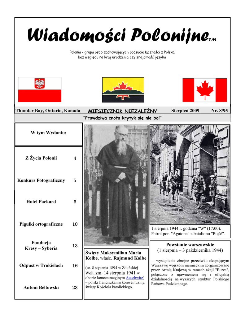 Wiadomosci Polonijne TM Polonia - grupa osób zachowujących poczucie łączności z Polską bez względu na kraj urodzenia czy znajomość języka Thunder Bay, Ontario, Kanada MIESIĘCZNIK NIEZALEŻNY Sierpień 2009 Nr. 8/95 “Prawdziwa cnota krytyk się nie boi” W tym Wydaniu: Z Życia Polonii 4 Konkurs Fotograficzny 5 Hotel Packard 6 Pigułki ortograficzne 10 Fundacja Kresy – Syberia 13 Odpust w Trokielach 16 Antoni Bełtowski 23 1 sierpnia 1944 r. godzina "W" (17:00). Patrol por. "Agatona" z batalionu "Pięść". Święty Maksymilian Maria Kolbe, właśc. Rajmund Kolbe (ur. 8 stycznia 1894 w Zduńskiej Woli, zm. 14 sierpnia 1941 w obozie koncentracyjnym Auschwitz) – polski franciszkanin konwentualny, święty Kościoła katolickiego. Powstanie warszawskie (1 sierpnia – 3 października 1944) – wystąpienie zbrojne przeciwko okupującym Warszawę wojskom niemieckim zorganizowane przez Armię Krajową w ramach akcji "Burza", połączone z ujawnieniem się i oficjalną działalnością najwyższych struktur Polskiego Państwa Podziemnego. Wiadomości Polonijne 2 Redaguje Zespół: Lucy Michalak Tadeusz Michalak Agnieszka Reszkowska-Kania Robert Kania Korespondenci: Joanna Adamik Agnieszka Buda-Rodriguez A. Cooke B. Ejbich I.. Giżewska A. Siwiak Waldi Opracowanie: Lucy Michalak Wydawca: Wiadomości Polonijne 236 Masters Street. Thunder Bay, Ont. P7B 6L5 e-mail: [email protected] Redakcja zastrzega sobie prawo skracania i edycji nadesłanych tekstów. Wyrażone w tekstach opinie należą do autorów i nie zawsze odzwierciedlają stanowisko redakcji. Za treść ogłoszeń i reklam redakcja nie ponosi odpowiedzialności. Wiadomości Polonijne są pismem całkowicie bezpłatnym. Wszelkie koszty związane z drukiem są pokrywane z dotacji. Każda pomoc finansowa jest mile widziana. Wszelkiego rodzaju ogloszenia i życzenia do “Wiadomości Polonij ych” przyj muj e Lucy Michalak tel. 767-4200 Wzory reklam zaprojektowanych przez Wiadomości Polonijne” są własnością wydawnictwa. Kopiowanie i ich publikowanie bez zgody redakcji jest nielegalne. Redakcja “ Wiadomości Polonijnych” zaprasza wszystkich Czytelników do przysyłania własnej twórczości. Mogą to być zarówno wiersze jak i proza. Termin nadsyłania materiałów do gazety upływa 15-go każdego miesiąca. Przysłowie miesiąca Kiedy sierpień wrzos rozwija, jesień krótka, szybko mija Sierpień 2009 WIADOMOŚCI Z POLSKI-Tadeusz Michalak Putin pokazał Obamie rosyjską gościnność zwrotu mienia Żydów polskich zabitych w Holokauście, którzy nie pozostawili spadkobierców, na rzecz tychże organizacji, są w prawie polskim bezpodstawne. Prawo polskie nie jest rasistowskie, i własność obywateli polskich zmarłych bez spadkobierców, przechodzi na rzecz Skarbu Państwa. Stanowisko to podtrzymał minister spraw zagranicznych Radosław Sikorski. Sprawa zysku NBP Nie steki i hotdogi, a tradycyjne dania kuchni rosyjskiej dominowały na stole w podmoskiewskiej rezydencji Władimira Putina, w której premier Rosji przyjął Baracka Obamę. Amerykański prezydent na własnej skórze przekonał się, czym jest rosyjska gościnność. Nic tak nie zbliża polityków jak pobyt w domu któregoś z nich. George W. Bush zapraszał swoich gości na ranczo w Teksasie, Silvio Berlusconi oferował różnorodne atrakcje bywalcom swojej posiadłości na Sardynii. Radosław Sikorski, jeśli chce kogoś szczególnie ugościć, zaprasza go do swojego pałacyku w Chobielinie. Władimir Putin, który wśród znaczących polityków ma wielu przyjaciół, chciał pozyskać kolejnego: Baracka Obamę i zaprosił go na śniadanie do swojej rezydencji w Nowo-Ogariowie koło Moskwy. Jeśli Obama jest miłośnikiem kanapek z masłem orzechowym i dżemem, czyli standardowego amerykańskiego śniadania, albo dba o linię, to miał problem. Bo Putin postanowił przyjąć go po rosyjsku. Na stół podano racuchy z wędzoną bieługą, jajka z czarnym kawiorem i śmietanę, pielmienie z przepiórki, marmoladę z żurawin, a na deser, (choć to było śniadanie) - lody z domową śmietaną i kisiel z wiśni. Wszystko popijano herbatą z samowara. Obama na własnej skórze przekonał się, czym jest rosyjska gościnność. No prawie... bo nie podano rosyjskiej wódki (a w każdym razie oficjalne komunikaty na ten temat milczą). Władysław Bartoszewski Wyraźnie i oficjalnie stwierdził, ze żądania organizacji żydowskich, domagających się Co to rząd chciałby wziąć do budżetu, jest bardziej skomplikowana. Po pierwsze - nie wiadomo, czy ten zysk będzie. Po drugie trzeba pokryć straty z ubiegłych lat (a były). Po trzecie - zgodnie z ustawa, bank musi mieć rezerwę na pokrycie ryzyka zmian kursu złotego. Prezes NBP, Sławomir Skrzypek, mówi, że `jeżeli zysk banku będzie na odpowiednim poziomie to można jego częścią wspomóc budżet'. Decyzja zresztą nie należy do prezesa, tylko całego zarządu banku, no i Rady Polityki Pieniężnej. W mediach dość ostro - z jednej strony prasa twierdzi że to Prezydent nie pozwoli mianowanemu przez siebie prezesowi pomóc rządowi, z drugiej przytomni zauważają, że bank centralny ma być niezależny. A tymczasem szef gabinetu politycznego premiera, Sławomir Nowak, chlapnął, że nawet jak NBP zysku nie wykaże, to rząd spróbuje ustawą przeksięgować wypracowane przez bank pieniądze tak by trafiły do budżetu. Złośliwi wspominają Andrzeja Leppera, który w 2006 za swego wicepremierostwa mówił, że `pieniądze są w banku i trzeba je stamtąd wydostać'. Prezydent Podpisał ustawę zakazującą kandydowania do parlamentu osobom skazanym prawomocnym wyrokiem na karę pozbawienia wolności za przestępstwo umyślne ścigane z oskarżenia publicznego. Zmiana ma obowiązywać od następnej kadencji. Cyfryzacja telewizji Coraz bliżej. Do końca sierpnia ma wejść w życie rządowa strategia w tej sprawie. Całkowite wycofanie telewizji analogowej ma nastąpić w lipcu 2013. 