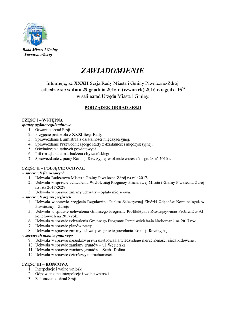 Rada Miasta i Gminy Piwniczna-Zdrój ZAWIADOMIENIE Informuję, że XXXII Sesja Rady Miasta i Gminy Piwniczna-Zdrój, odbędzie się w dniu 29 grudnia 2016 r. (czwartek) 2016 r. o godz. 1530 w sali narad Urzędu Miasta i Gminy. PORZĄDEK OBRAD SESJI CZĘŚĆ I – WSTĘPNA sprawy ogólnoregulaminowe 1. Otwarcie obrad Sesji. 2. Przyjęcie protokołu z XXXI Sesji Rady. 3. Sprawozdanie Burmistrza z działalności międzysesyjnej. 4. Sprawozdanie Przewodniczącego Rady z działalności międzysesyjnej. 5. Oświadczenia radnych powiatowych. 6. Informacja na temat budżetu obywatelskiego. 7. Sprawozdanie z pracy Komisji Rewizyjnej w okresie wrzesień – grudzień 2016 r. CZĘŚĆ II – PODJĘCIE UCHWAŁ w sprawach finansowych 1. Uchwała Budżetowa Miasta i Gminy Piwniczna-Zdrój na rok 2017. 2. Uchwała w sprawie uchwalenia Wieloletniej Prognozy Finansowej Miasta i Gminy Piwniczna-Zdrój na lata 2017-2028. 3. Uchwała w sprawie zmiany uchwały – opłata miejscowa. w sprawach organizacyjnych 4. Uchwała w sprawie przyjęcia Regulaminu Punktu Selektywnej Zbiórki Odpadów Komunalnych w Piwnicznej – Zdroju 5. Uchwała w sprawie uchwalenia Gminnego Programu Profilaktyki i Rozwiązywania Problemów Alkoholowych na 2017 rok. 6. Uchwała w sprawie uchwalenia Gminnego Programu Przeciwdziałania Narkomanii na 2017 rok. 7. Uchwała w sprawie planów pracy. 8. Uchwała w sprawie zmiany uchwały w sprawie powołania Komisji Rewizyjnej. w sprawach mienia gminnego 9. Uchwała w sprawie sprzedaży prawa użytkowania wieczystego nieruchomości niezabudowanej. 10. Uchwała w sprawie zamiany gruntów – ul. Węgierska. 11. Uchwała w sprawie zamiany gruntów – Sucha Dolina. 12. Uchwała w sprawie dzierżawy nieruchomości. CZĘŚĆ III – KOŃCOWA 1. Interpelacje i wolne wnioski. 2. Odpowiedzi na interpelacje i wolne wnioski. 3. Zakończenie obrad Sesji. Rada Miasta i Gminy Piwniczna - Zdrój Informuje, że wspólne posiedzenie Komisji Problemowych Rady Miasta i Gminy Piwniczna – Zdrój, odbędzie się w dniu 28 grudnia (środa) 2016 r. o godz. 1400 w sali narad Urzędu Miasta i Gminy. Program wspólnego posiedzenia Komisji Rady: 1. Zaopiniowanie materiałów na XXXII Sesję Rady Miasta i Gminy. 2. Wolne wnioski. 3. Zakończenie posiedzenia. Przewodniczący Komisji Rewizyjnej Przewodniczący Komisji Budżetowo - Gospodarczej Przewodniczący Komisji Ogólnospołecznej