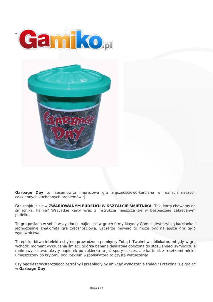Garbage Day to niesamowita imprezowa gra zręcznościowo-karciana w realiach naszych codziennych kuchennych problemów :) Gra znajduje się w ZWARIOWANYM PUDEŁKU W KSZTAŁCIE ŚMIETNIKA . Tak, karty chowamy do śmietnika. Fajnie? Wszystkie karty wraz z instrukcją mieszczą się w bezpiecznie zakręcanym pudełku. Ta gra posiada w sobie wszystko co najlepsze w grach firmy Mayday Games. Jest szybką karcianką i jednocześnie znakomitą grą zręcznościową. Szczerze mówiąc to może być najlepsza gra tego wydawnictwa. To epicka bitwa intelektu chytrze prowadzona pomiędzy Tobą i Twoimi współlokatorami gdy w grę wchodzi moment wyrzucenia śmieci. Skórka banana delikatnie dołożona do stosu śmieci symbolizuje małe zwycięstwo, ukryty papierek po cukierku to już spory sukces, ale kartonik z resztkami mleka umieszczony po kryjomu pod łóżkiem współlokatora to czysta wirtuozeria! Czy będziesz wystarczająco ostrożny i przebiegły by uniknąć wynoszenia śmieci? Przekonaj się grając w Garbage Day! Strona 1 z 2 Wiek 10 + Liczba graczy 2-5 Czas gry 20 - 30 minut Instrukcja polska Wydanie polskie Producent Gamiko Projektant Shane Willis Strona 2 z 2