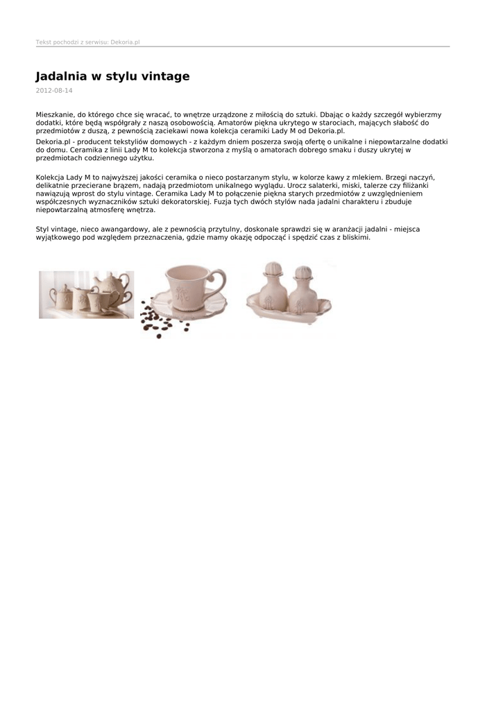 Tekst pochodzi z serwisu: Dekoria.pl Jadalnia w stylu vintage 2012-08-14 Mieszkanie, do któ rego chce się wracać, to wnętrze urza ̨dzone z miłościa ̨ do sztuki. Dbaja ̨c o każdy szczegó ł wybierzmy dodatki, któ re będa ̨ wspó łgrały z nasza ̨ osobowościa ̨. Amatoró w piękna ukrytego w starociach, maja ̨cych słabośc ́ do przedmiotó w z dusza ̨, z pewnościa ̨ zaciekawi nowa kolekcja ceramiki Lady M od Dekoria.pl. Dekoria.pl - producent tekstylió w domowych - z każdym dniem poszerza swoja ̨ ofertę o unikalne i niepowtarzalne dodatki do domu. Ceramika z linii Lady M to kolekcja stworzona z myśla ̨ o amatorach dobrego smaku i duszy ukrytej w przedmiotach codziennego użytku. Kolekcja Lady M to najwyższej jakości ceramika o nieco postarzanym stylu, w kolorze kawy z mlekiem. Brzegi naczyń , delikatnie przecierane bra ̨zem, nadaja ̨ przedmiotom unikalnego wygla ̨du. Urocz salaterki, miski, talerze czy filiżanki nawia ̨zuja ̨ wprost do stylu vintage. Ceramika Lady M to poła ̨czenie piękna starych przedmiotó w z uwzględnieniem wspó łczesnych wyznacznikó w sztuki dekoratorskiej. Fuzja tych dwó ch styló w nada jadalni charakteru i zbuduje niepowtarzalna ̨ atmosferę wnętrza. Styl vintage, nieco awangardowy, ale z pewnościa ̨ przytulny, doskonale sprawdzi się w aranżacji jadalni - miejsca wyja ̨tkowego pod względem przeznaczenia, gdzie mamy okazję odpocza ̨ć i spędzić czas z bliskimi.