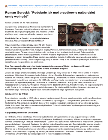 wilnoteka.lt http://www.wilnoteka.lt/pl/artykul/roman-gorecki-quotpodobnie-jak-moi-przodkowie-najbardziej-cenie-wolnoscquot Roman Gorecki: "Podobnie jak moi przodkowie najbardziej cenię wolność" Roman Gorecki, fot. M. Paluszkiewicz W przededniu Świąt Bożego Narodzenia rozmawiamy z Romanem Goreckim, potomkiem Adama Mickiewicza. Tak się składa, że 24 grudnia przypada 216. rocznica urodzin wielkiego poety - praprapradziadka naszego rozmówcy. Urodził się Pan w Paryżu i przez długie lata tam mieszkał. Co sprowadziło Pana do Wilna? Przyjechałem tu po raz pierwszy przed 15 laty. Tak się stało, że założyłem niewielkie przedsiębiorstwo i siłą rzeczy musiałem tu często bywać. Krążyłem między Paryżem, Wilnem i Warszawą, w której też miałem małe przedsiębiorstwo. Firma moja produkuje wyroby ze skóry, w tym siodła do jazdy konnej. Cała produkcja przeznaczona jest na rynek zagraniczny. W Wilnie mieszka moja rodzina. Mam córkę, która uczęszcza do działającej tu szkoły francuskiej. Przez pewien czas pełniłem funkcje dyrektora tej placówki, obecnie jestem prezesem Rady Szkolnej. Dbam o organizację pracy w szkole i robię to na zasadach społecznych. Bardzo jestem szczęśliwy, że mogę udzielać się społecznie. Nosi Pan nazwisko Gorecki. Jest to ród szczególnie ceniony w Wilnie i na dawnych Kresach Rzeczypospolitej. Poproszę o słów kilka o Pana przodkach z tej linii. Zacznę od swego praprapradziadka Antoniego Goreckiego, który urodził się w 1787 roku w Wilnie w rodzinie wojskiego, Walentego Goreckiego, herbu Dołęga i Anny z Reuttów. Był czwartym, najmłodszym, dzieckiem w rodzinie. W 1802 roku Antoni wstąpił na Wydział Literatury Uniwersytetu w Wilnie. W czasie studiów zapoznał się i zaprzyjaźnił z Joachimem Lelewelem. W 1805 roku ukończył naukę z wyróżnieniem i w tym czasie zaczął przejawiać się jego talent poetycki. Debiutował w "Dzienniku Wileńskim". Kiedy miał 19 lat, Antoni Gorecki rozpoczął służbę wojskową w Księstwie Warszawskim. Zdobył tytuł oficera. Nawet w wojsku nie wypuszczał pióra z ręki. Został m. in. cenionym autorem pieśni obozowych. Po bitwie pod Możajskiem Napoleon mianował go kawalerem Legii Honorowej. Klęska wojsk francuskich była dla niego ogromnym przeżyciem. Wtedy przybył do Wilna? Po wystąpieniu z wojska w 1815 roku w stopniu kapitana Antoni Gorecki osiadł w majątku rodzinnym Dusinienta (Dusinienai). Jest to nieduża miejscowość podwileńska, sąsiadująca z Czarnym Borem, przecięta rzeczką Rudomianką. Nie zatrzymał się jednak długo w tym majątku, bo już rok później udał się w podróż po Europie. Nadal dużo pisał. Swe wiersze zamieszczał głównie w "Dzienniku Wileńskim" wydawanym nakładem księgarni Józefa Zawadzkiego w Wilnie. Czy jeszcze powrócił do Dusinient? W 1818 roku Antoni ożenił się z Weroniką Eydziatowicz, córką ziemianina z woj. augustowskiego. Młode małżeństwo zamieszkało w Dusinientach. Odtąd poeta dzielił swój czas miedzy Wilnem a rodzinnym majątkiem. Wkrótce urodził się syn Tadeusz. Potem kolejno - Ludwik oraz córki: Róża, Kamila i Anna. Wiejski dom Goreckich zawsze był otwarty dla gości. Czytałam, że wileński pałac Goreckich przy ulicy Dominikańskiej również słynął z gościnności… Rzeczywiście u Goreckich często organizowano spotkania towarzyskie, głośne na całe miasto. Zbierała się tu śmietanka inteligencji wileńskiej, a gospodarz bardzo często improwizował przy stole wierszyki. Dodam, że w pałacu tym odbywały się narady, jak pomóc studentom - filomatom i filaretom skazanym na wydalenie z uniwersytetu, a później więzionym w różnych częściach miasta. W jakich okolicznościach Gorecki opuścił Litwę? Zbliżał się rok 1831. Już w styczniu z inicjatywy Joachima Lelewela powstał Centralny Komitet Wileński odpowiedzialny za zorganizowanie powstania na Litwie. W jego skład wszedł m. in. Antoni Gorecki. Wkrótce został szefem sztabu wojennego. Działał na terenie Wina, Wiłkomierza i Telsz. W pałacu Goreckich odbywały się przygotowania do powstania listopadowego. Po upadku insurekcji musiał wyemigrować do Francji, zostawiając swe dobra, które wkrótce skonfiskował rząd carski. Jak się potoczyły jego dalsze losy? Wyemigrowało wówczas mnóstwo Polaków. Paryż wtedy liczył 500 tysięcy mieszkańców miasta, z czego około 20 tysięcy stanowili Polacy - emigranci. Istniała wśród nich wielka solidarność. Z inicjatywy Antoniego Goreckiego powstała polska szkoła, która istnieje do dziś. Był on także jednym z współzałożycieli cmentarza Les Champeaux w miasteczku Montmorency. Krajobraz tej miejscowości bardzo mu przypominał Litwę, dlatego postanowił właśnie tam założyć cmentarz. Miejsce to często jest zwane nekropolią polskiej emigracji. Na Panteonie tym spoczęli obaj moi praprapradziadkowie - Antoni Gorecki i Adam Mickiewicz. Zwłoki ostatniego sprowadzono w 1856 roku ze Stambułu, zaś w roku 1890 prochy jego spoczęły na Wawelu, w krypcie wieszczów narodowych. Na cmentarzu tym pochowana jest Celina Szymanowska, słynna pianistka, żona Adama Mickiewicza. Grobowiec rodziny Mickiewiczów istnieje do dziś. Paryż to spotkanie Goreckiego z Mickiewiczem? W 1857 roku syn Antoniego, mój prapradziadek Tadeusz Gorecki ożenił się w Paryżu z Marią Mickiewiczówną, najstarszą córką Adama i Celiny z Szymanowskich Mickiewiczów. Tadeusz był utalentowanym artystą malarzem. Zostawił dużo obrazów, m. in. portrety swego teścia Adama Mickiewicza, a także niedokończony cykl ilustracji do "Pana Tadeusza". Niektóre jego dzieła są w zbiorach Litewskiego Muzeum Sztuki w Wilnie. Przed śmiercią Tadeusz Gorecki odwiedził Litwę. Tak się złożyło, że jego syn Ludwik, znany paryski oftalmolog, przed II wojną światową też tu gościł, odwiedził wtedy podwileńskie Dusinienta. Z kolei w 1955 roku będąc na Litwie miejscowość 