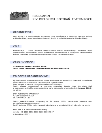 REGULAMIN XIV BIELSKICH SPOTKAŃ TEATRALNYCH ORGANIZATOR Dom Kultury w Bielsku-Białej Kamienicy przy współpracy z Miejskim Domem Kultury w Bielsku-Białej, oraz Wydziałem Kultury i Sztuki Urzędu Miejskiego w Bielsku-Białej. CELE Konfrontacja i ocena dorobku artystycznego teatru amatorskiego, wymiana myśli i doświadczeń animatorów ruchu teatralnego, kształtowanie i rozwijanie zainteresowań kulturą teatralną, podnoszenie rangi amatorskiego ruchu teatralnego. CZAS I MIEJSCE 22 kwietnia 2006r., godzina 10.00 Teatr Lalek „Banialuka”, Bielsko-Biała, ul. Mickiewicza 20. ZAŁOŻENA ORGANIZACYJNE W Spotkaniach mogą uczestniczyć teatry amatorskie ze wszystkich środowisk uprawiające różnorodne formy teatralne z wyłączeniem monodramów. Czas trwania programu nie może przekroczyć 30 minut. Teatry chcące uczestniczyć w imprezie, przesyłają kasetę video lub płytę DVD z nagraniem spektaklu, oraz wypełnioną kartę zgłoszenia w terminie do 10 marca 2006r. na adres: DOM KULTURY W KAMIENICY 43-300 BIELSKO-BIAŁA UL. KARPACKA 125 Teatry zakwalifikowane otrzymają do 31 marca 2006r. zaproszenie pisemne oraz szczegółowy program imprezy. Do 15 kwietnia 2006r. należy wpłacić akredytację w wysokości 10 zł od osoby na konto: BPH PBK S.A. Oddział w Bielsku-Białej nr k-ta : 48 1060 0076 0000 3200 0005 7847 z dopiskiem „BST”. ZASADY NAGRADZANIA Jury Bielskich Spotkań Teatralnych powołuje organizator Jury ocenia: • poziom warsztatowy: dykcja, dynamika • dobór repertuaru • inwencję i poszukiwania twórcze • ogólne wrażenie artystyczne • umiejętność kontaktu z publicznością. Najlepszy teatr otrzyma GRAND PRIX „ZŁOTĄ KURTYNĘ”. Ponadto jury przyzna I, II i III miejsce. Każdy zakwalifikowany zespół otrzyma dyplom i upominek. Ocena jury jest niepodważalna. UWAGI KOŃCOWE Zakwalifikowani przyjeżdżają na koszt własny w dniu 22 kwietnia 2006r. do godziny 9.30 i zgłaszają się w Biurze Organizacyjnym. Organizatorzy nie zwracają akredytacji, jeśli zawiadomiony zespół nie przyjedzie na Spotkania. Organizator zastrzega sobie prawo ustalania kolejności prezentacji konkursowych. Organizator zastrzega sobie prawo dowolnego dysponowania materiałami z przebiegu imprezy. Organizator nie zwraca przesłanych materiałów. Organizator zapewnia profesjonalną obsługę, przestrzenną scenę, poczęstunek dla każdego uczestnika. KONTAKT DOM KULTURY W KAMIENICY 43-300 BIELSKO-BIAŁA UL. KARPACKA 125 TEL/FAX 0..33 811 93 62