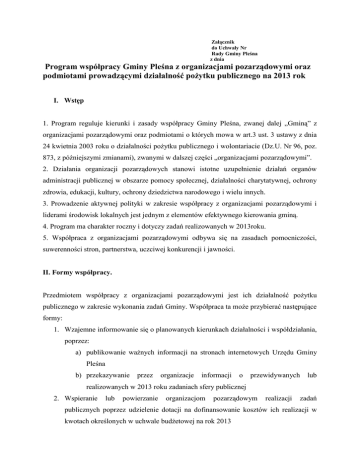 Załącznik do Uchwały Nr Rady Gminy Pleśna z dnia Program współpracy Gminy Pleśna z organizacjami pozarządowymi oraz podmiotami prowadzącymi działalność pożytku publicznego na 2013 rok I. Wstęp 1. Program reguluje kierunki i zasady współpracy Gminy Pleśna, zwanej dalej „Gminą” z organizacjami pozarządowymi oraz podmiotami o których mowa w art.3 ust. 3 ustawy z dnia 24 kwietnia 2003 roku o działalności pożytku publicznego i wolontariacie (Dz.U. Nr 96, poz. 873, z późniejszymi zmianami), zwanymi w dalszej części „organizacjami pozarządowymi”. 2. Działania organizacji pozarządowych stanowi istotne uzupełnienie działań organów administracji publicznej w obszarze pomocy społecznej, działalności charytatywnej, ochrony zdrowia, edukacji, kultury, ochrony dziedzictwa narodowego i wielu innych. 3. Prowadzenie aktywnej polityki w zakresie współpracy z organizacjami pozarządowymi i liderami środowisk lokalnych jest jednym z elementów efektywnego kierowania gminą. 4. Program ma charakter roczny i dotyczy zadań realizowanych w 2013roku. 5. Współpraca z organizacjami pozarządowymi odbywa się na zasadach pomocniczości, suwerenności stron, partnerstwa, uczciwej konkurencji i jawności. II. Formy współpracy. Przedmiotem współpracy z organizacjami pozarządowymi jest ich działalność pożytku publicznego w zakresie wykonania zadań Gminy. Współpraca ta może przybierać następujące formy: 1. Wzajemne informowanie się o planowanych kierunkach działalności i współdziałania, poprzez: a) publikowanie ważnych informacji na stronach internetowych Urzędu Gminy Pleśna b) przekazywanie przez organizacje informacji o przewidywanych lub realizowanych w 2013 roku zadaniach sfery publicznej 2. Wspieranie lub powierzanie organizacjom pozarządowym realizacji zadań publicznych poprzez udzielenie dotacji na dofinansowanie kosztów ich realizacji w kwotach określonych w uchwale budżetowej na rok 2013 3. Tworzenie wspólnych zespołów o charakterze doradczym i inicjatywnym przedstawicieli organizacji pozarządowych i samorządu terytorialnego. III. Podmioty programu współpracy 1. Organizacjami, z którymi współpracuje Samorząd Gminy Pleśna są: Stowarzyszenia a) Galicyjskie Gospodarstwa Gościnne Koło Terenowe w Pleśnej b) Stowarzyszenie Rodzin Katolickich w Lichwinie c) Polski Związek Wędkarski Koło Wędkarskie nr 22 Pleśna CERTA 1.2.Kluby Sportowe a) Ludowy Klub Sportowy „Pogórze” Pleśna b) Ludowy Klub Sportowy „Świebodzin” w Świebodzinie c) Klub Sportowy „KS Rzuchowa” w Rzuchowej d) Uczniowski Klub Sportowy „Herkules” w Janowicach e) Uczniowski Klub Sportowy „Iskra” w Lichwinie f) Uczniowski Klub Sportowy w Pleśnej g) Uczniowski Klub Sportowy „OMEGA” w Rzuchowej 1.3 . Organizacje działające w ramach związków wyznaniowych (np. parafie, grupy charytatywne, zakłady opiekuńcze) a) oddział „Caritas” przy Parafii p.w. Wniebowzięcia Najświętszej Marii Panny w Pleśnej b) oddział „Caritas” przy Parafii p.w. Ducha Świętego w Rzuchowej c) oddział „Caritas” przy Parafii p.w. Świętego Maksymiliana Marii Kolbe w Świebodzinie d) oddział „Caritas” przy Parafii p.w. Niepokalanego Serca Matki Bożej w Szczepanowicach e) oddział „Caritas” przy Parafii p.w. Podwyższenia Krzyża Świętego w Janowicach f) oddział „Caritas” przy Parafii p.w. Najświętszego Serca Jezusowego w Lichwinie 1.4. Ochotnicze Straże Pożarne ( w zakresie nie objętym utrzymaniem gotowości bojowej) : a) Ochotnicza Straż Pożarna w Janowicach b) Ochotnicza Straż Pożarna w Lichwinie c) Ochotnicza Straż Pożarna w Rzuchowej d) Ochotnicza Straż Pożarna w Pleśnej e) Ochotnicza Straż Pożarna w Szczepanowicach f) Ochotnicza Straż Pożarna w Lubince 1.5. Związek rolników, kół i organizacji Rolniczych- Koło Gospodyń Wiejskich. 2. Program współpracy dotyczy organizacji pozarządowych podmiotów prowadzących działalność pożytku publicznego na terenie Gminy Pleśna ( bez względu na siedzibę), nie działających w celu osiągnięcia zysku. IV. Przedmiot współpracy. Przedmiotem współpracy Gminy Pleśna z organizacjami pozarządowymi i podmiotami prowadzącymi działalność pożytku publicznego jest realizacja zadań publicznych w sferze: a) sportu, rekreacji, kultury fizycznej i turystyki b) profilaktyki i ochrony zdrowia c) kultury i ochrony dziedzictwa narodowego d) promocji gminy V. Współpraca w pozyskiwaniu środków z innych źródeł. 1. Samorząd Gminy Pleśna będzie pomagał podmiotom prowadzącym działalność pożytku publicznego w pozyskiwaniu środków z innych niż budżet gminy źródeł finansowania. Dzięki tej formie współpracy, mogą trafić do gminy środki na realizację programów istotnych z punktu widzenia mieszkańców gminy. Dotyczyć to będzie w szczególności pozyskiwania środków pomocowych z Unii Europejskiej. 2. Pomoc gminy obejmować będzie w miarę możliwości: 1. Informowanie o potencjalnych źródłach finansowania i zasadach udzielania dotacji 2. Opiniowanie wniosków o dotację ze źródeł zewnętrznych 3. Promowanie ciekawych programów mogących uzyskać środki ze źródeł zewnętrznych 4. Współfinansowanie projektów, których realizacja związana będzie z pozyskaniem środków pochodzących z Unii Europejskiej. VI. Zlecania realizacji zadań publicznych. 1. Wspieranie bądź powierzanie realizacji zadania publicznego odbywać się będzie po przeprowadzeniu otwartego konkursu ofert, który ogłasza Wójt Gminy Pleśna z 21 dniowym wyprzedzeniem. 2. Ogłaszając otwarty konkurs ofert w celu zlecenia zadań publicznych organizacjom pozarządowym Wójt Gminy Pleśna opublikuje informację o nim: a) w Biuletynie Informacji Publicznej b) w siedzibie Urzędu Gminy Pleśna na tablicy ogłoszeń c) na stronie internetowej Urzędu Gminy Pleśna 3. Otwarte konkursy ofert są ogłaszane i przeprowadzane w oparciu o przepisy ustawy i wydanyc