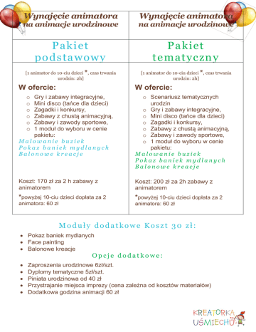 Wynajęcie animatora Wynajęcie animatora na animacje urodzinowe na animacje urodzinowe Pakiet podstawowy Pakiet tematyczny [1 animator do 10-ciu dzieci *, czas trwania urodzin: 2h] [1 animator do 10-ciu dzieci *, czas trwania urodzin: 2h] W ofercie: W ofercie: o o o o o Gry i zabawy integracyjne, Mini disco (tańce dla dzieci) Zagadki i konkursy, Zabawy z chustą animacyjną, Zabawy i zawody sportowe, o 1 moduł do wyboru w cenie pakietu: Malowanie buziek Pokaz baniek mydlanych Balonowe kreacje o Scenariusz tematycznych urodzin o Gry i zabawy integracyjne, o Mini disco (tańce dla dzieci) o Zagadki i konkursy, o Zabawy z chustą animacyjną, o Zabawy i zawody sportowe, o 1 moduł do wyboru w cenie pakietu: Malowanie buziek Pokaz baniek mydlanych Balonowe kreacje Koszt: 170 zł za 2 h zabawy z animatorem Koszt: 200 zł za 2h zabawy z animatorem *powyżej 10-ciu dzieci dopłata za 2 *powyżej 10-ciu dzieci dopłata za 2 animatora: 60 zł animatora: 60 zł Moduły dodatkowe Koszt 30 zł: Pokaz baniek mydlanych Face painting Balonowe kreacje Opcje dodatkowe: Zaproszenia urodzinowe 6zł/szt. Dyplomy tematyczne 5zł/szt. Piniata urodzinowa od 40 zł Przystrajanie miejsca imprezy (cena zależna od kosztów materiałów) Dodatkowa godzina animacji 60 zł