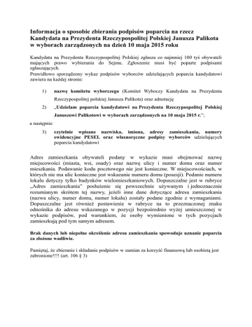 Informacja o sposobie zbierania podpisów poparcia na rzecz Kandydata na Prezydenta Rzeczypospolitej Polskiej Janusza Palikota w wyborach zarządzonych na dzień 10 maja 2015 roku Kandydata na Prezydenta Rzeczypospolitej Polskiej zgłasza co najmniej 100 tyś obywateli mających prawo wybierania do Sejmu. Zgłoszenie musi być poparte podpisami zgłaszających. Prawidłowo sporządzony wykaz podpisów wyborców udzielających poparcia kandydatowi zawiera na każdej stronie: 1) nazwę komitetu wyborczego (Komitet Wyboczy Kandydata na Prezydenta Rzeczypospolitej polskiej Janusza Palikota) oraz adnotację 2) „Udzielam poparcia kandydatowi na Prezydenta Rzeczypospolitej Polskiej Januszowi Palikotowi w wyborach zarządzonych na 10 maja 2015 r.”; a następnie 3) czytelnie wpisane nazwiska, imiona, adresy zamieszkania, numery ewidencyjne PESEL oraz własnoręczne podpisy wyborców udzielających poparcia kandydatowi Adres zamieszkania obywateli podany w wykazie musi obejmować nazwę miejscowości (miasta, wsi, osady) oraz nazwę ulicy i numer domu oraz numer mieszkania. Podawanie kodu pocztowego nie jest konieczne. W miejscowościach, w których nie ma ulic konieczne jest wskazanie numeru domu (posesji). Podanie numeru lokalu dotyczy tylko budynków wielomieszkaniowych. Dopuszczalne jest w rubryce „Adres zamieszkania” posłużenie się powszechnie używanym i jednoznacznie rozumianym skrótem tej nazwy, jeżeli inne dane dotyczące adresu zamieszkania (nazwa ulicy, numer domu, numer lokalu) zostały podane zgodnie z wymaganiami. Dopuszczalne jest również postawienie w rubryce na to przeznaczonej znaku odnośnika do adresu wskazanego w pozycji bezpośrednio wyżej umieszczonej w wykazie podpisów, pod warunkiem, że osoby wymienione w tych pozycjach zamieszkują pod tym samym adresem. Brak danych lub niepełne określenie adresu zamieszkania spowoduje uznanie poparcia za złożone wadliwie. Pamiętaj, że zbieranie i składanie podpisów w zamian za korzyść finansową lub osobistą jest zabronione!!!! (art. 106 § 3)